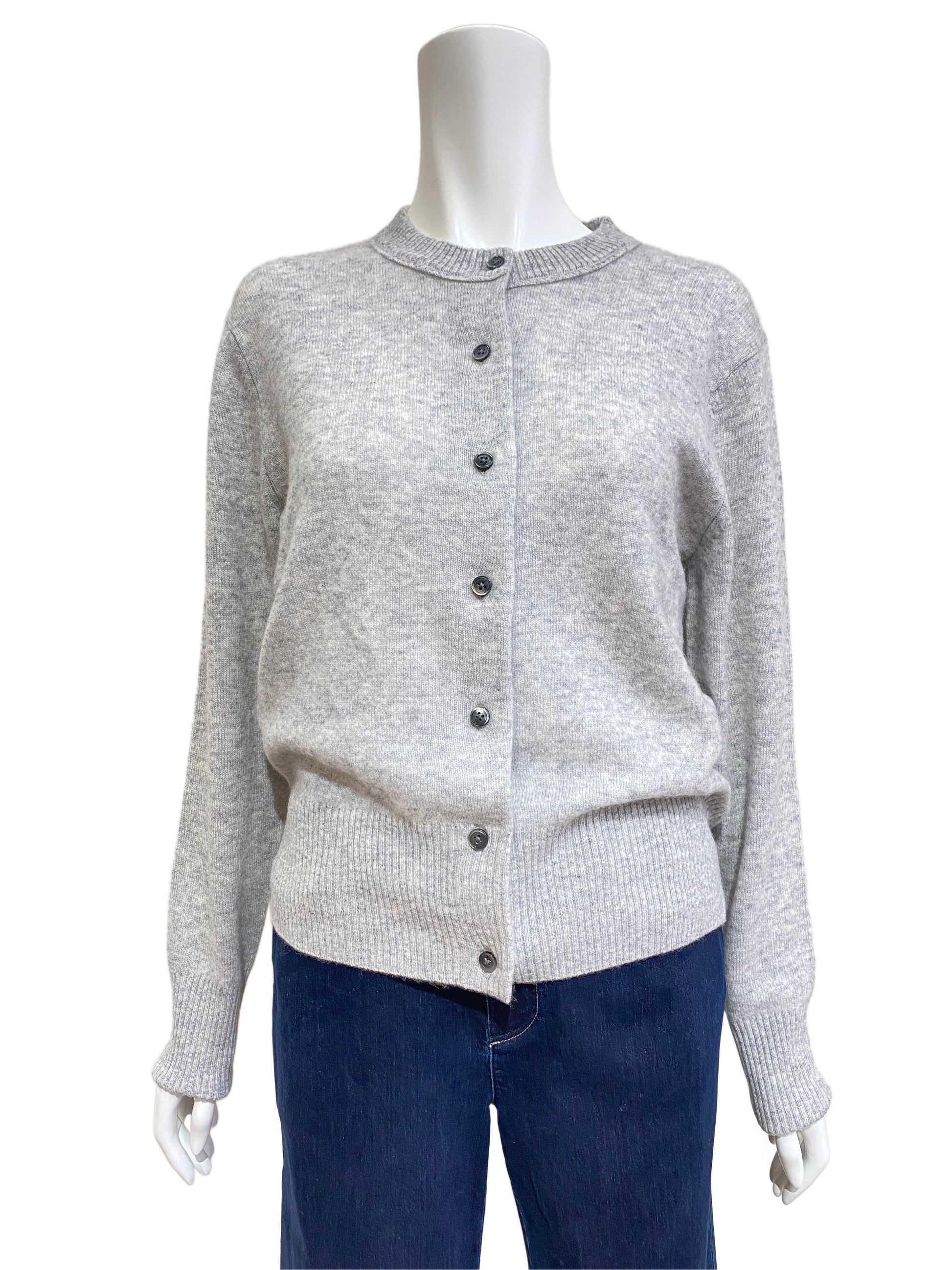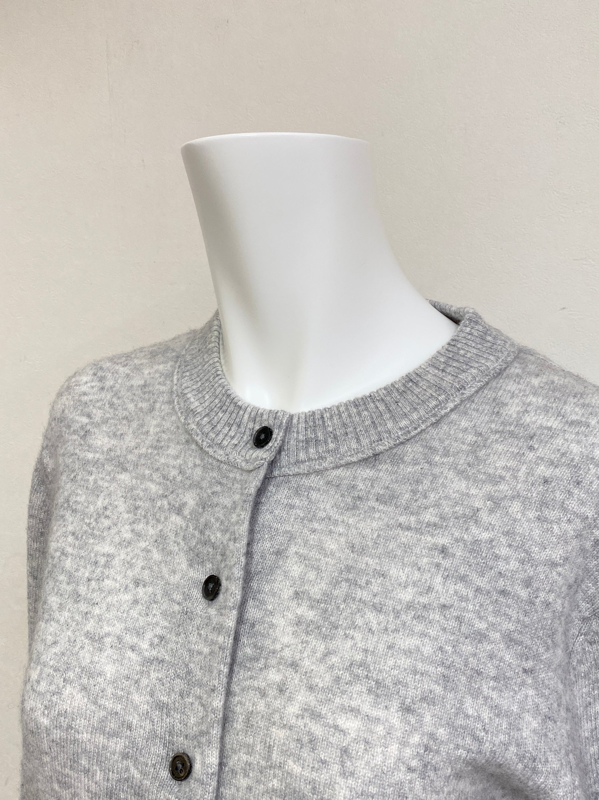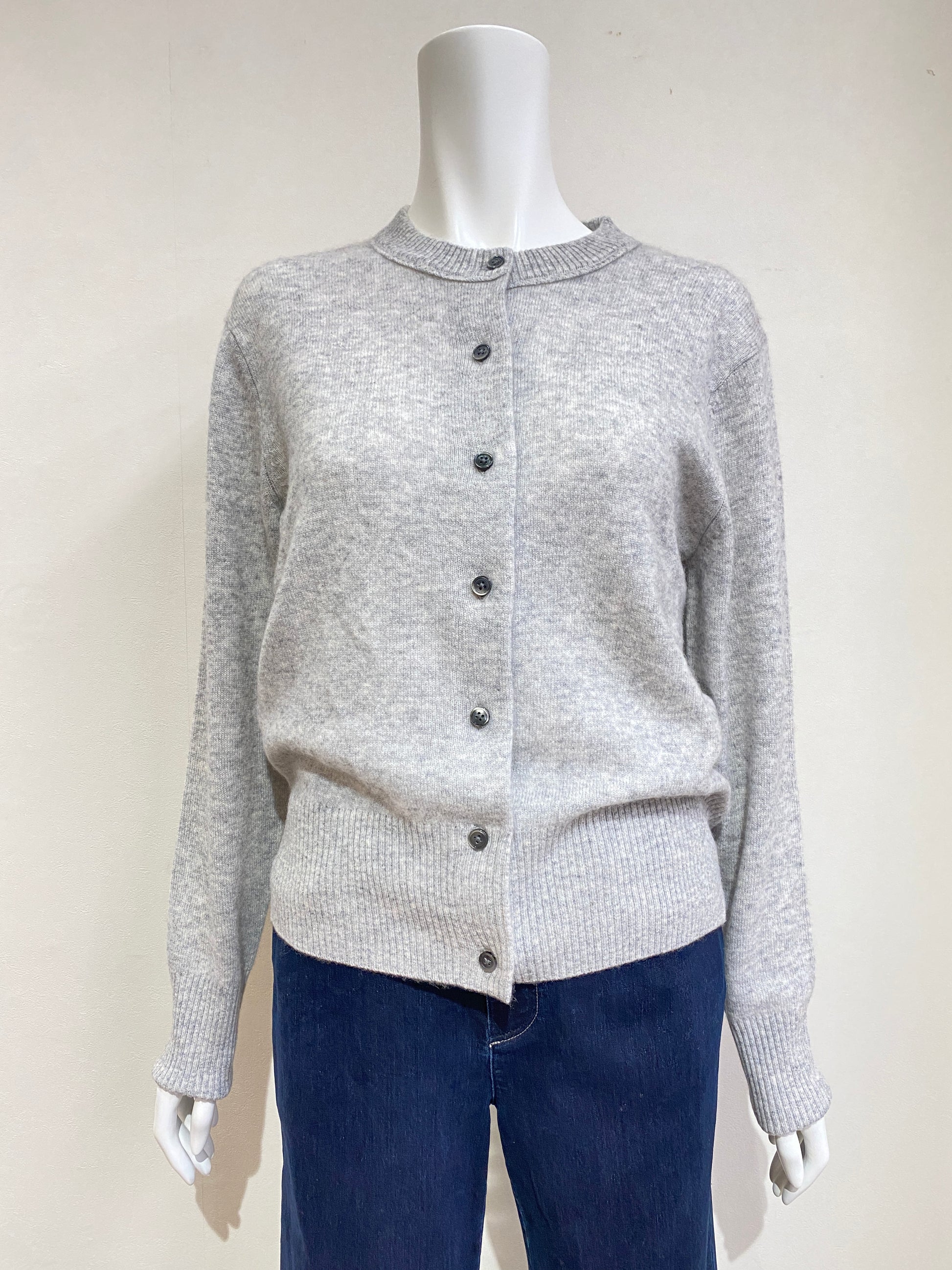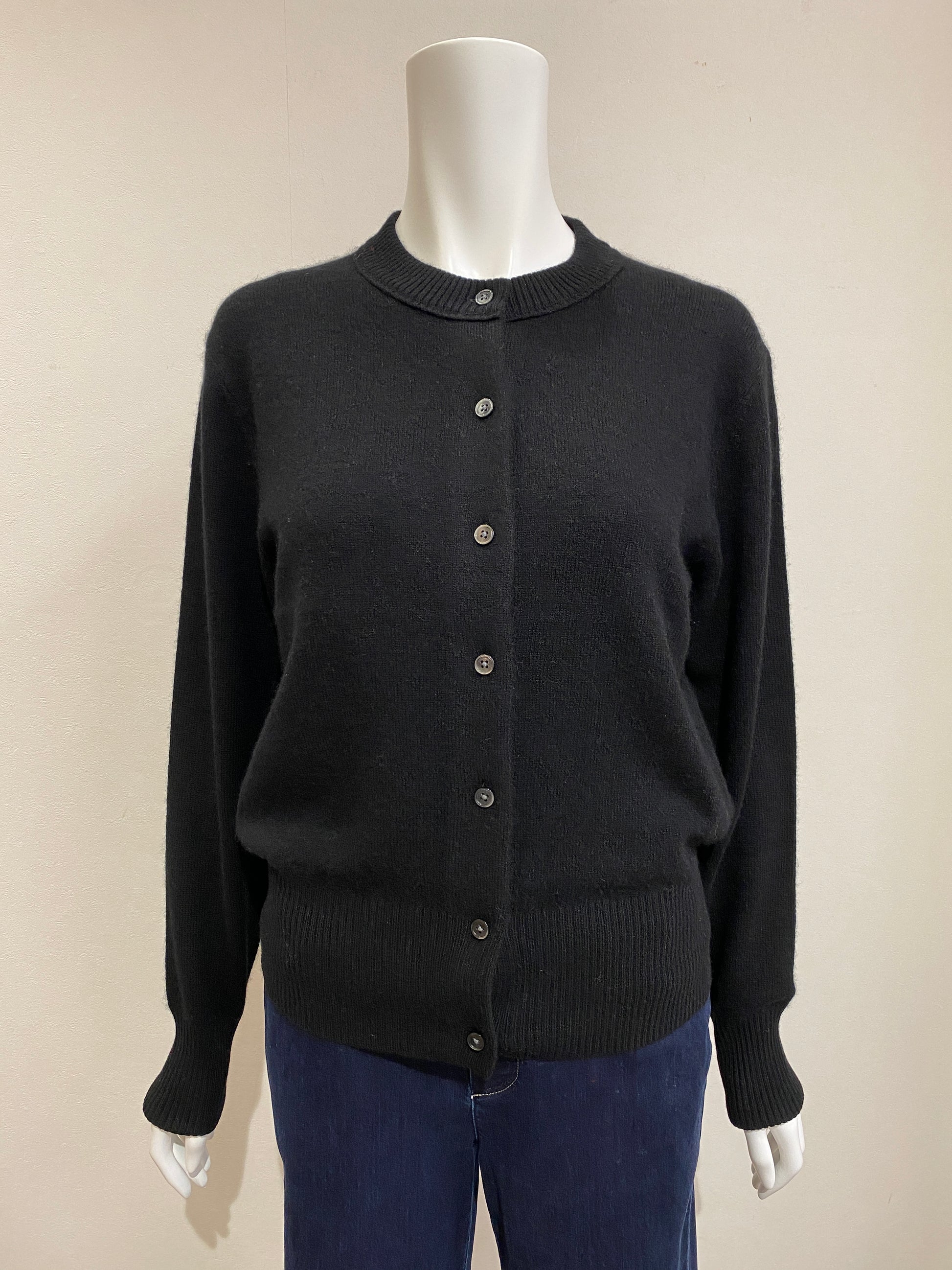 カシミヤのなめらかな肌触りのカーディガン。クルーネックなので、ボタンを閉めて1枚でも着られます。