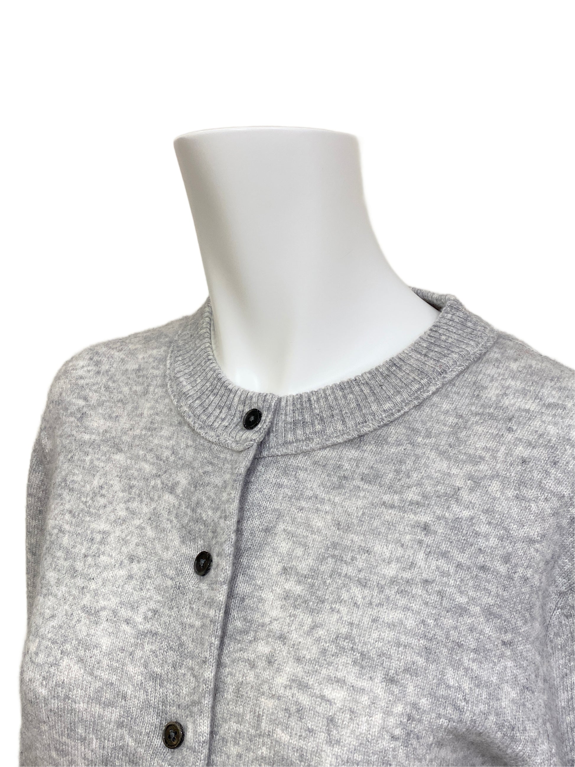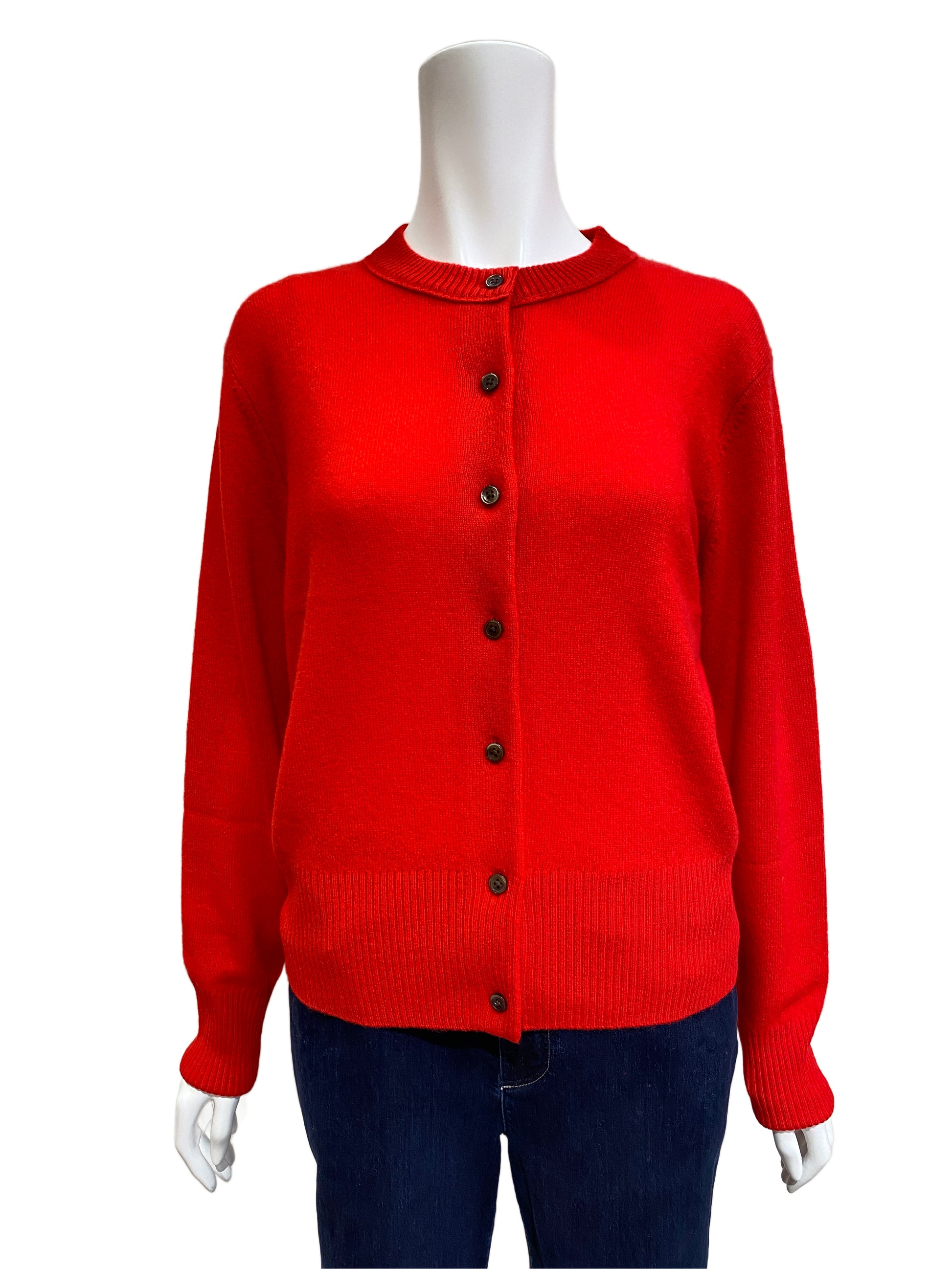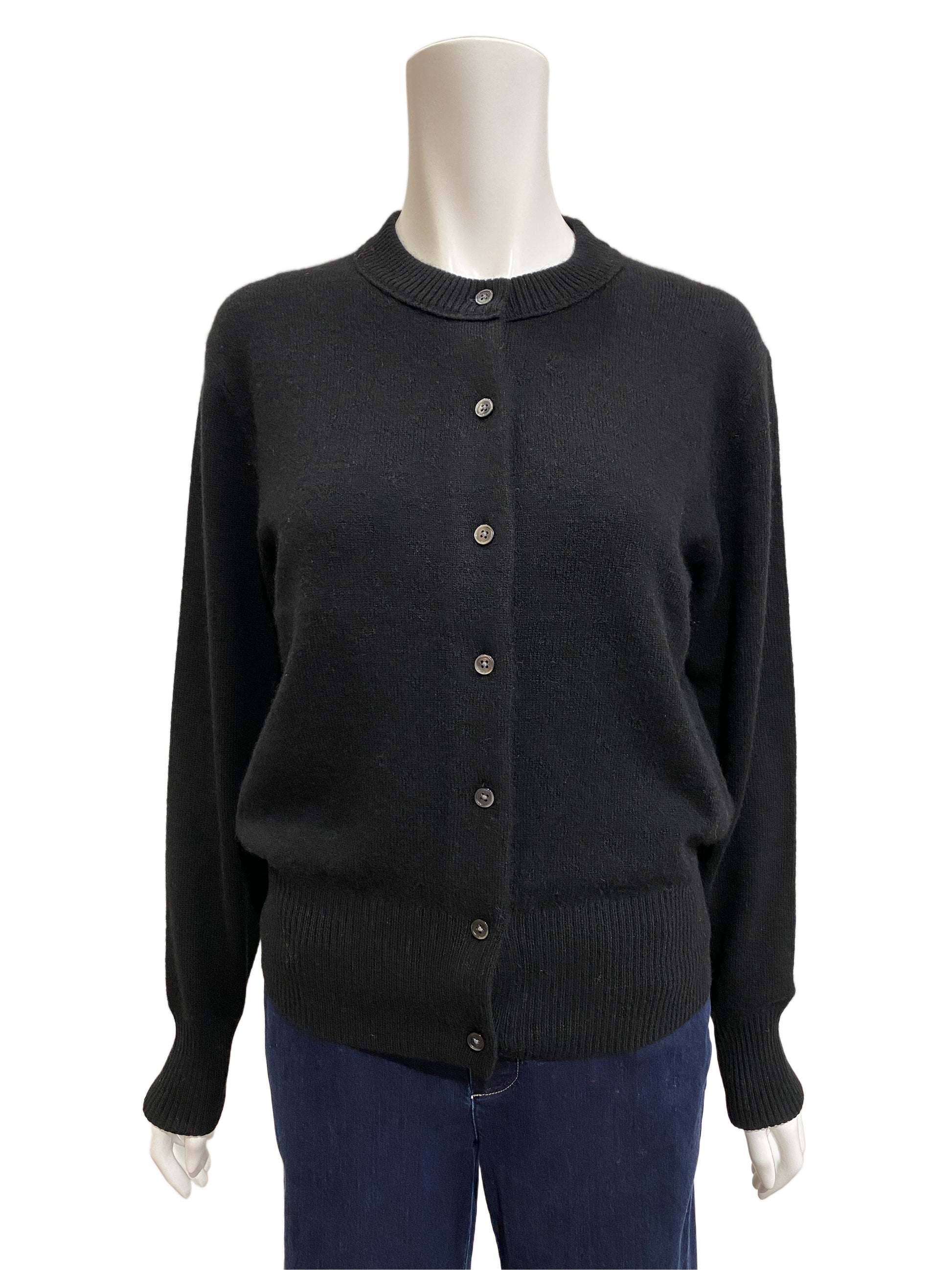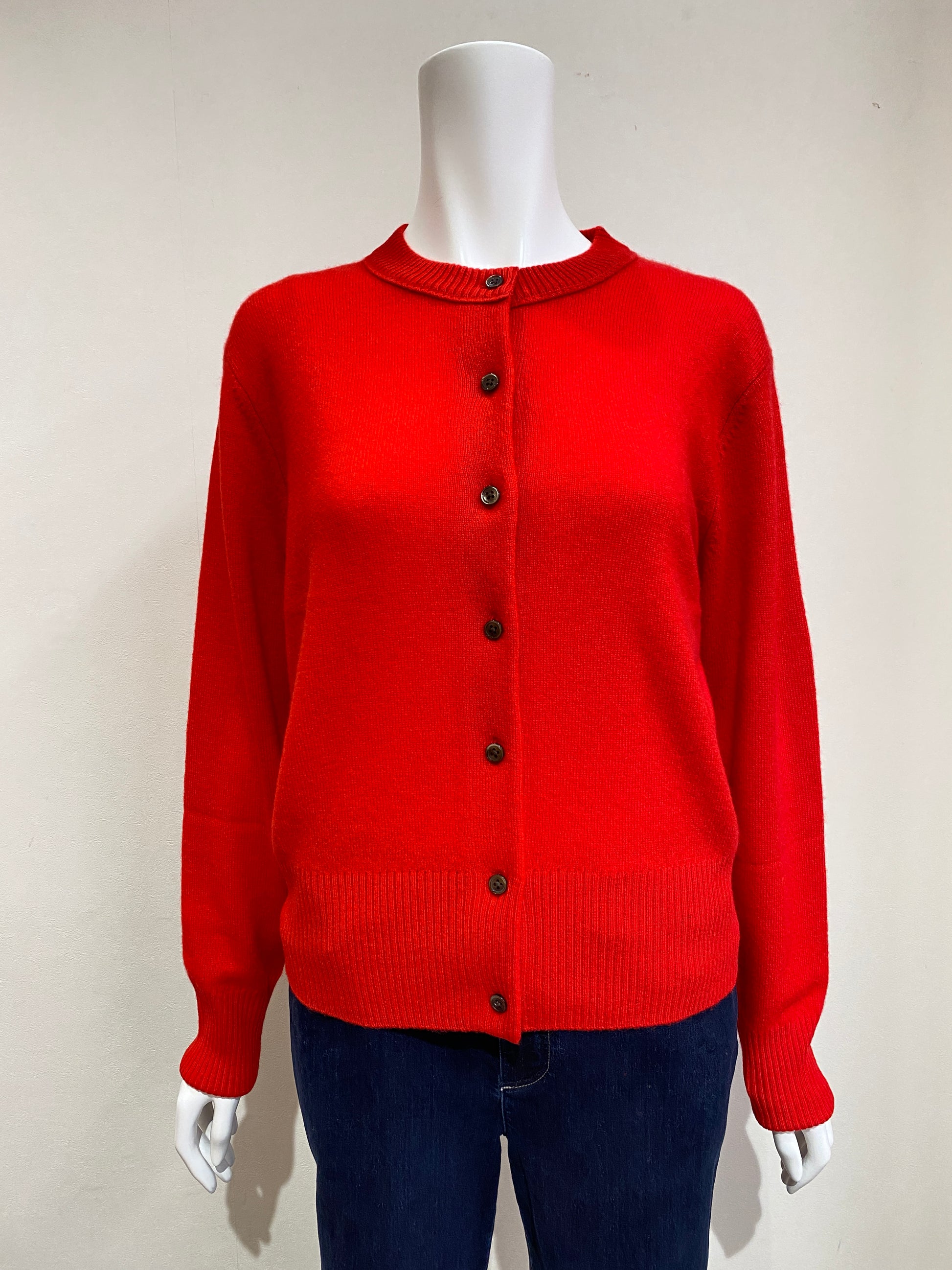 カシミヤのなめらかな肌触りのカーディガン。クルーネックなので、ボタンを閉めて1枚でも着られます。