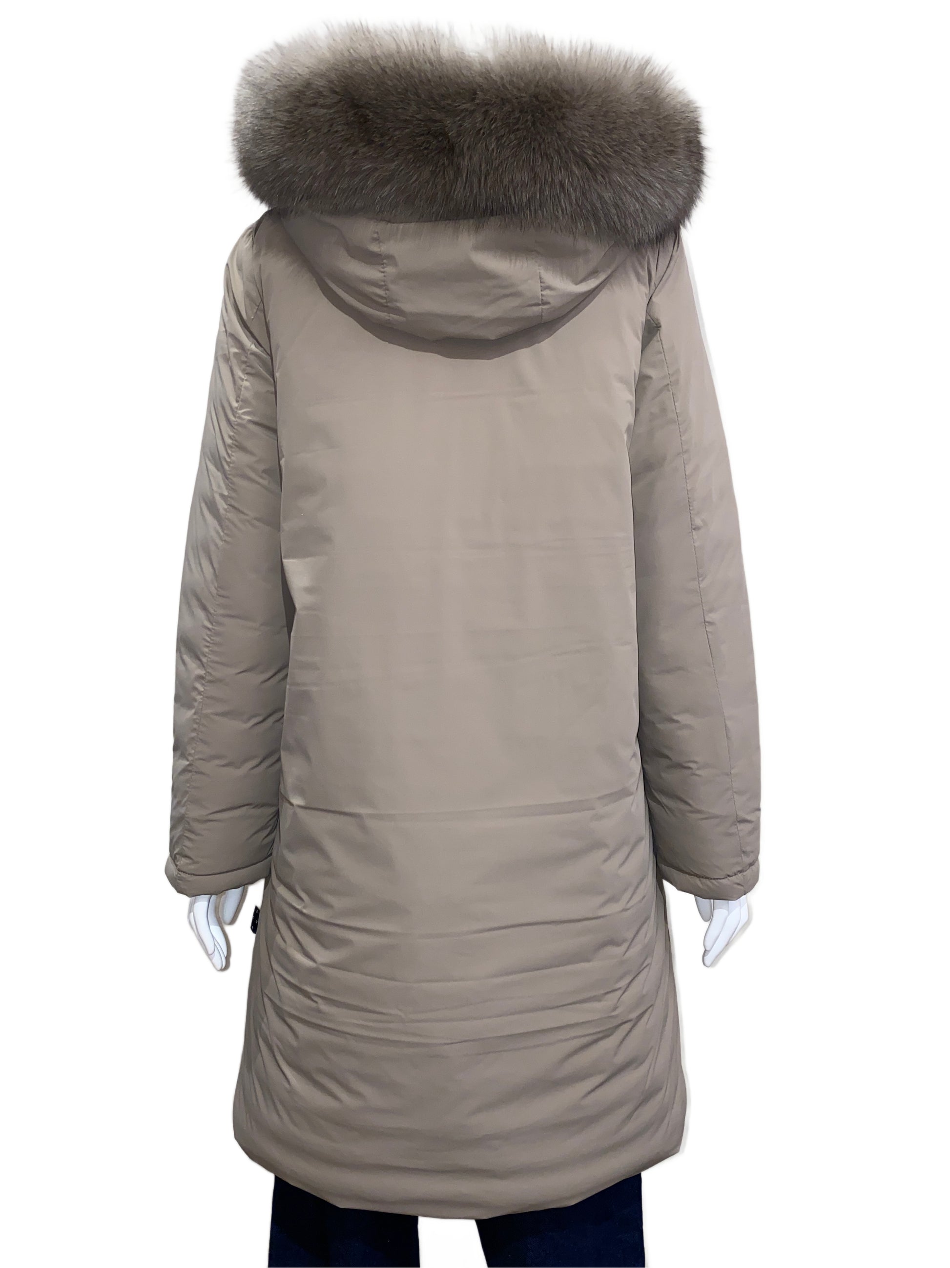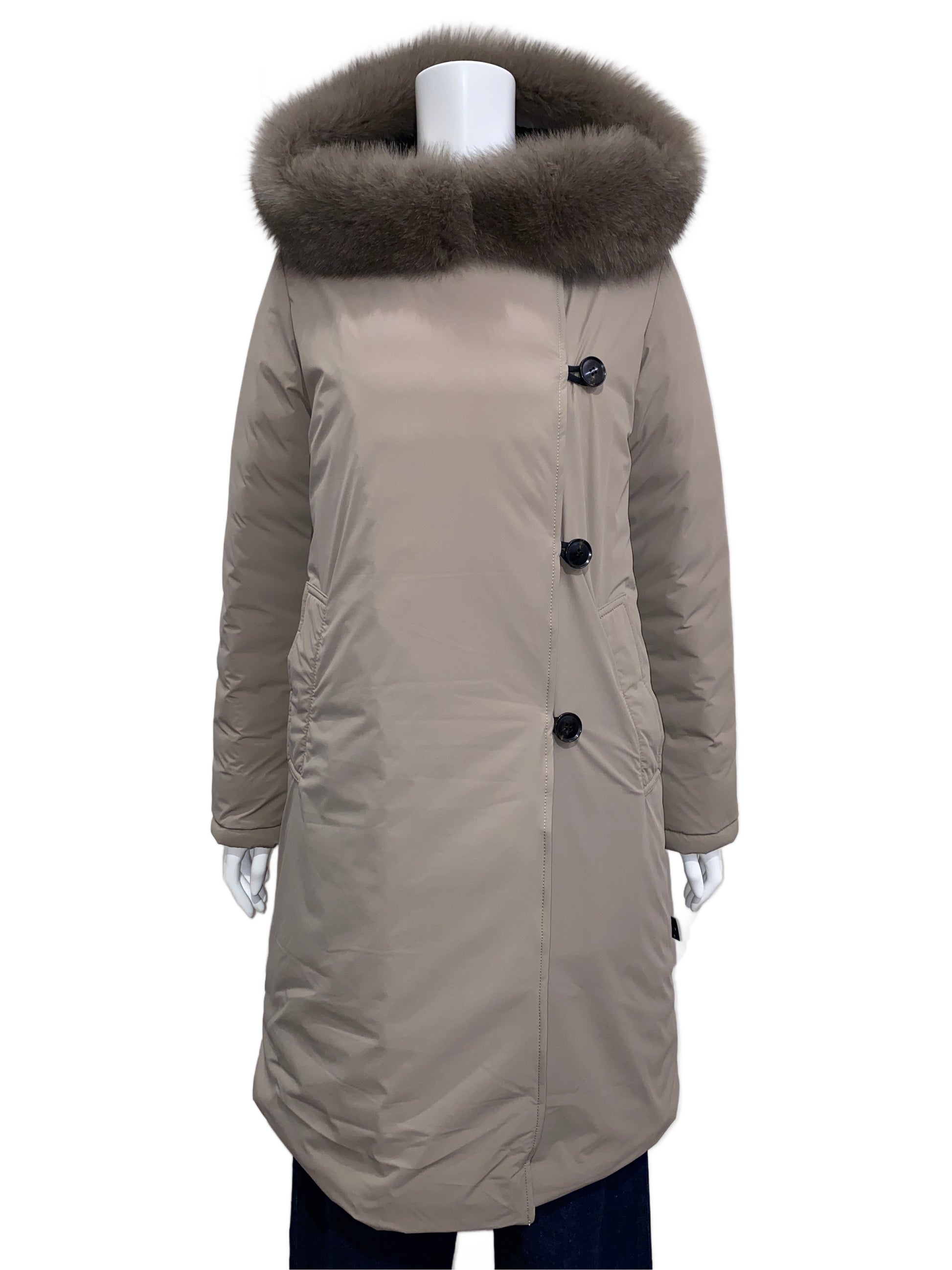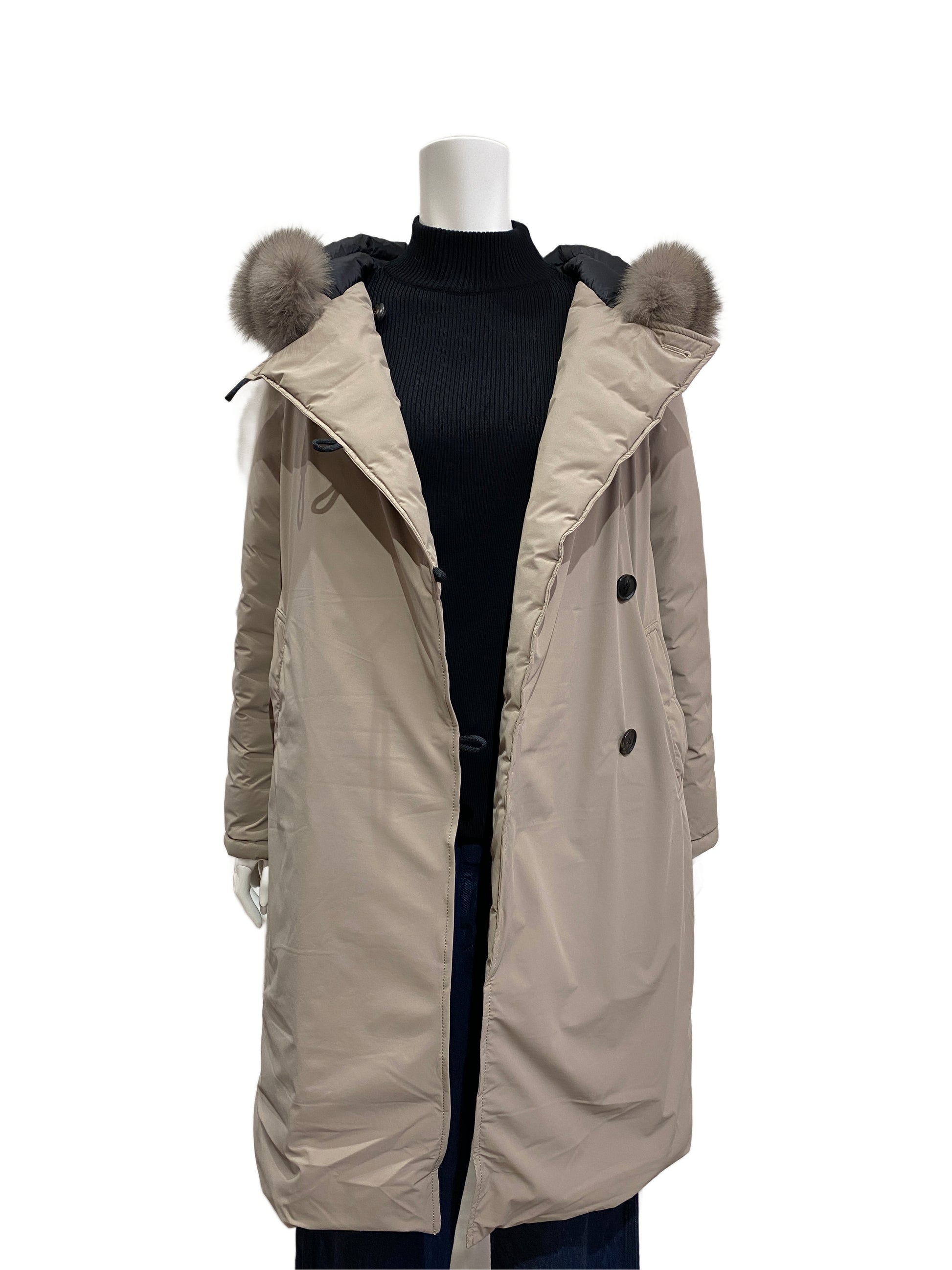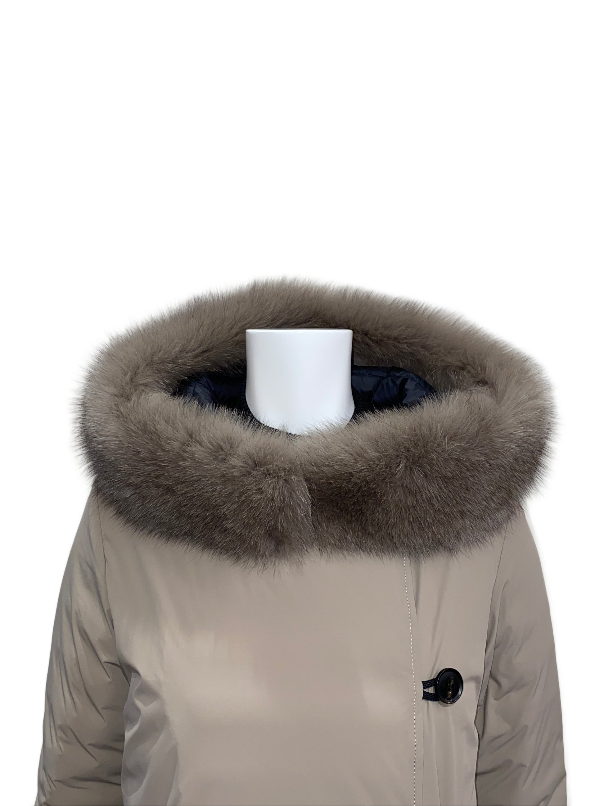 上品な微光沢を纏った新素材と、計算し尽くされたAラインシルエット。ミリタリーの力強さとFOXファーのエレガンスが同居する、膝丈フーデッドダウンコートです。