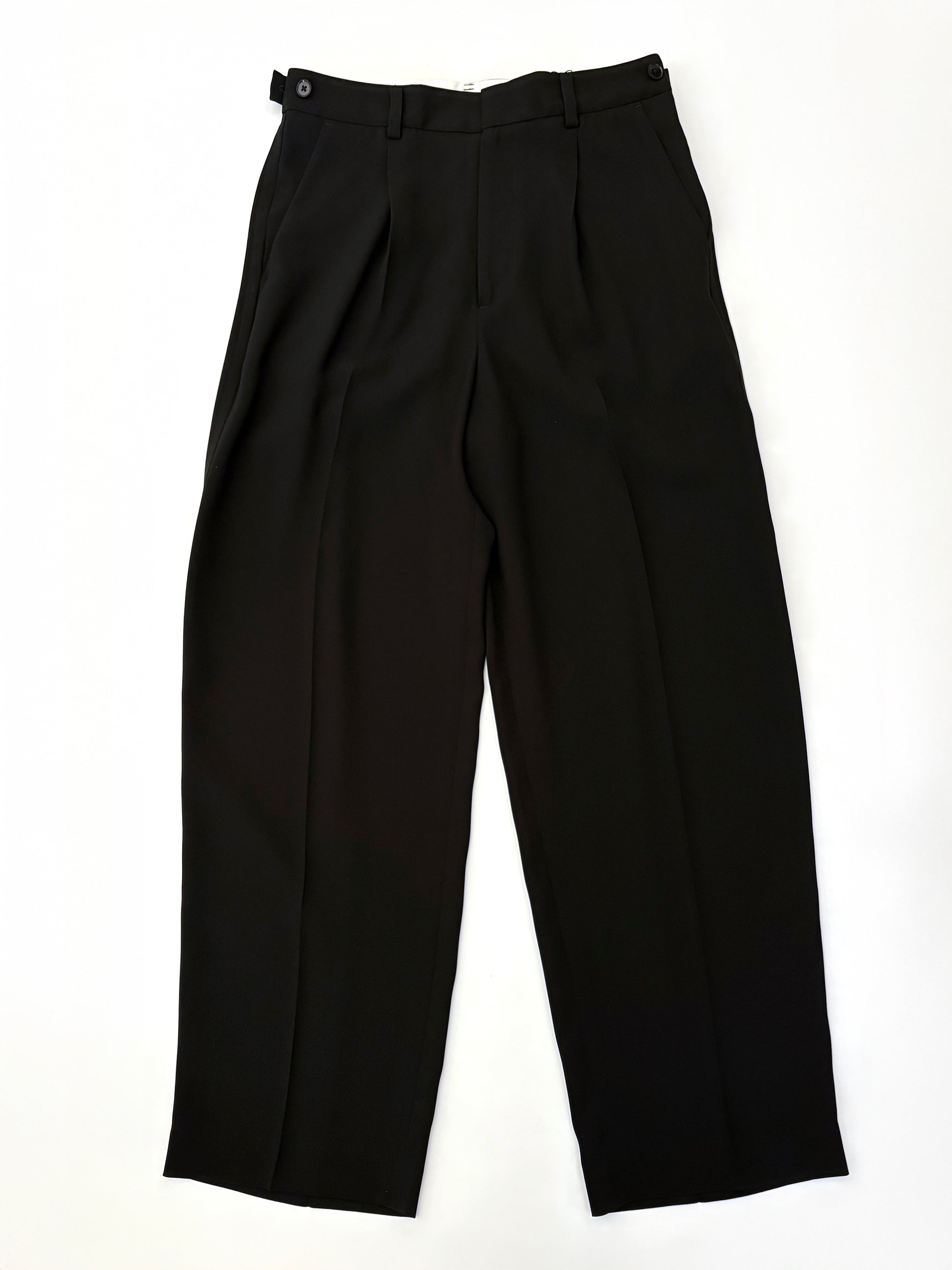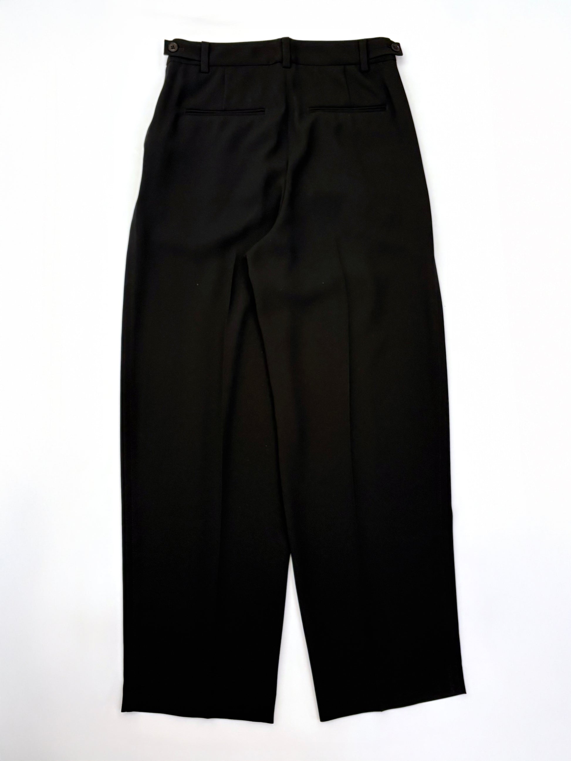 タックとテーパードシルエット、とろみがあり女性らしくもマニッシュにも着れてコーデ万能選手です。ウエスト調整可能、オンオフ幅広く活躍する万能パンツ。