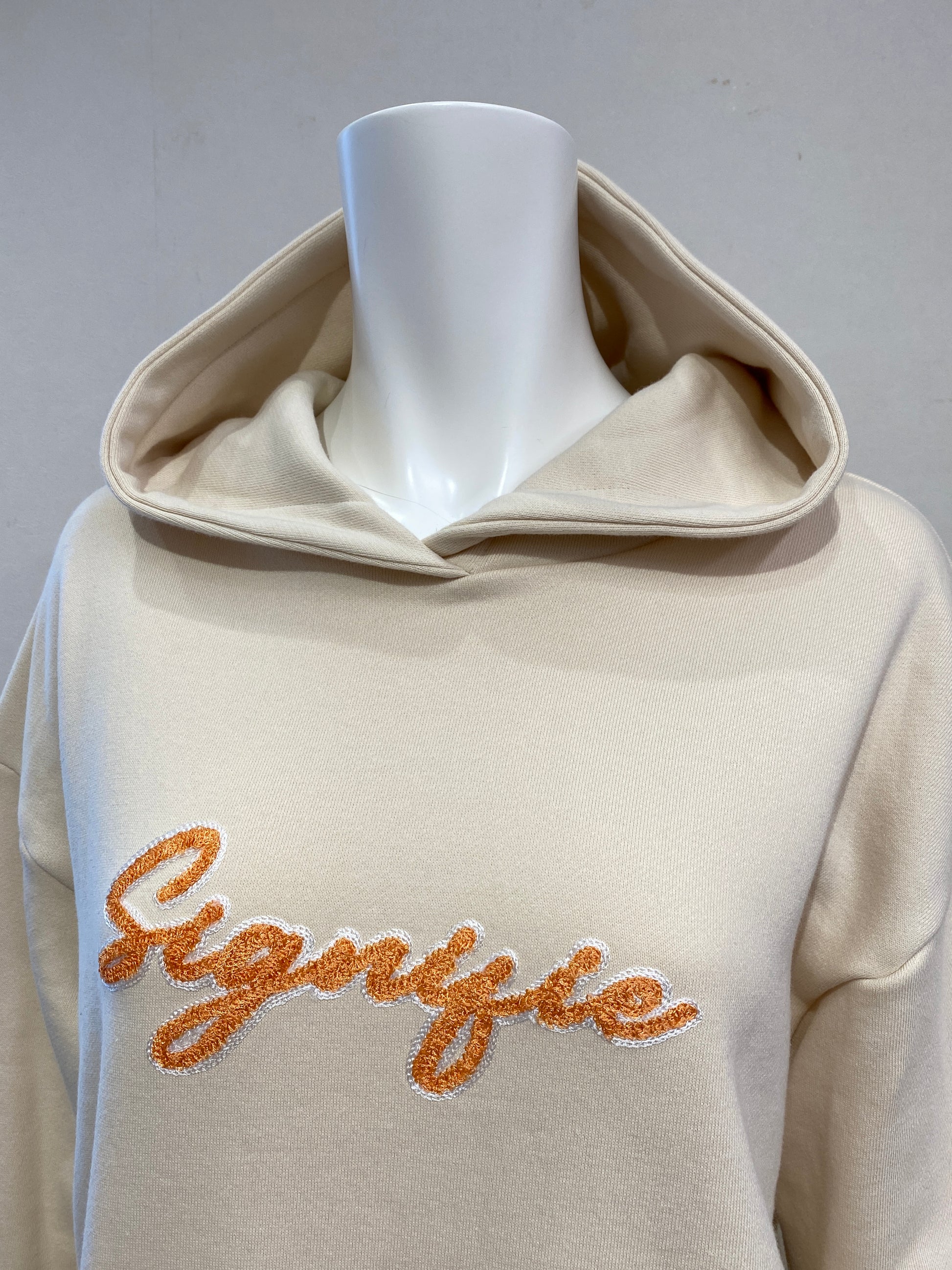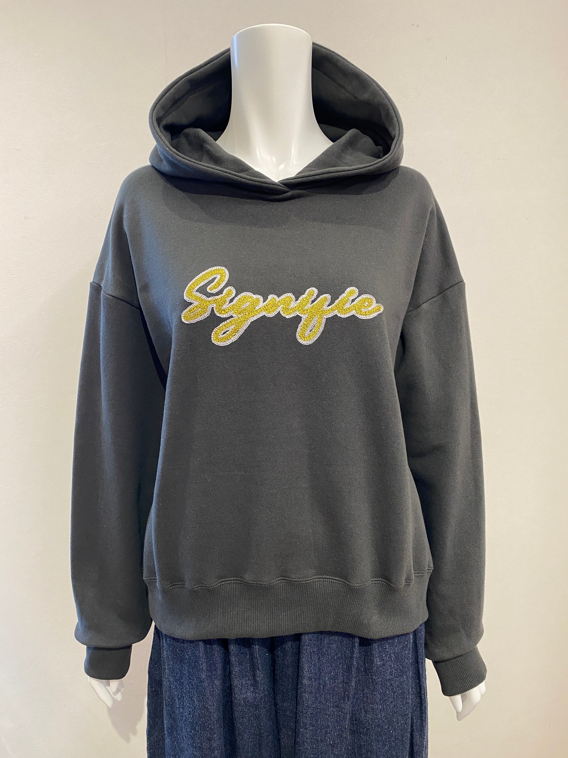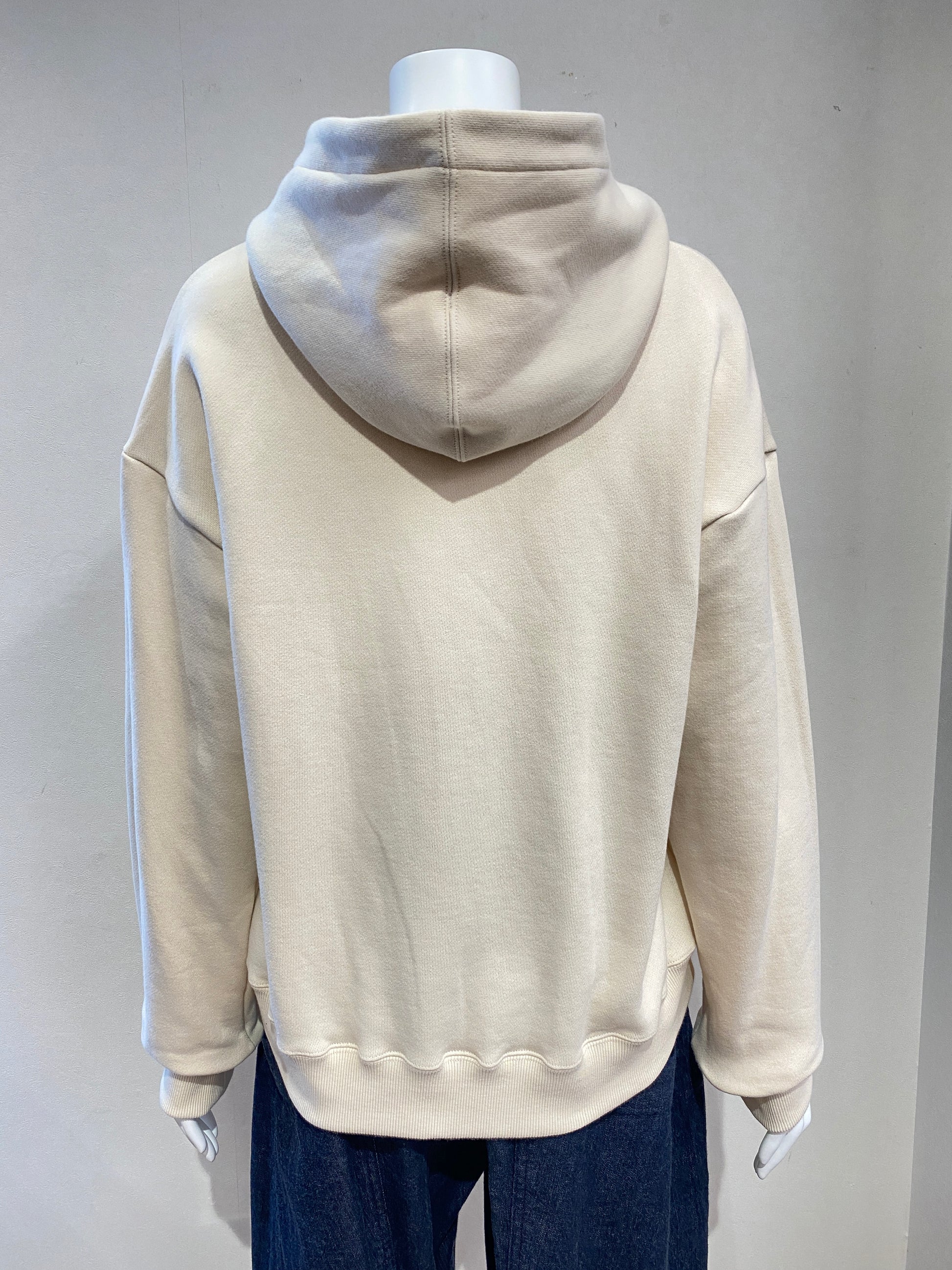 フロントの刺繍がワンポイントのフード付きプルオーバー。スタイルアップして見えるコンパクトな丈感。合わせるボトムも選ばない万能トップス。