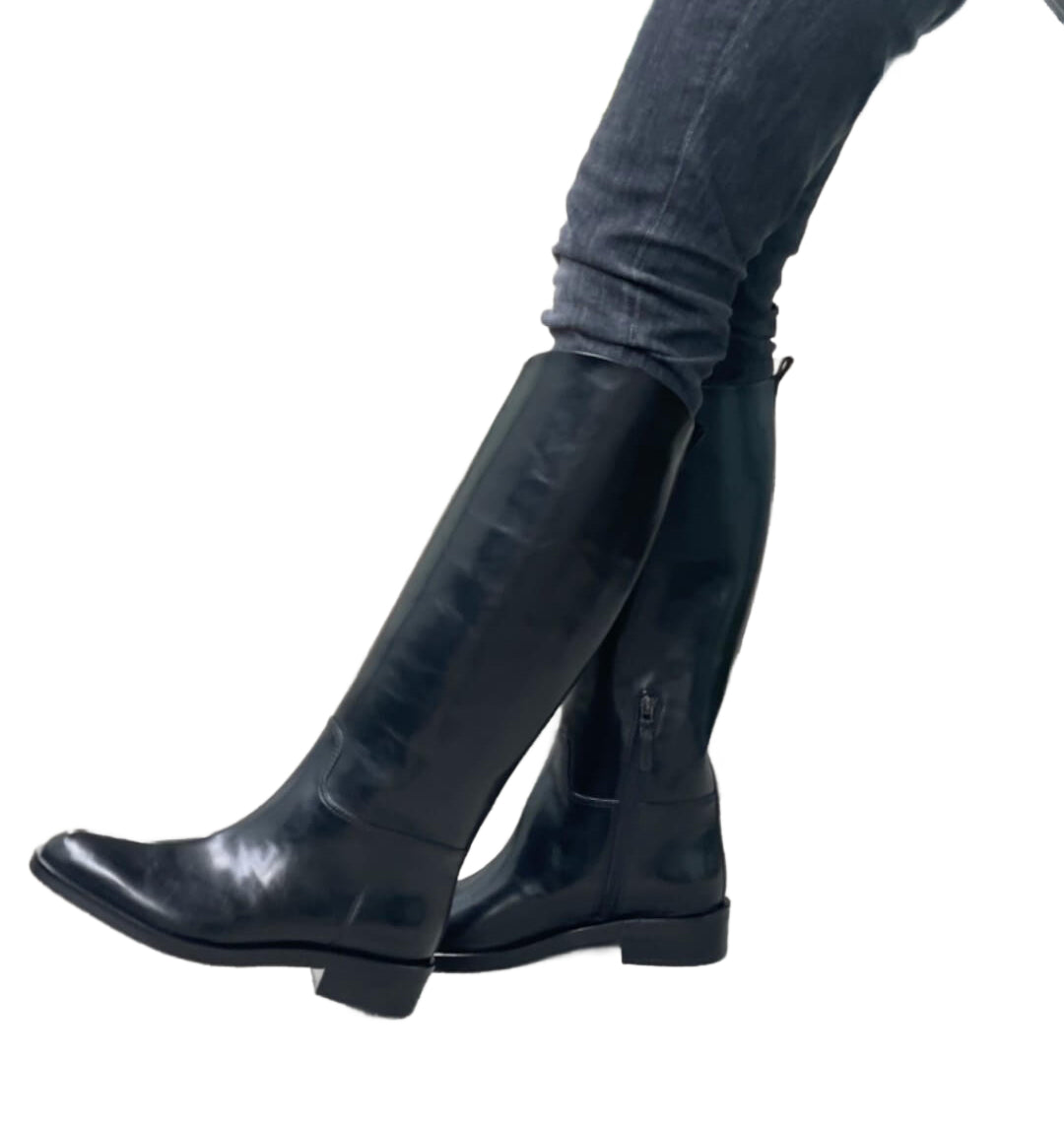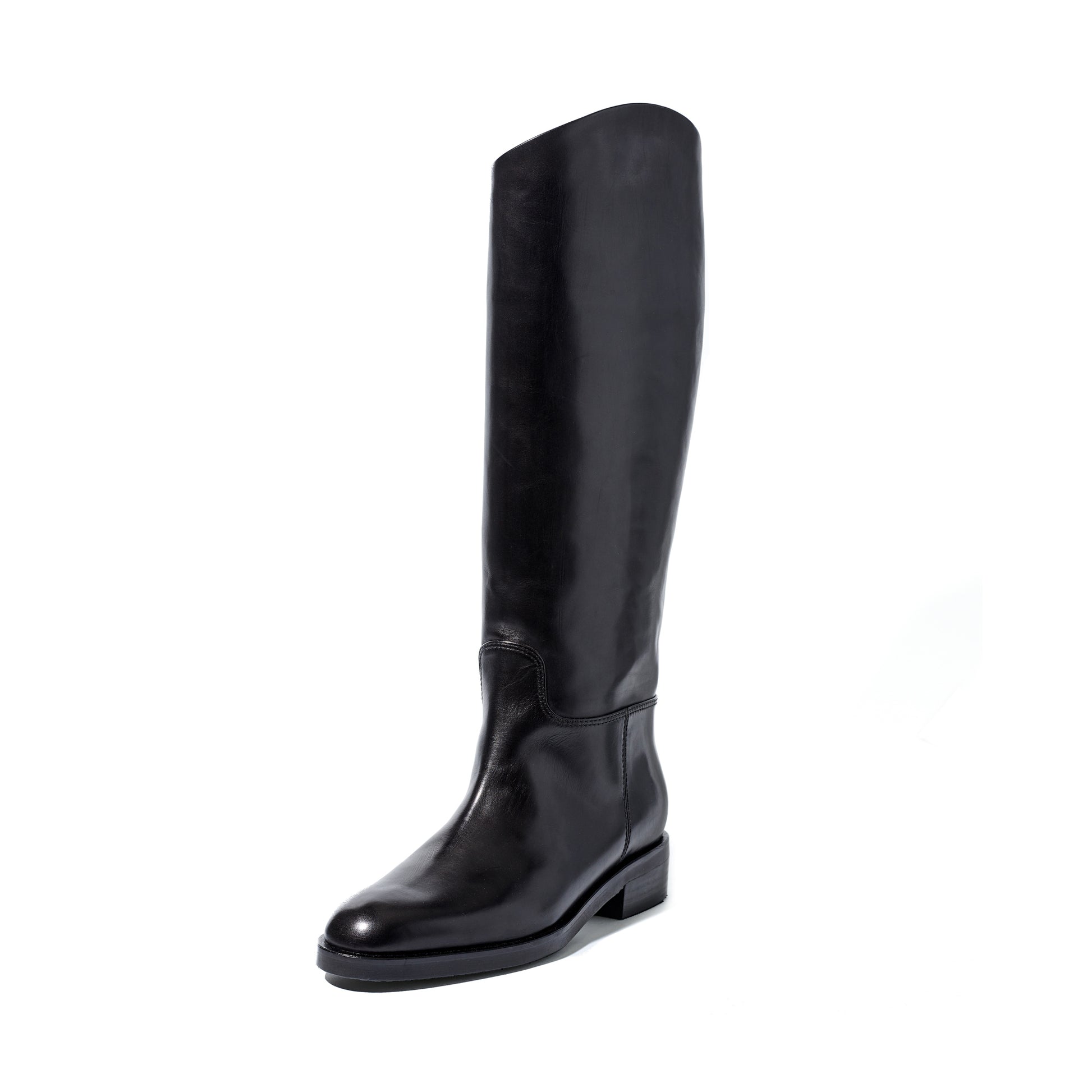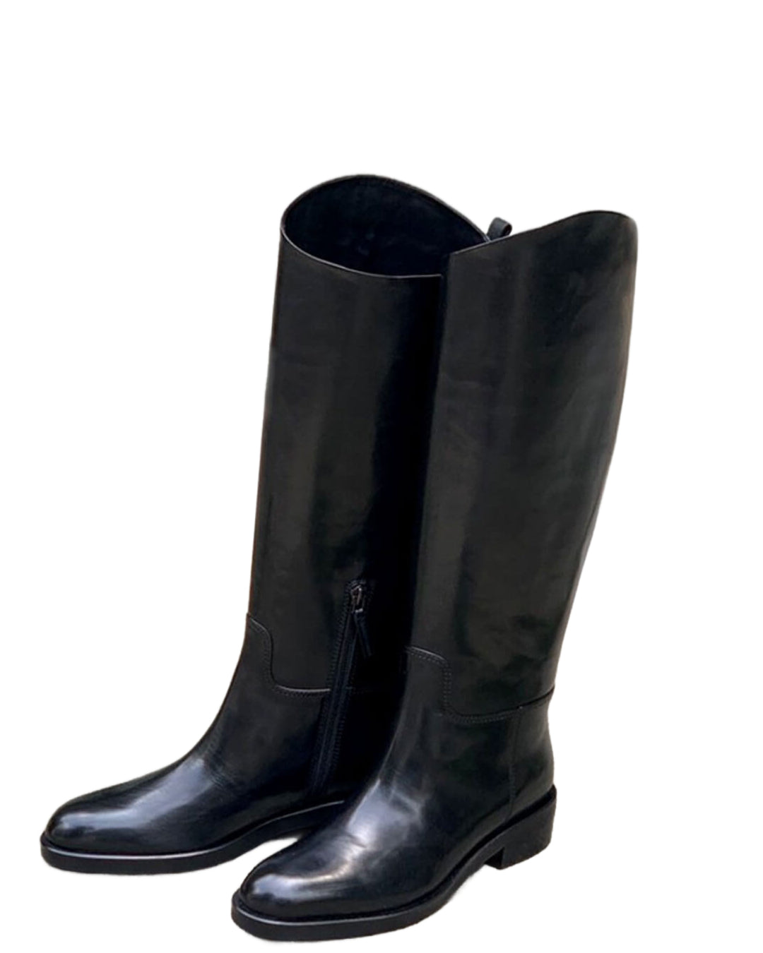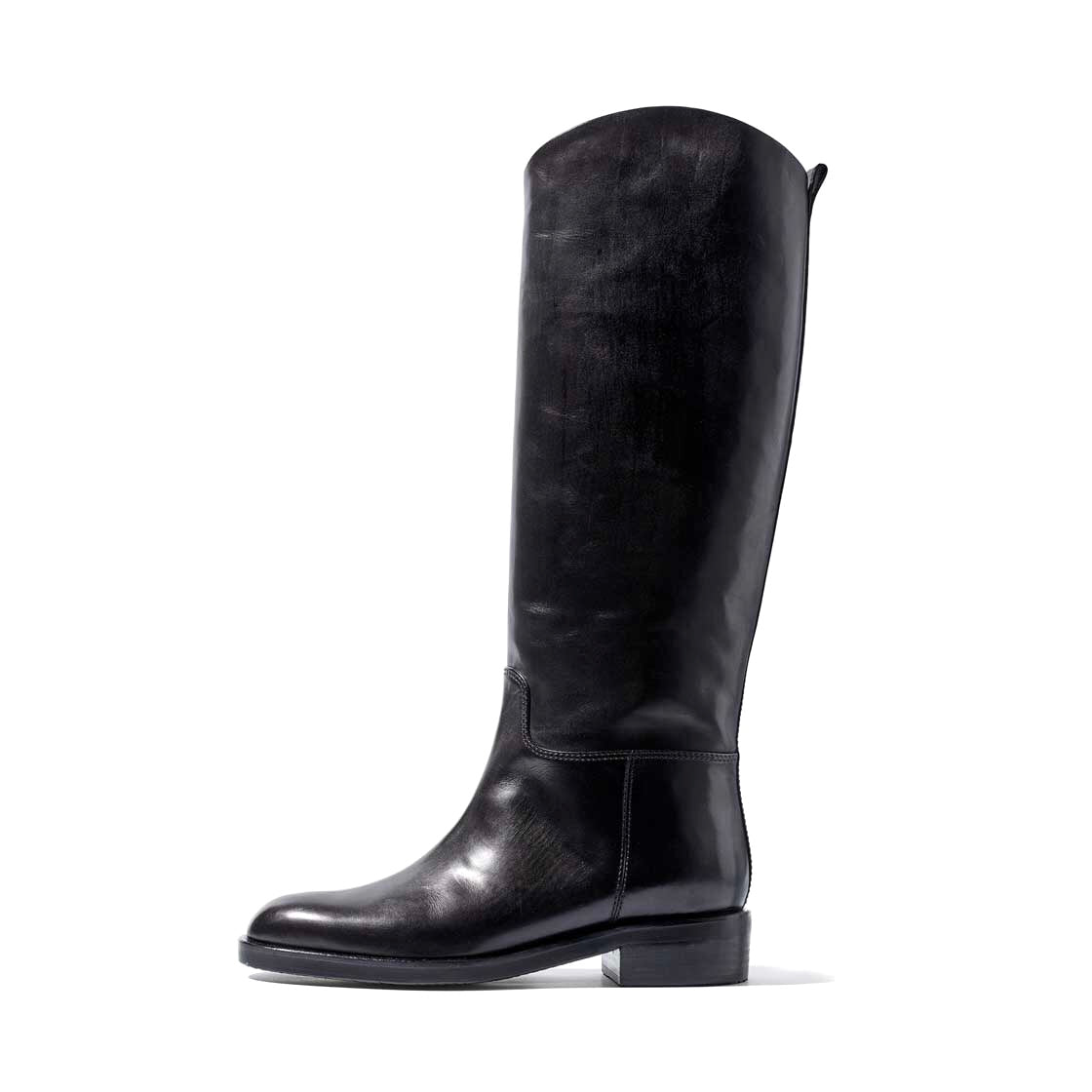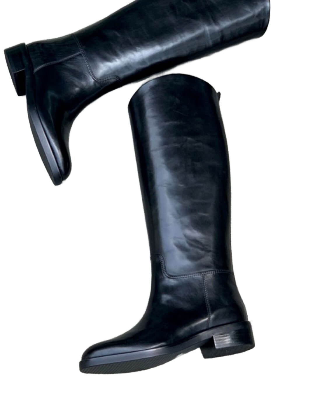 上品な艶とシャープなラインが際立つ、ミニマルデザインのレザーロングブーツ。