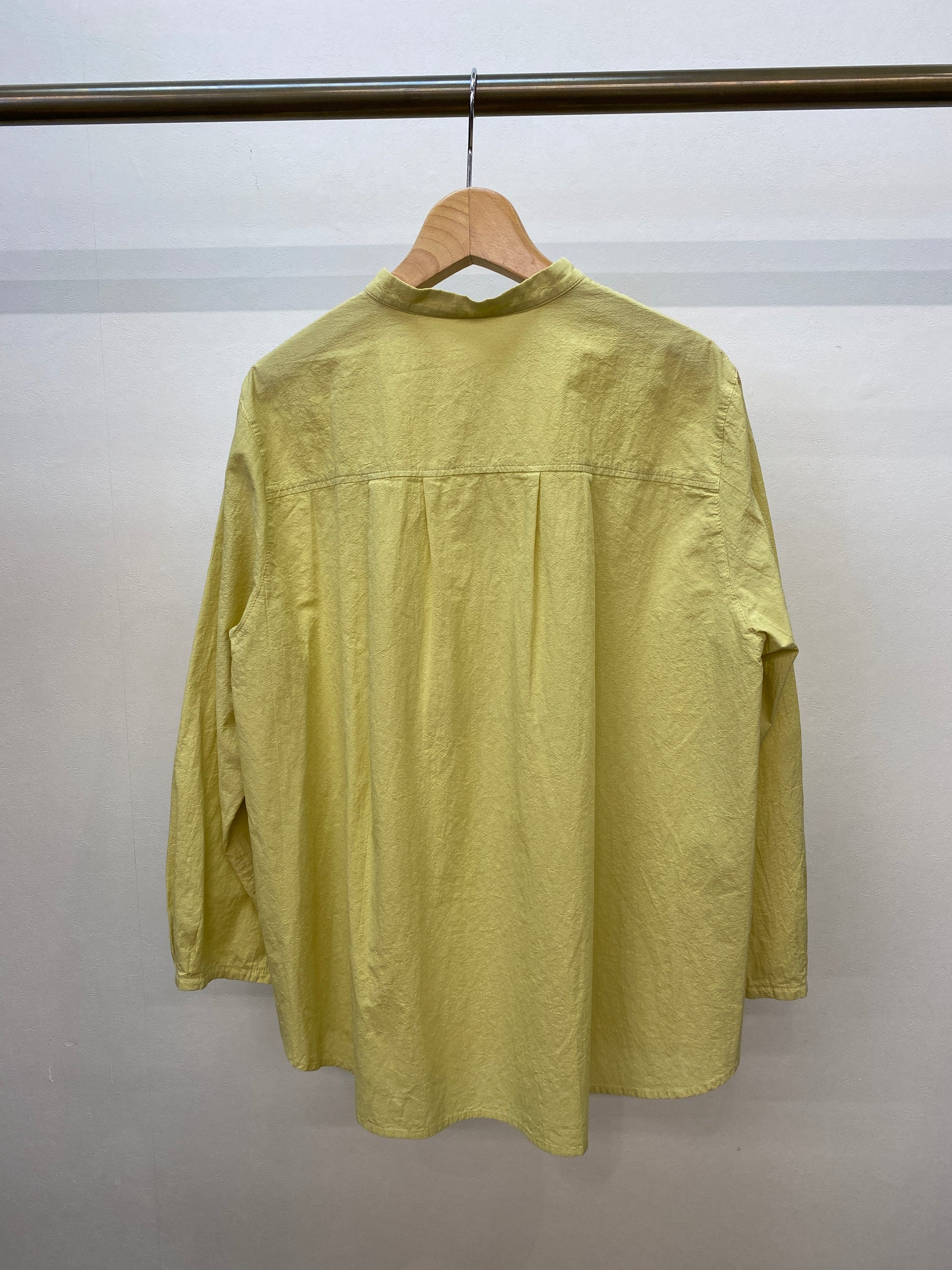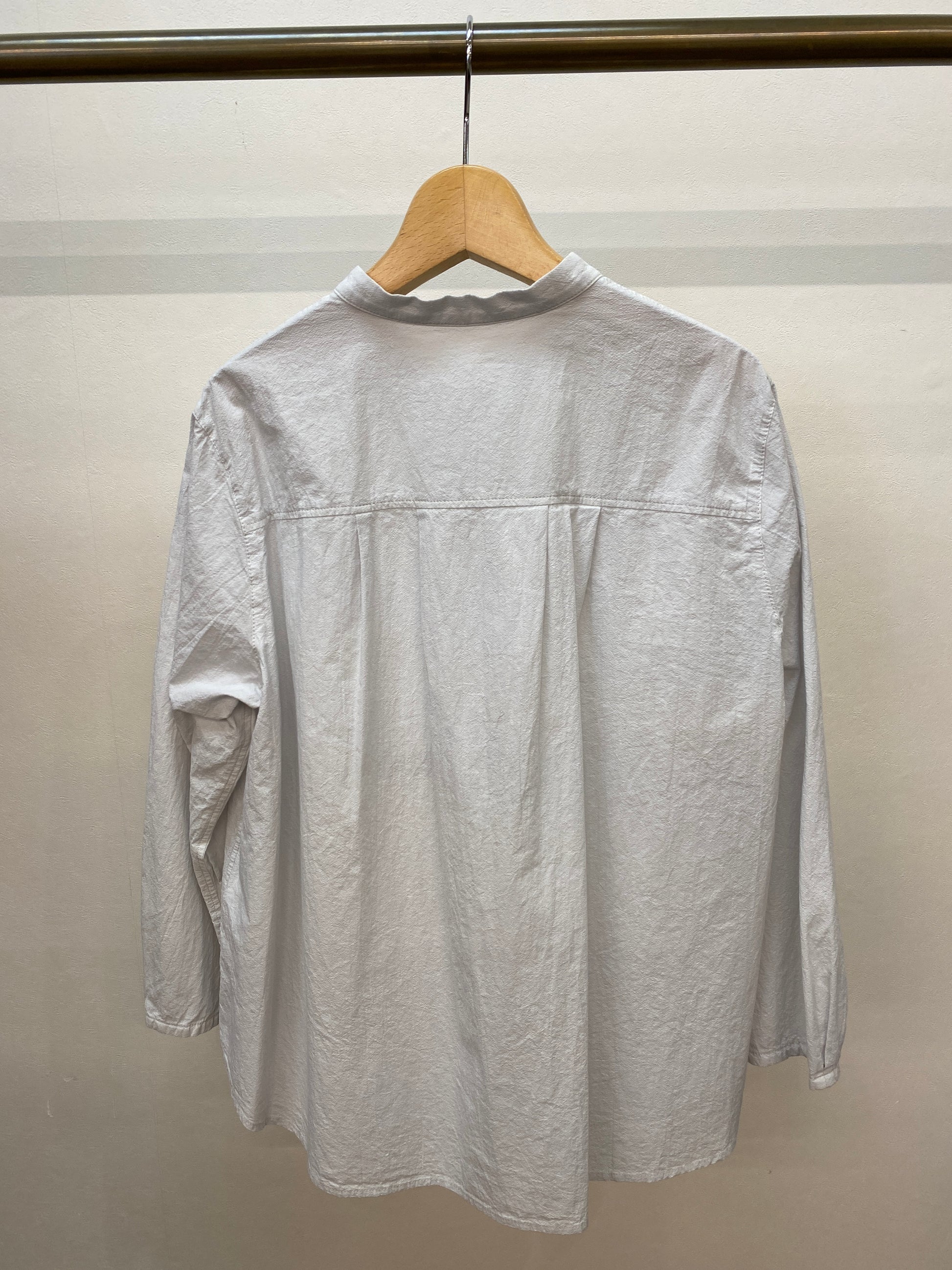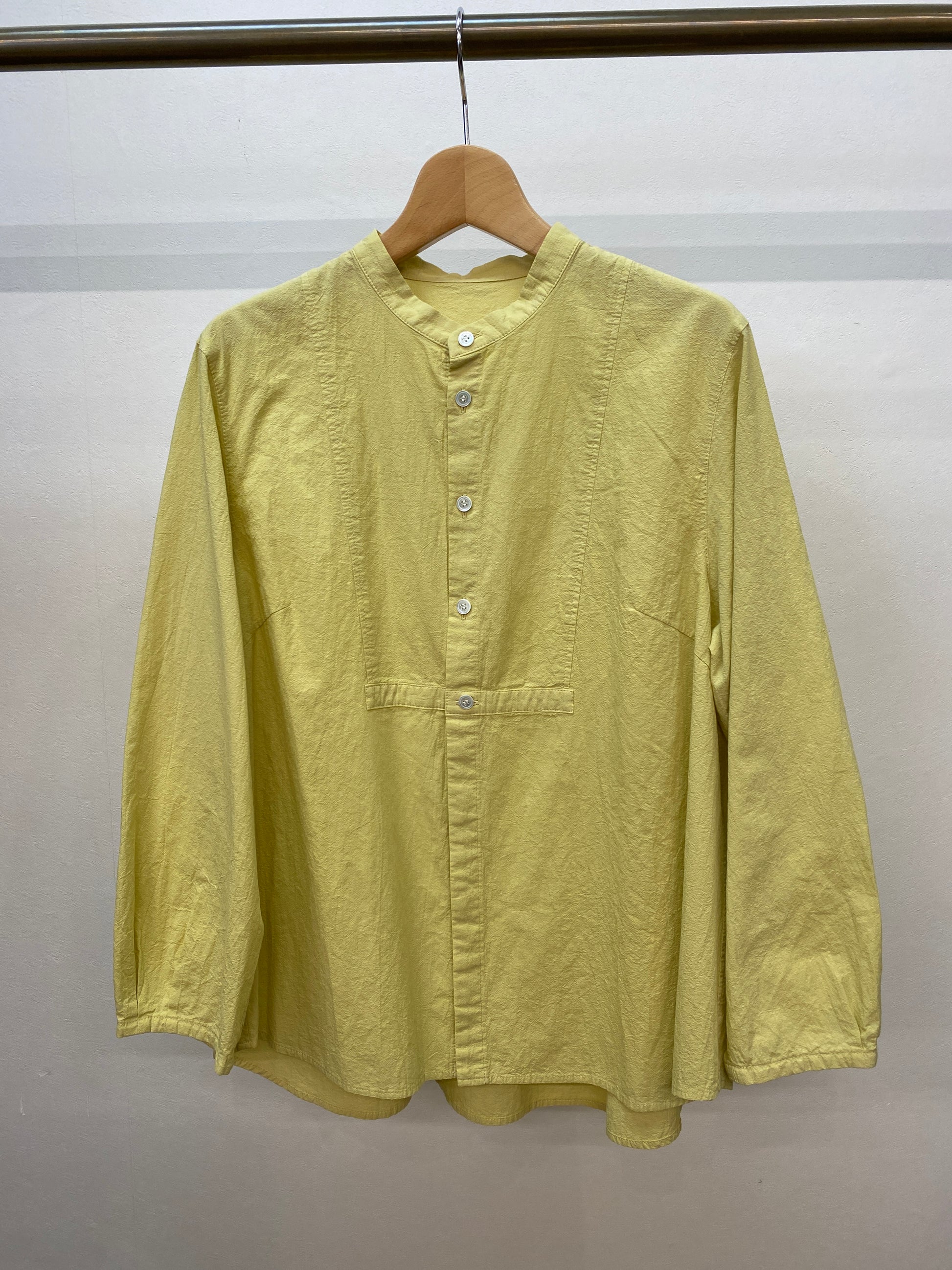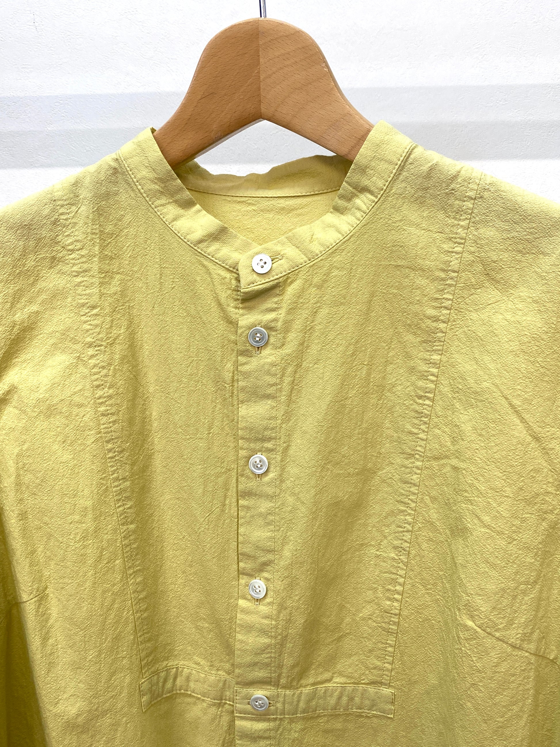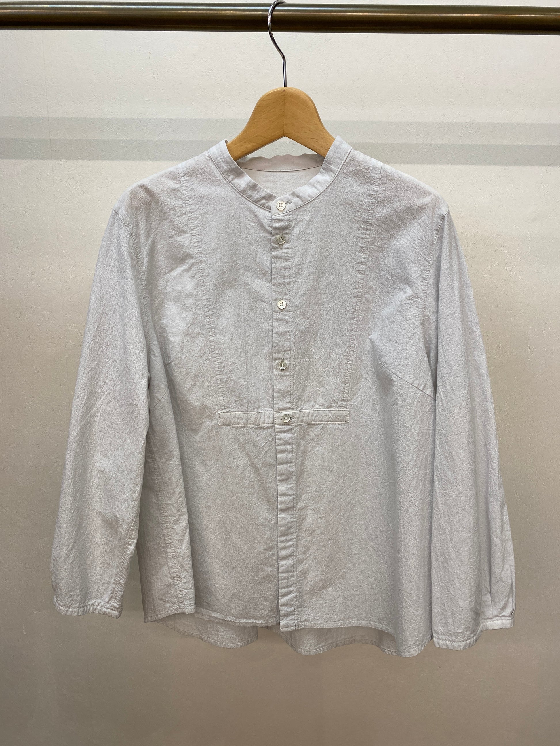 ワッシャー加工と柔らかいカラーが優しい雰囲気のバンドカラーシャツ。ゆったりなシルエットと素材感でリラックスして着ていただけます。前開きなので、羽織としても着られるので、幅広いコーディネートが楽しめます。