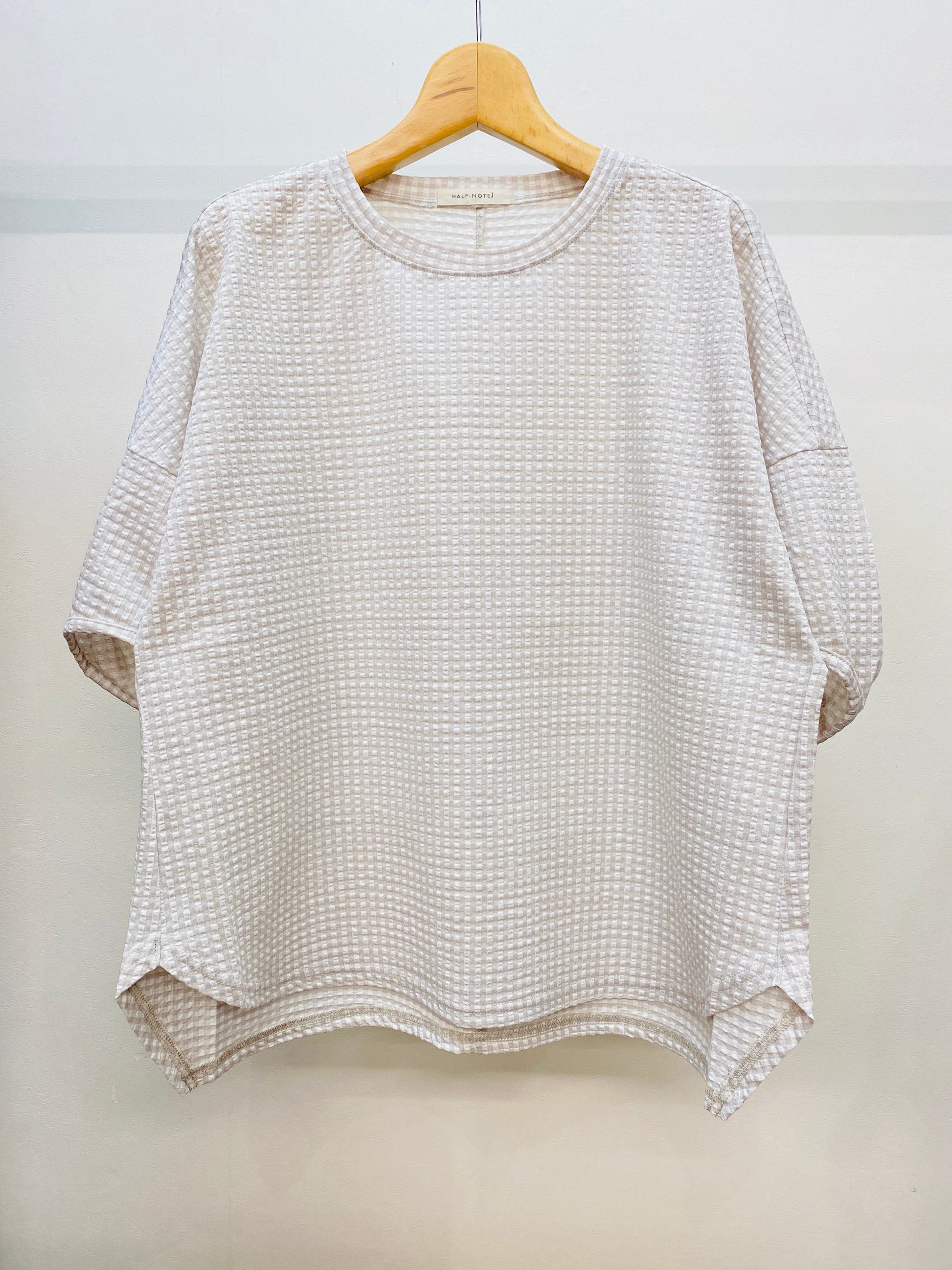 気になる二の腕やお腹周りもしっかりカバーしてくれるカットソー。デコボコ素材は肌に触れる面積も小さいので夏に最適な素材で、シワにもなりにくいのでお手入れも簡単!きちんとボトムと合わせてお出かけコーデにもオススメです!
