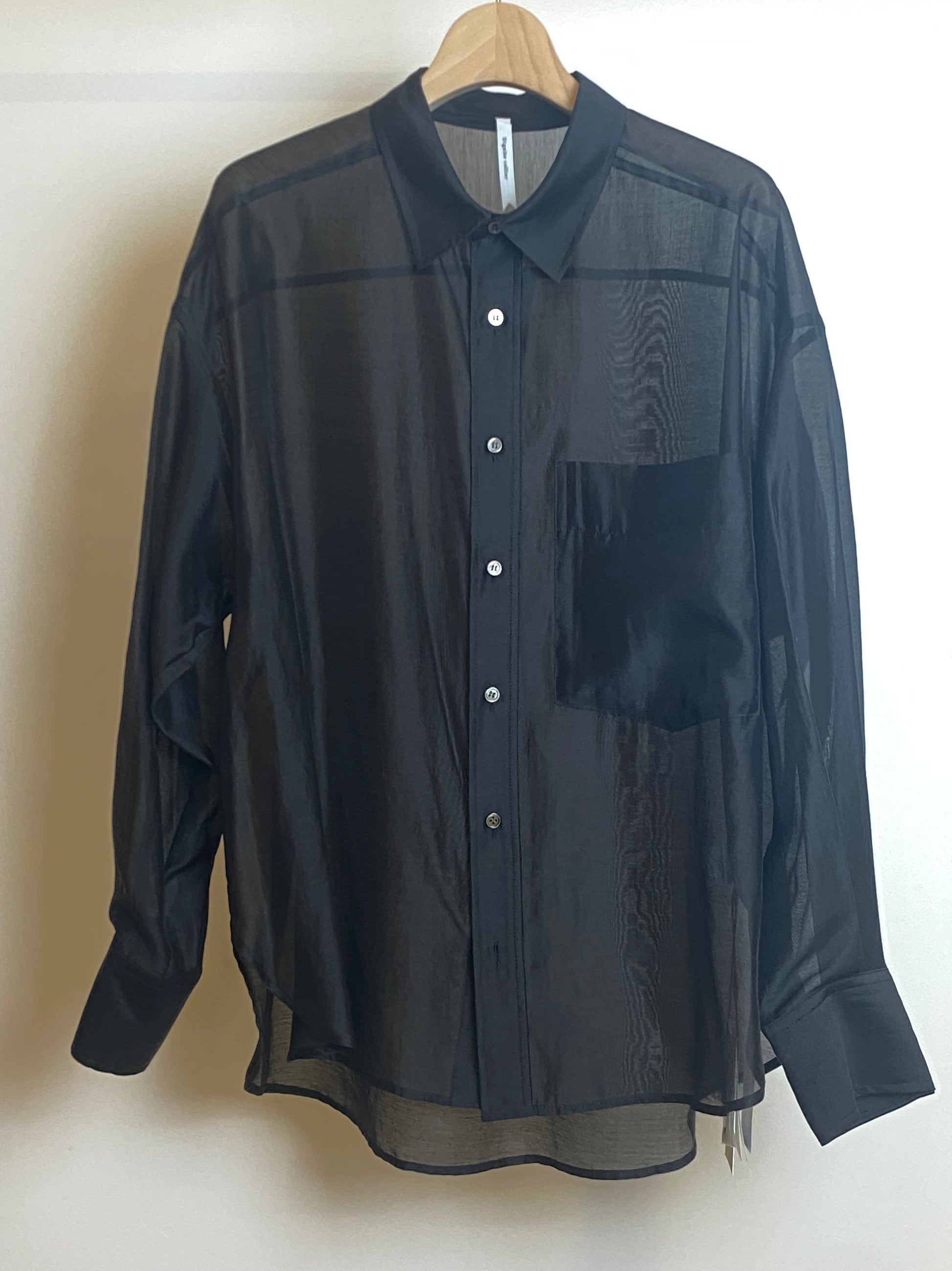 シアー素材とほどよい光沢感が上品な、オーソドックスデザインのシャツ。ゆったりとしたシルエットが女性らしい華奢さを引き立てます。1枚着、羽織り、襟抜きなど、着こなし次第で印象が変わる万能アイテムです。