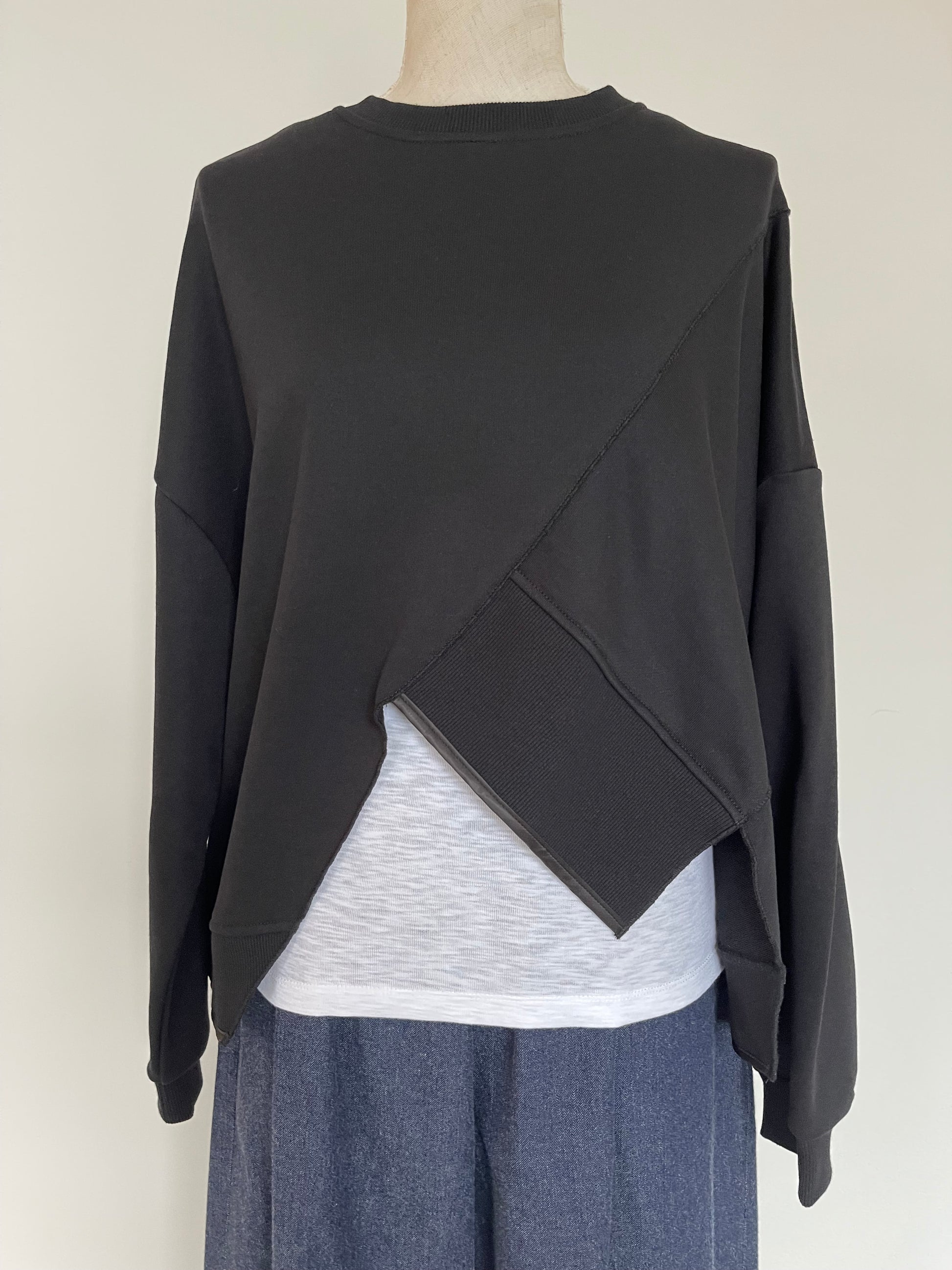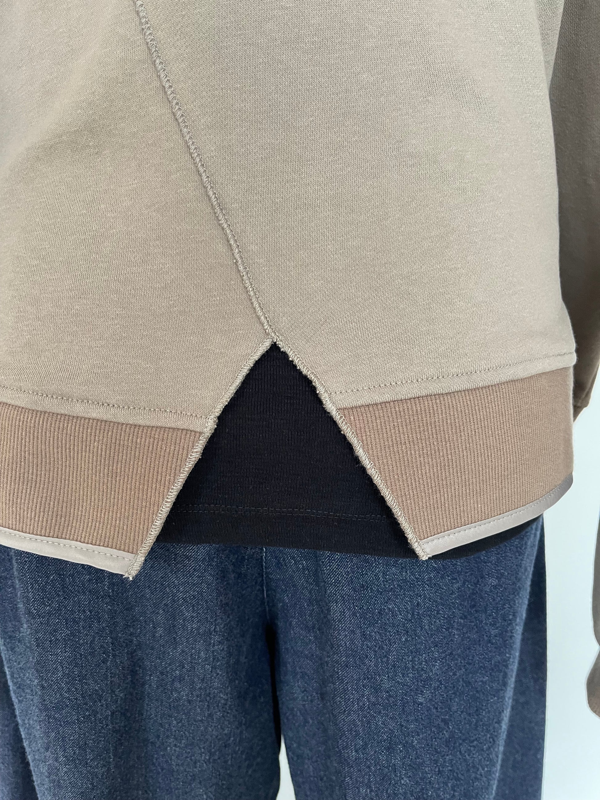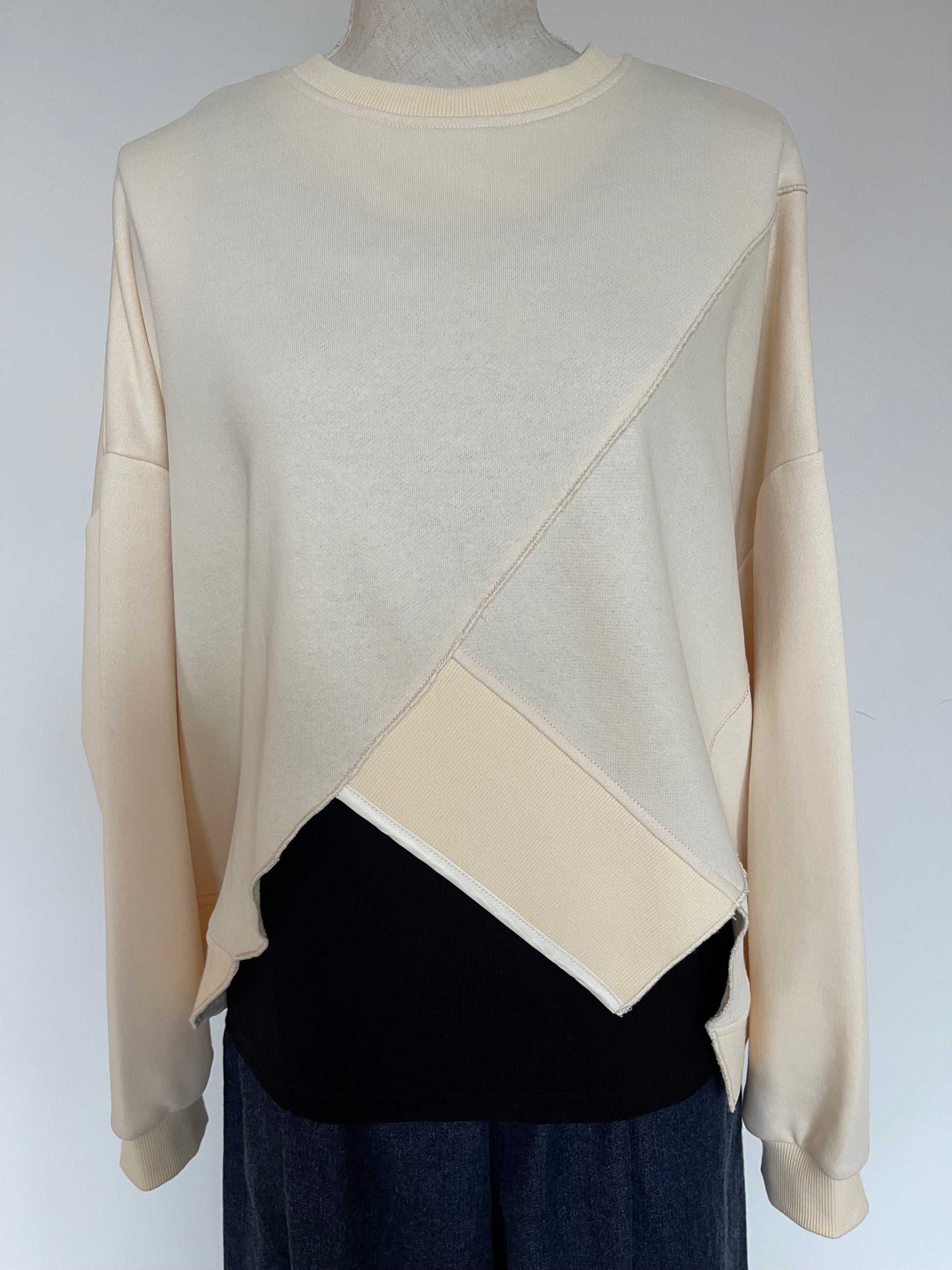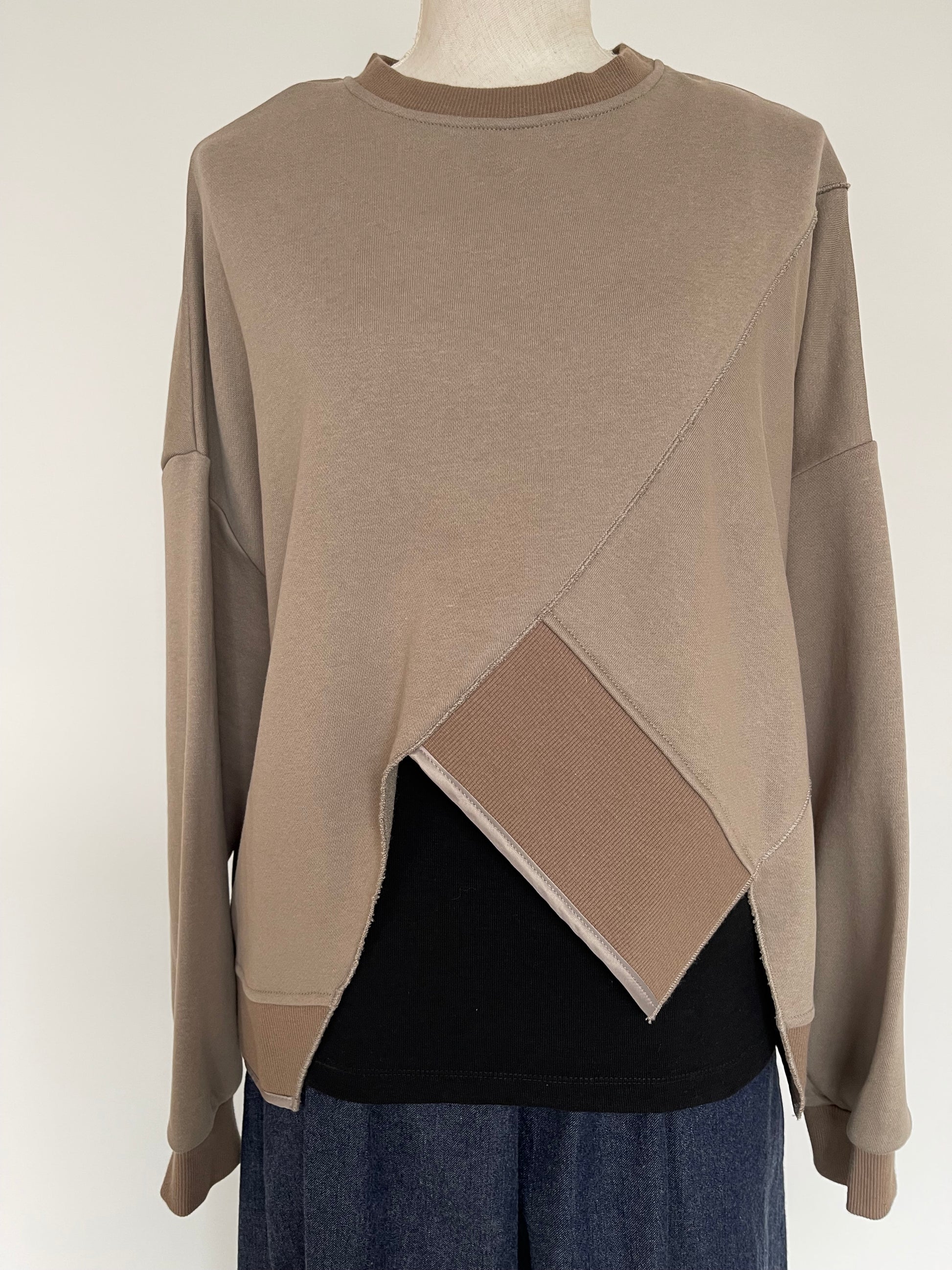 裾のランダムな切り替えが特徴的なデザインのプルオーバー。スカートやデニム、ワイドパンツなど、ボトムを選ばず合わせやすい1枚。体型カバーにもなりモードにも、大人可愛いにもなれます。