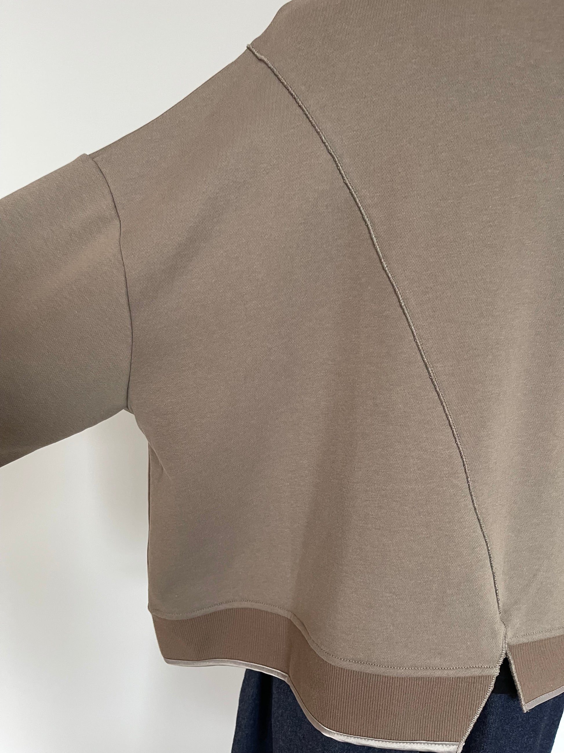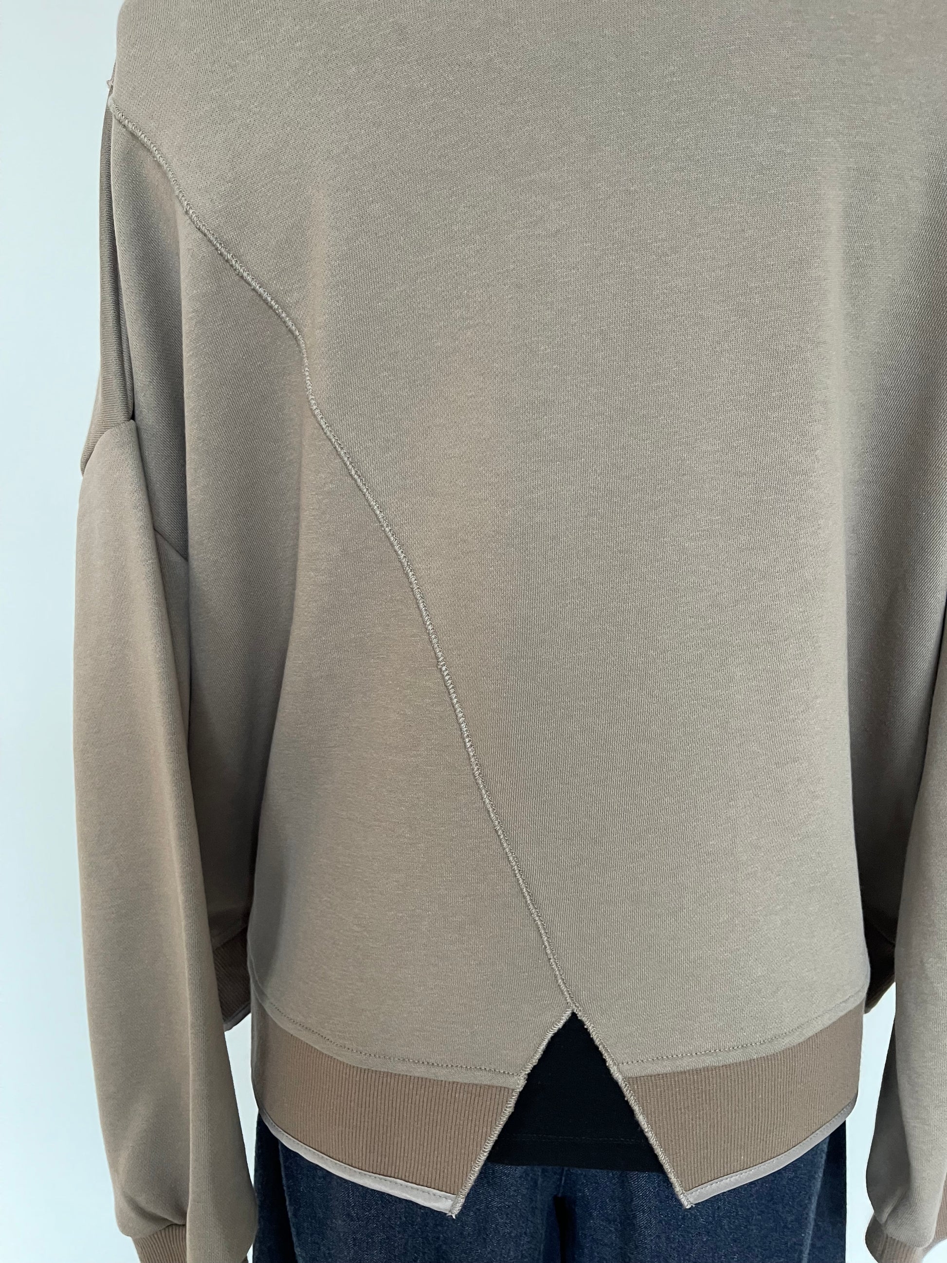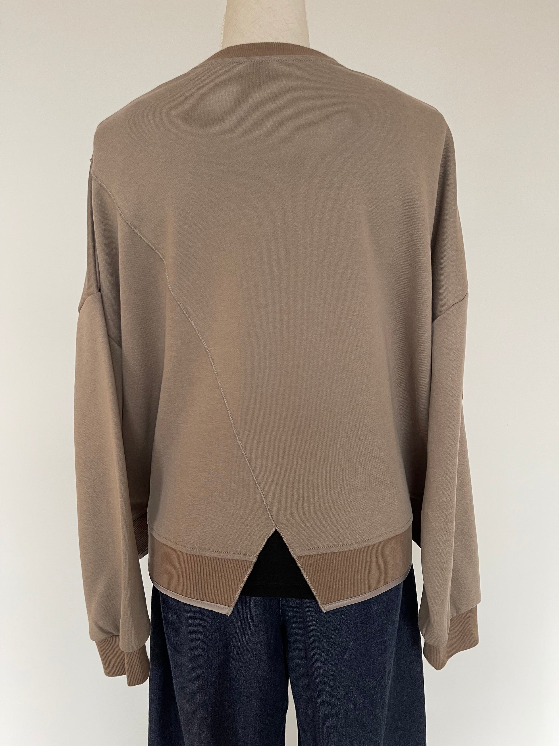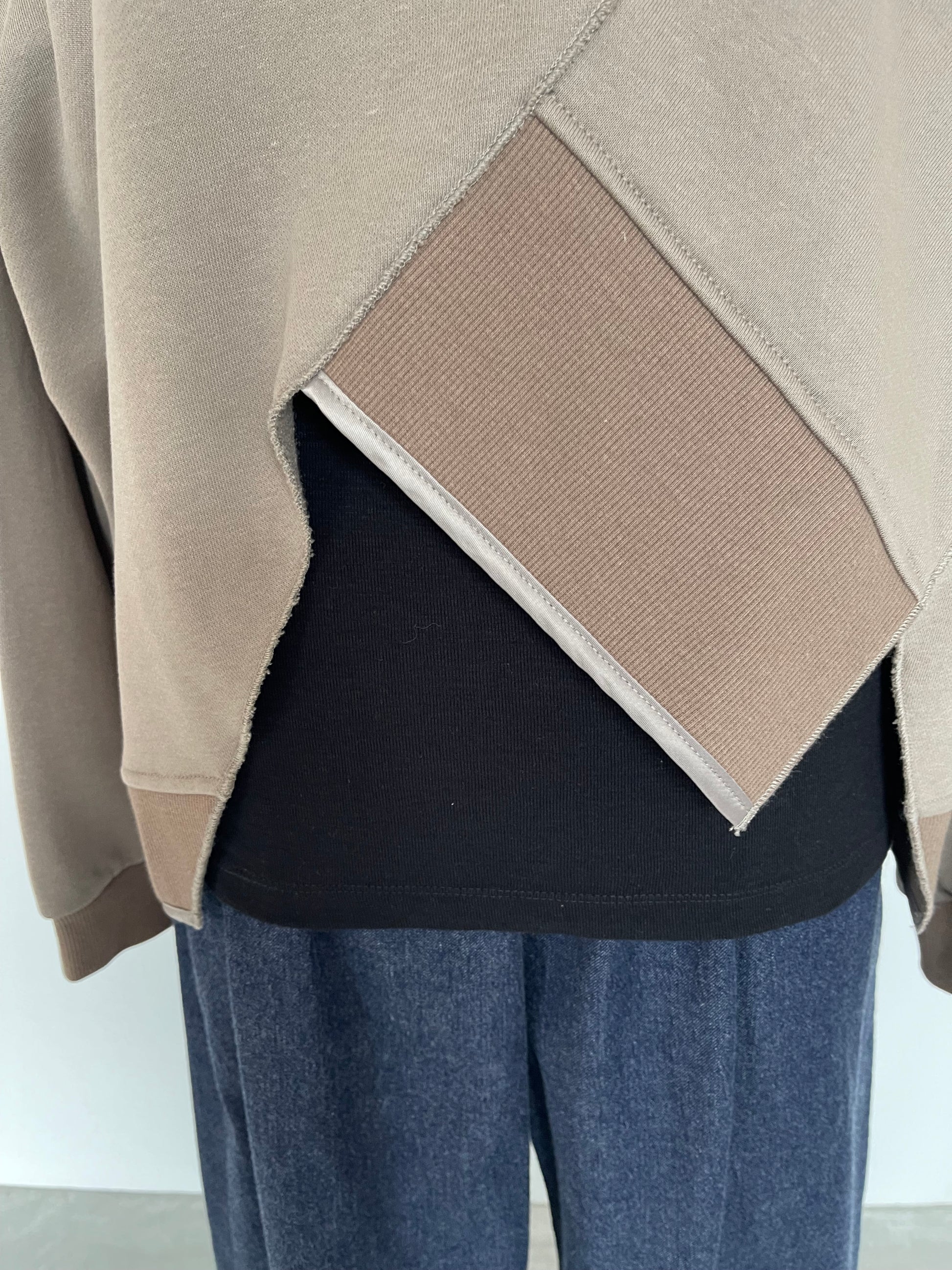 裾のランダムな切り替えが特徴的なデザインのプルオーバー。スカートやデニム、ワイドパンツなど、ボトムを選ばず合わせやすい1枚。体型カバーにもなりモードにも、大人可愛いにもなれます。