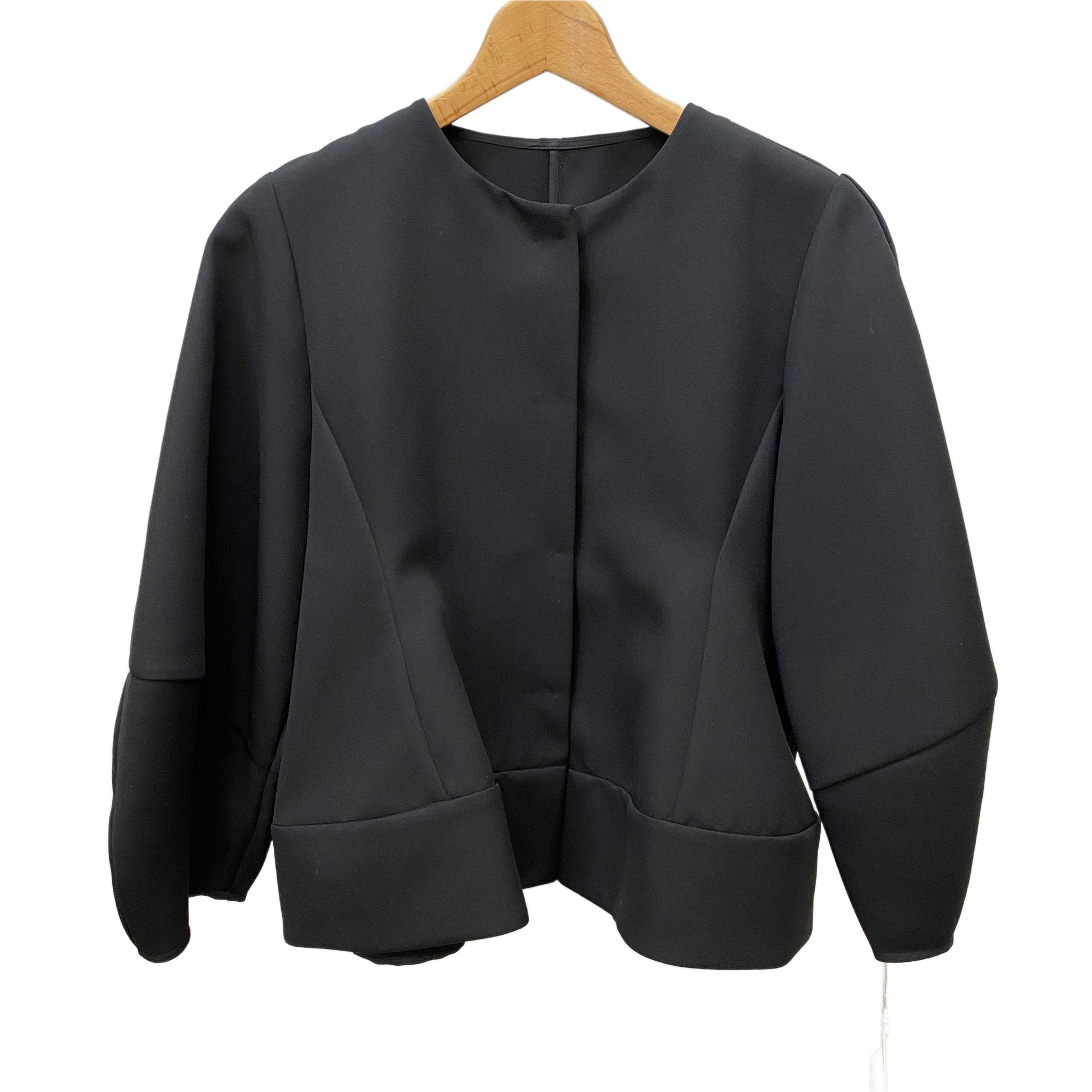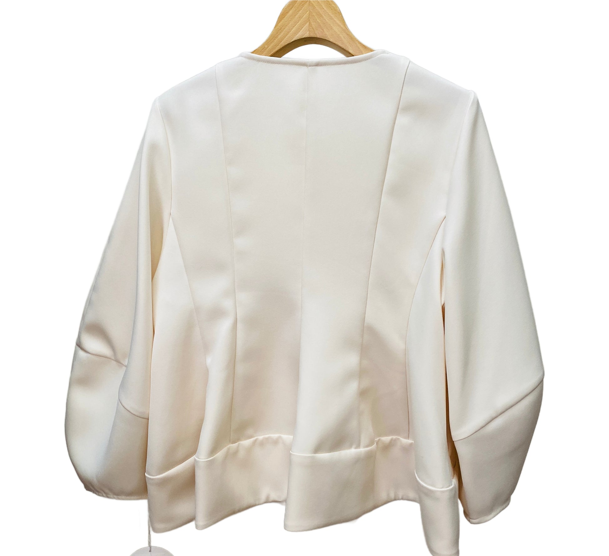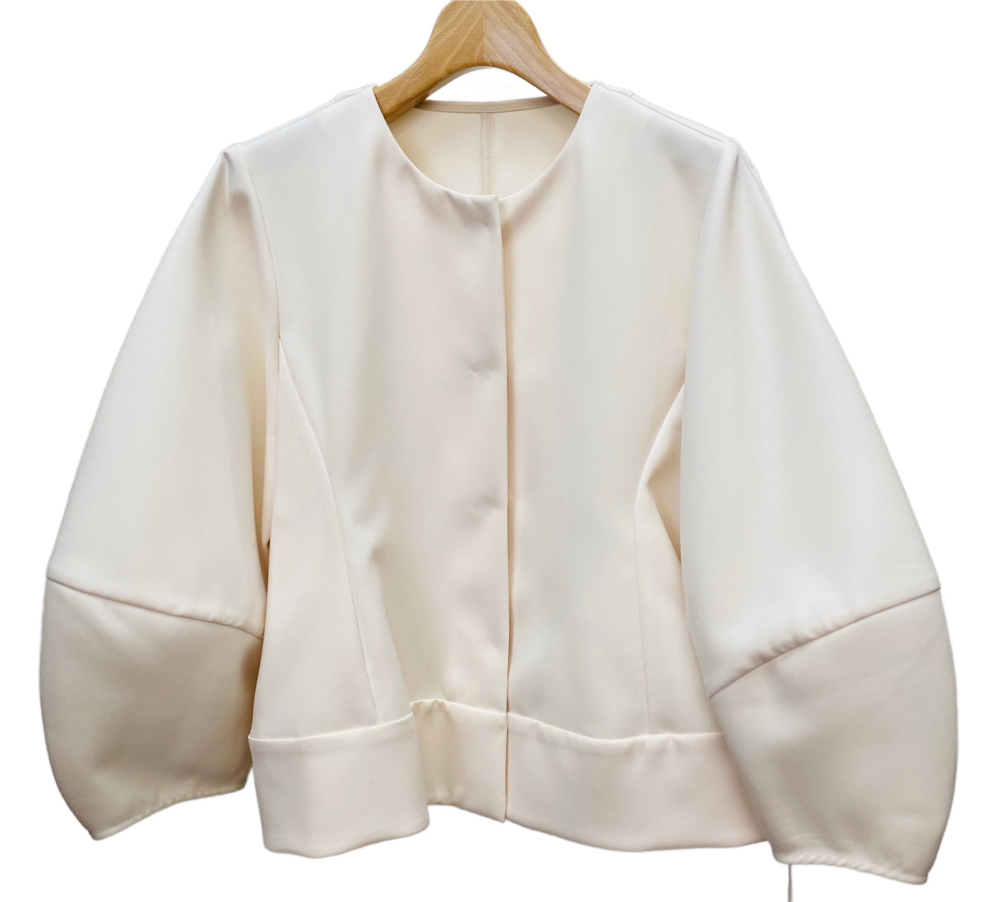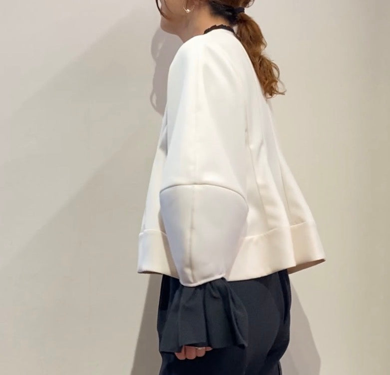 ハリ感のあるボンディング素材のジャケット。袖のふんわりした形と裾のペプラムシルエットが、女性らしく華やかな印象の1着です。オケージョンシーンから普段のお出かけシーンまで幅広く着回しもできます!