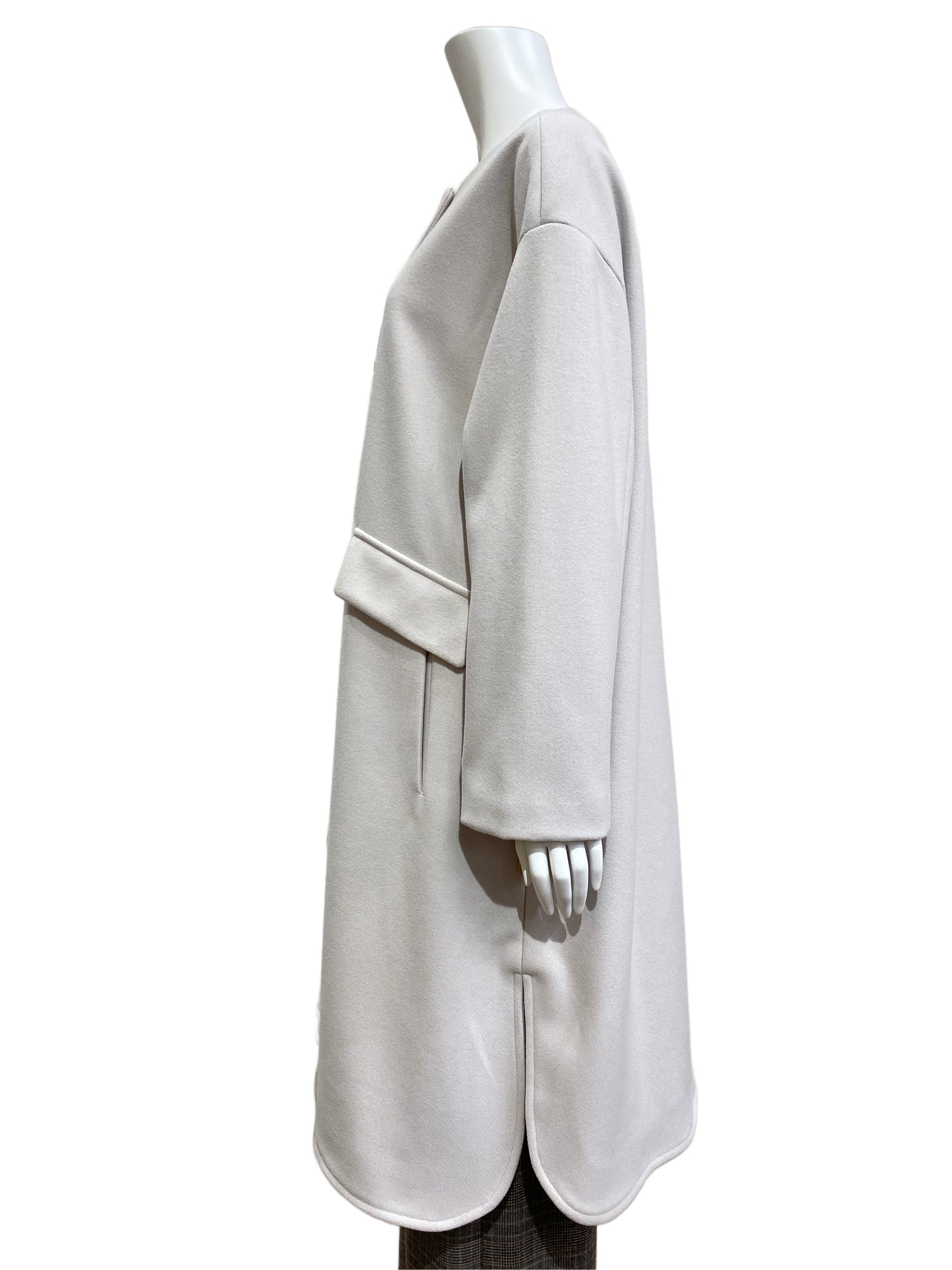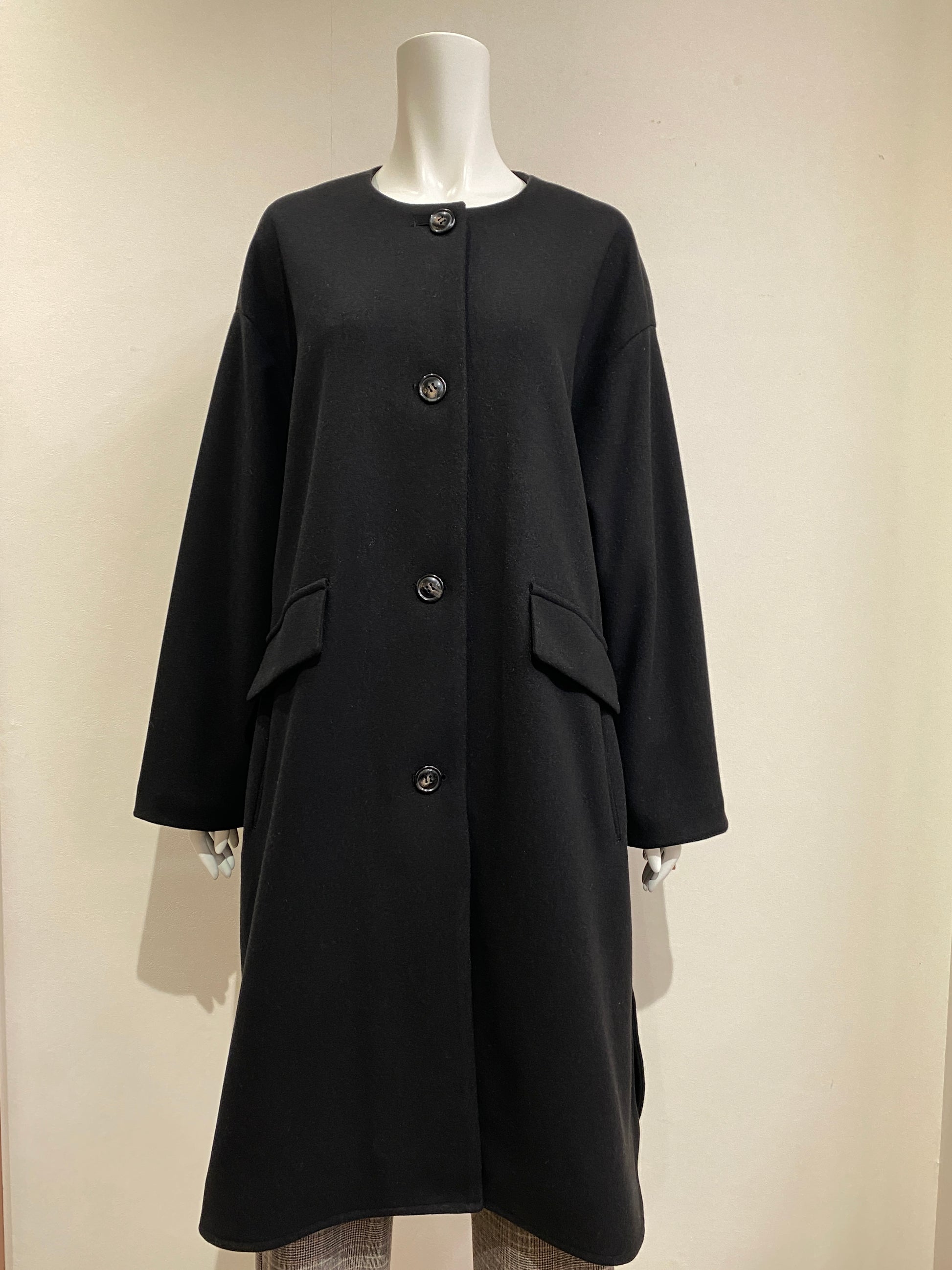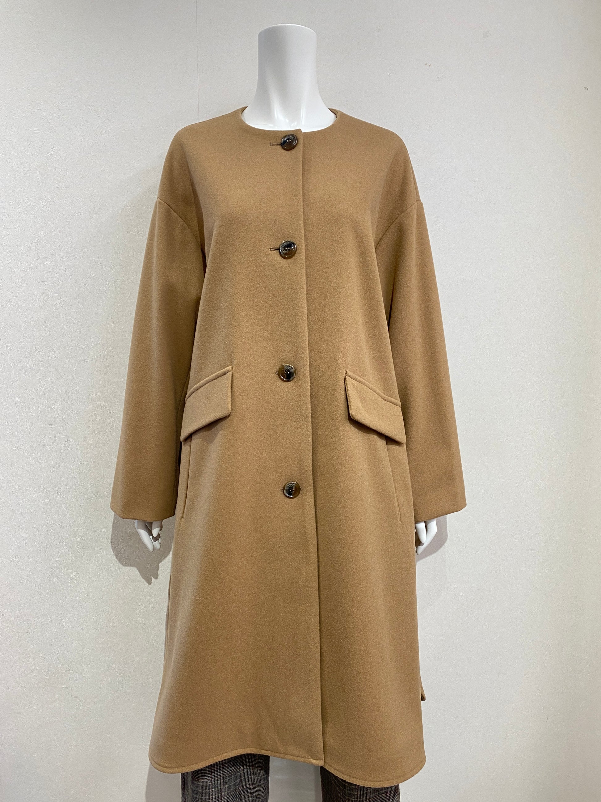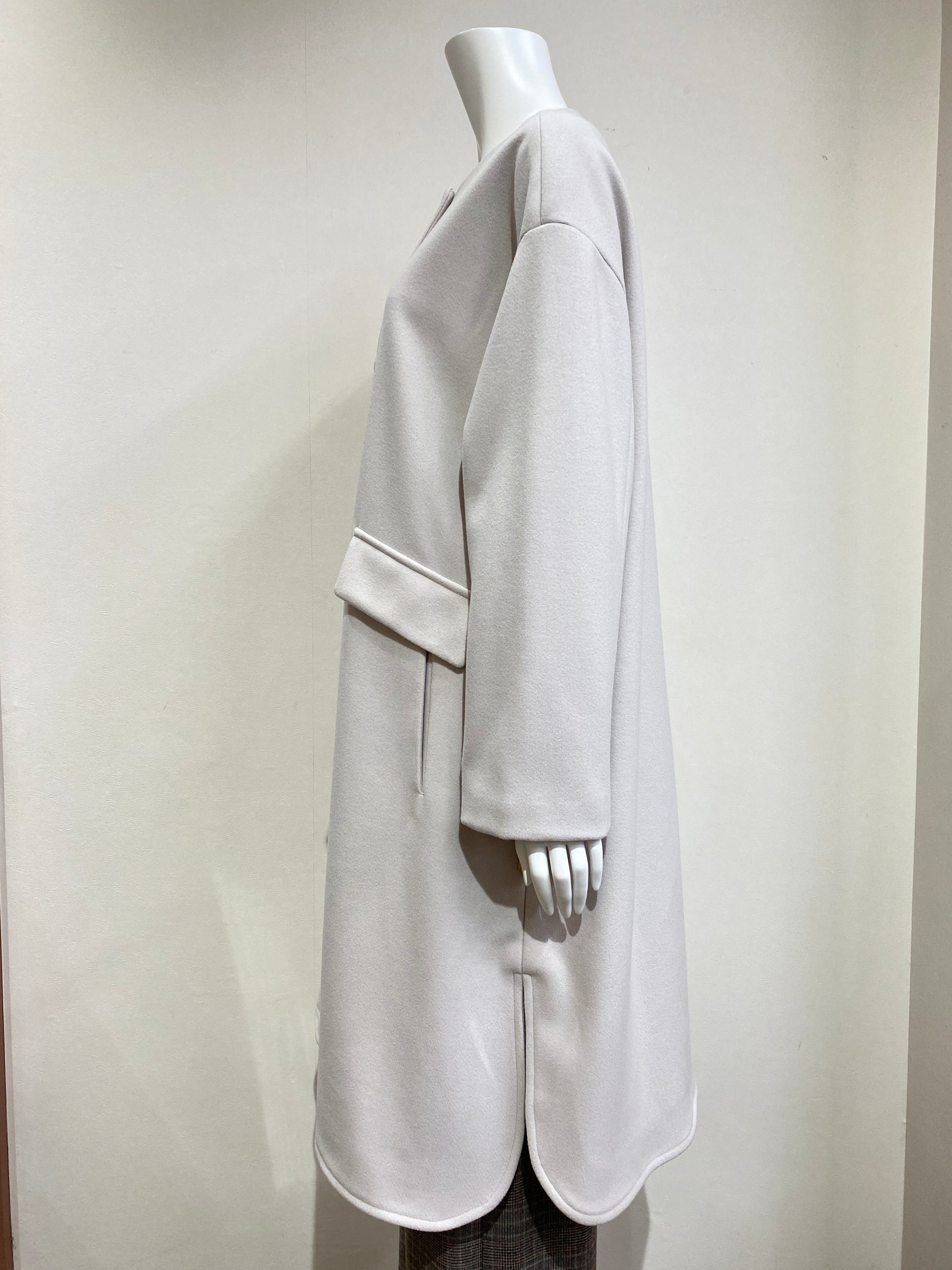 ノーカラーなので首元がスッキリ上品で洗練された印象に見えるコート。