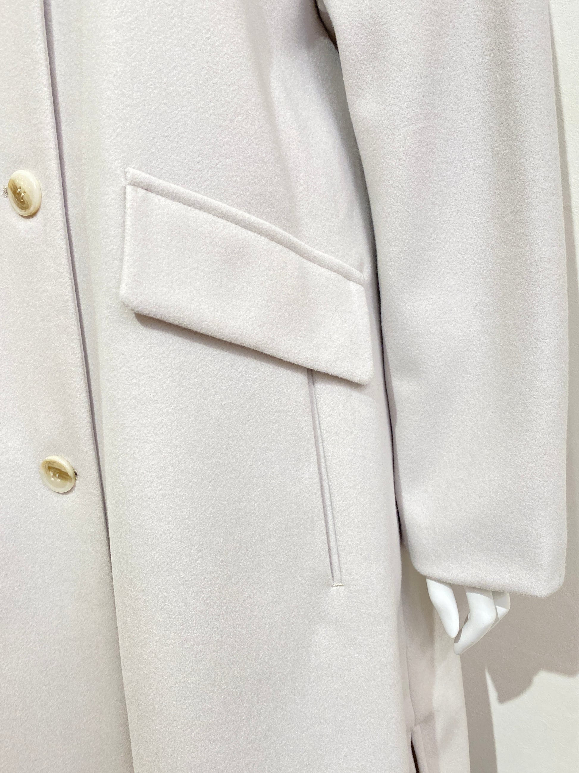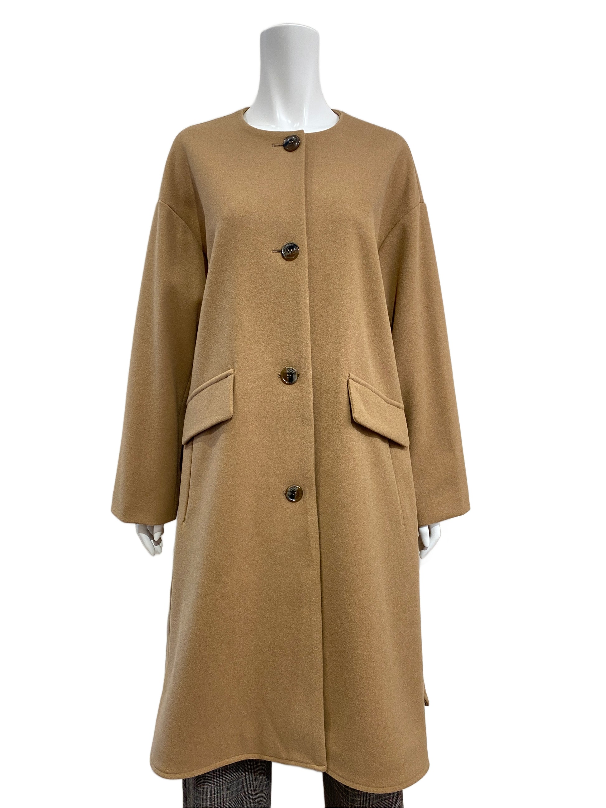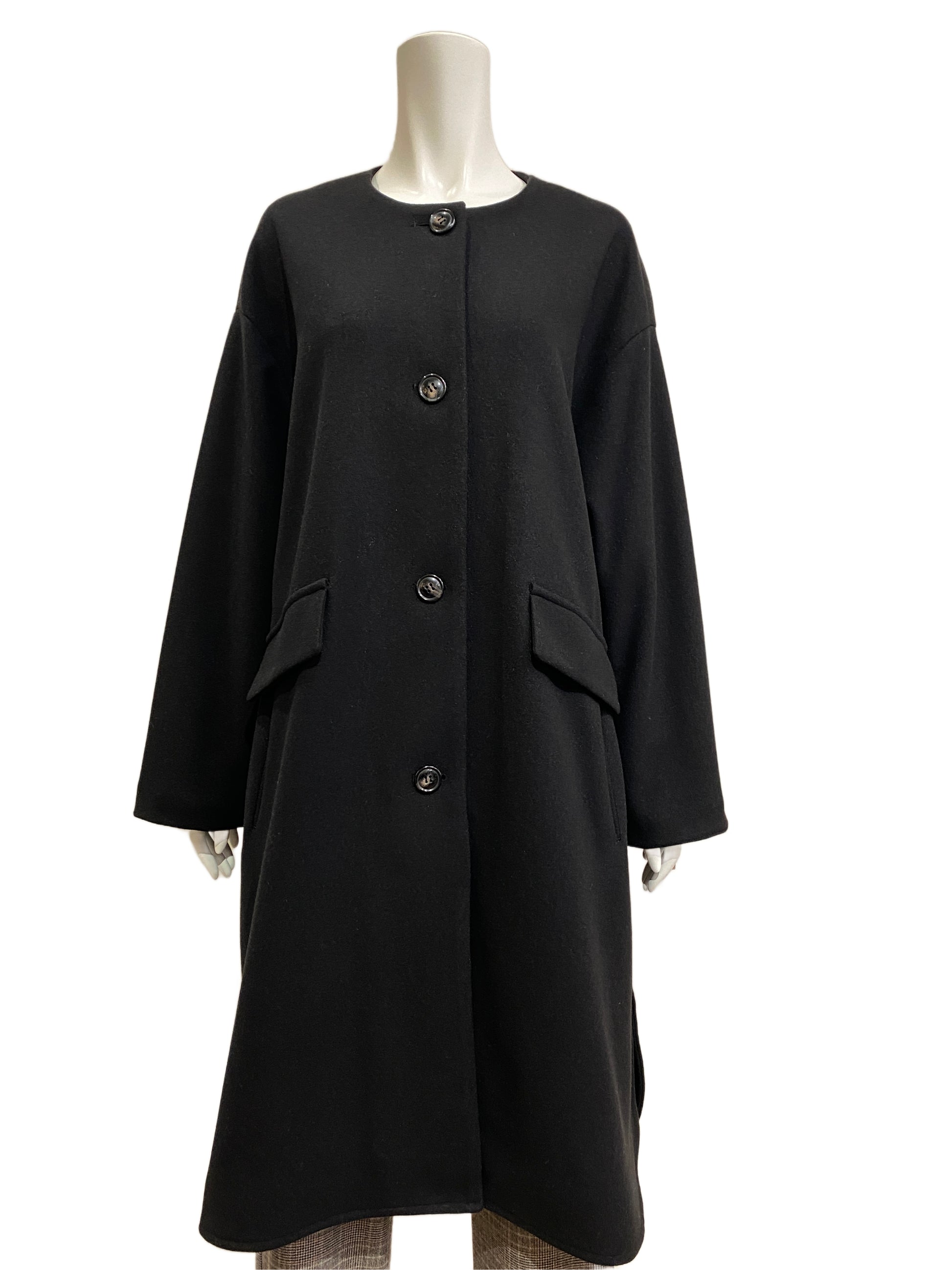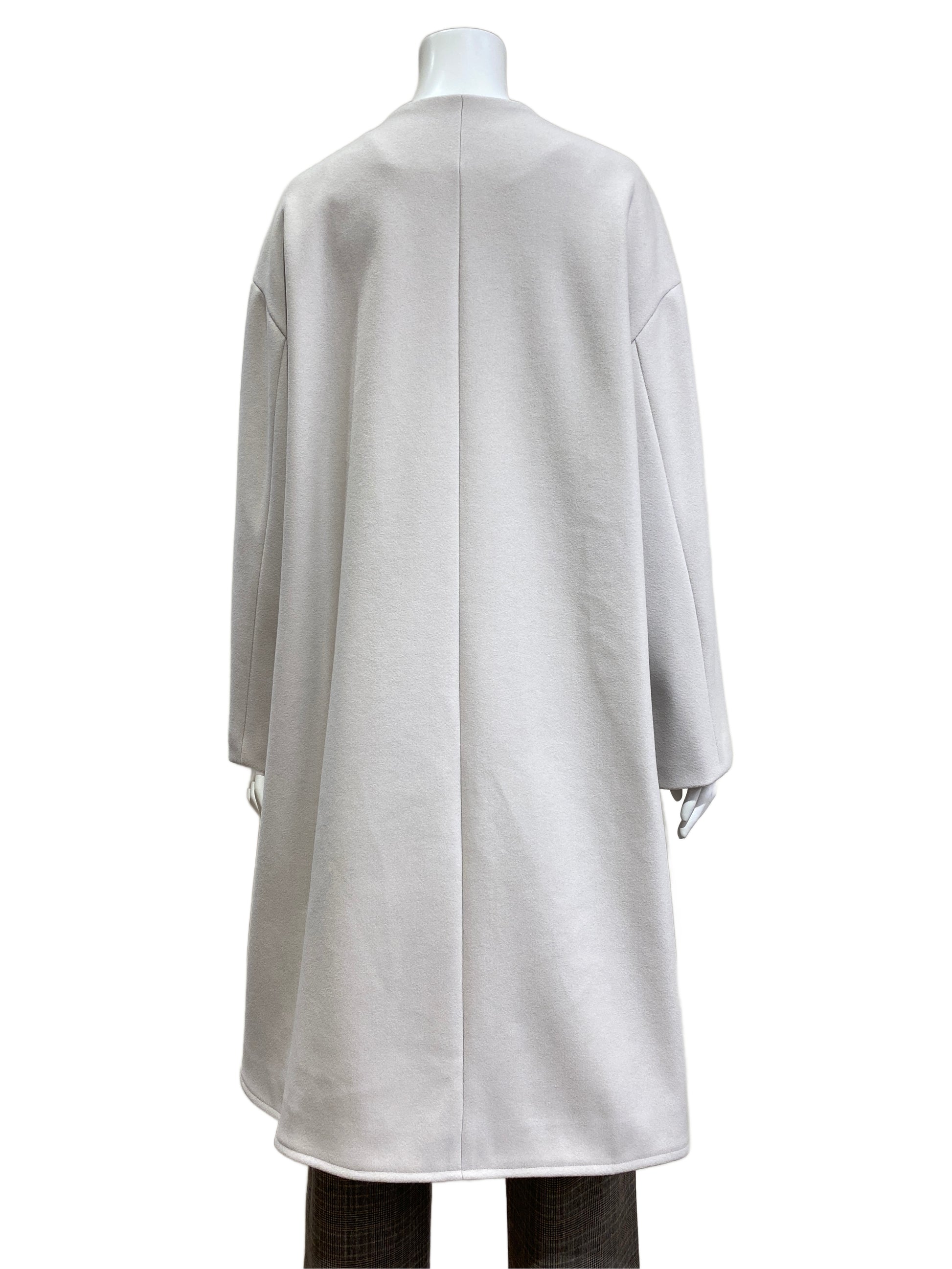 ノーカラーなので首元がスッキリ上品で洗練された印象に見えるコート。
