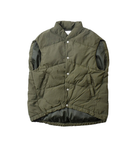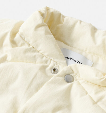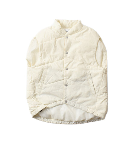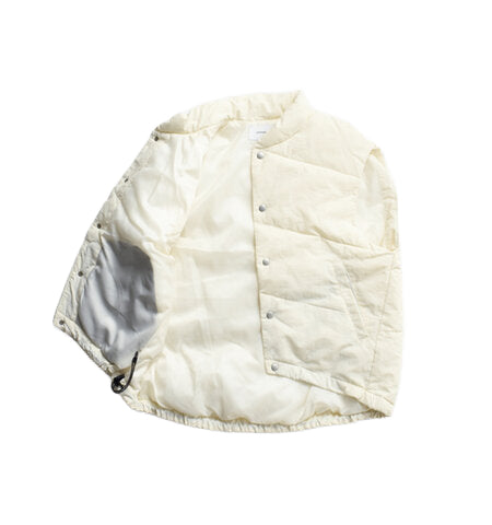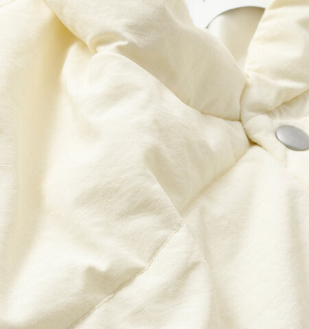 中綿ケープベスト。素材は撥水ナイロンで軽量ながら暖かく、全体的に丸みのある女性らしいシルエット。急な雨にも対応できるマットな質感がカジュアル過ぎない大人な雰囲気に。