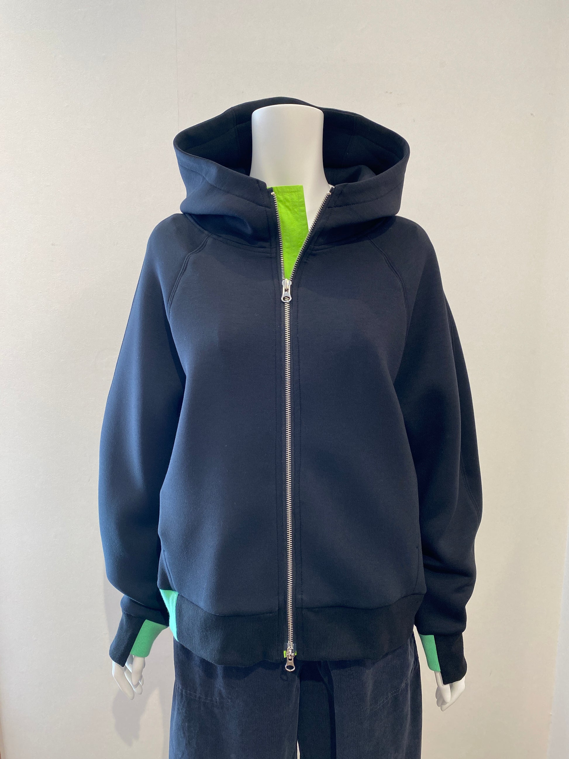 ボンディング素材の軽いパーカー。袖口と前たてのカラーリングが目を惹くデザイン。