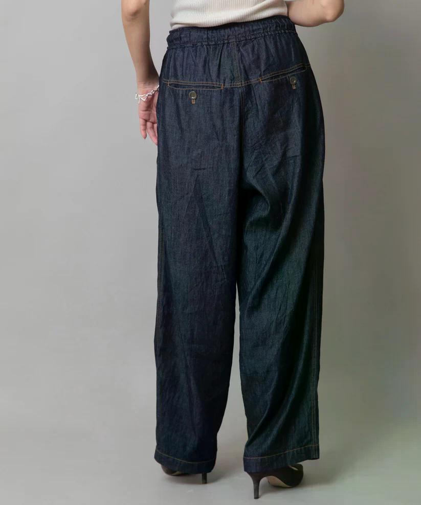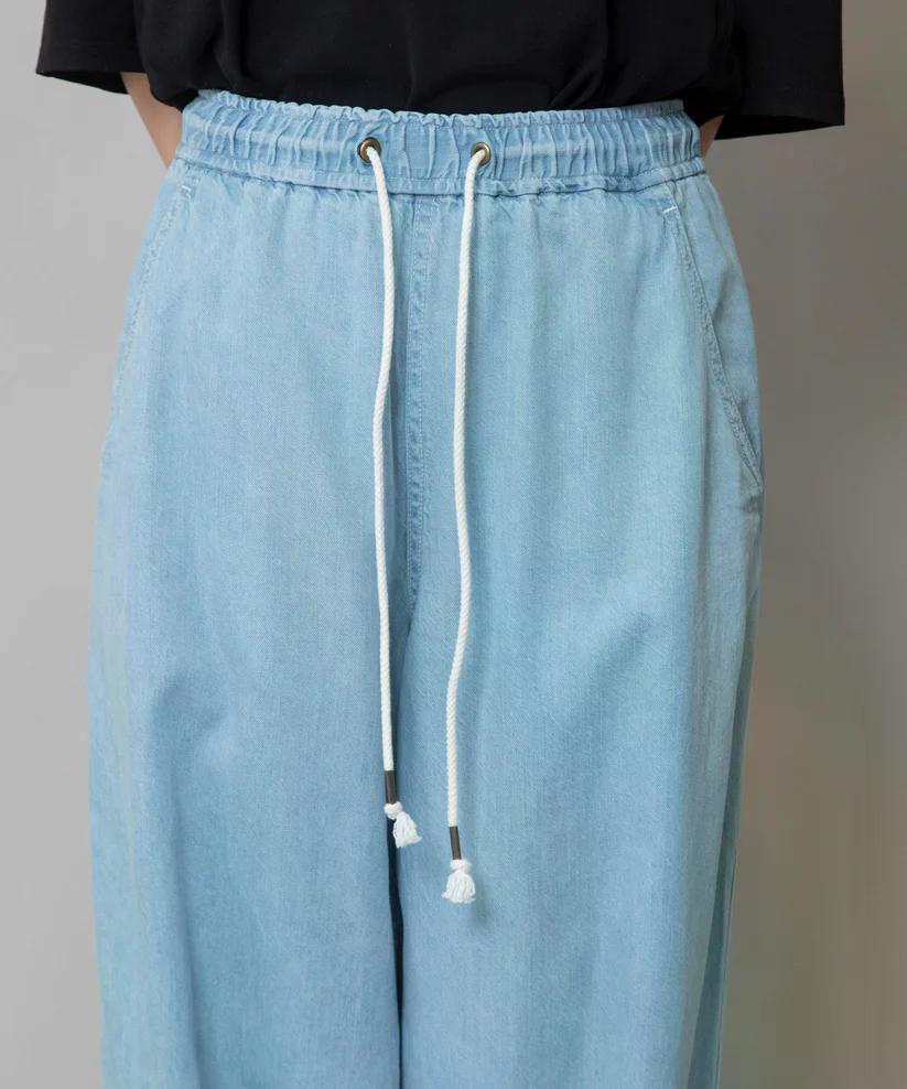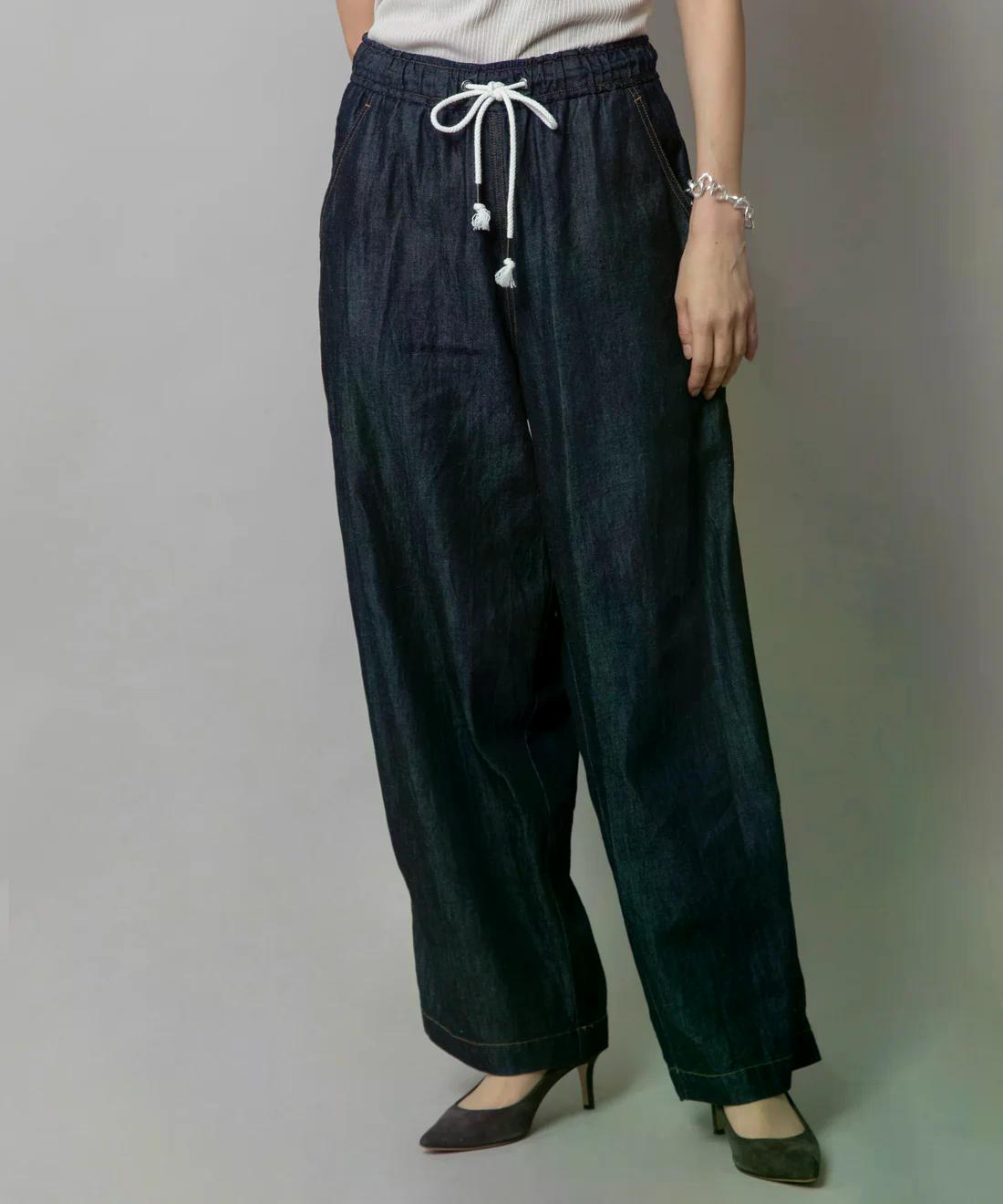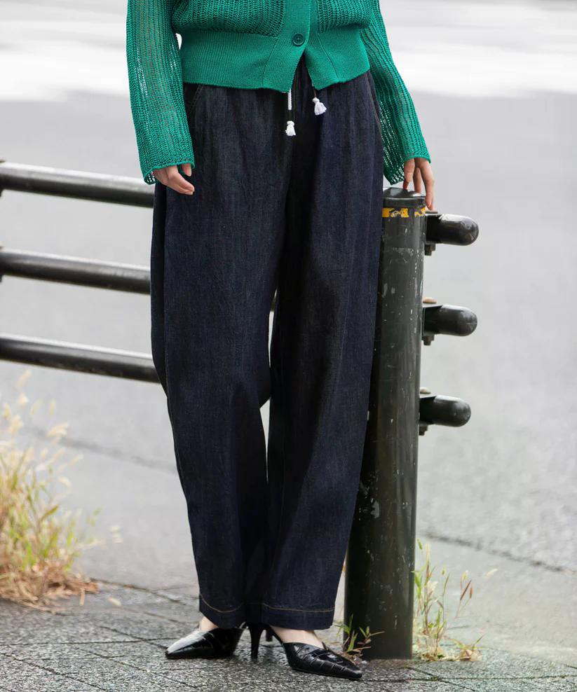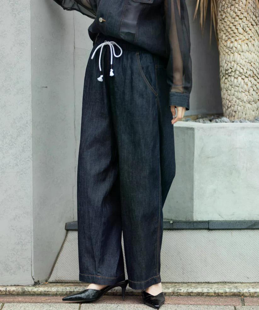 股上深めのゆったりとしたサイジングに、ドロスト仕様のゴムウエストを組み合わせたリラックス感たっぷりのデニムワイドパンツ。