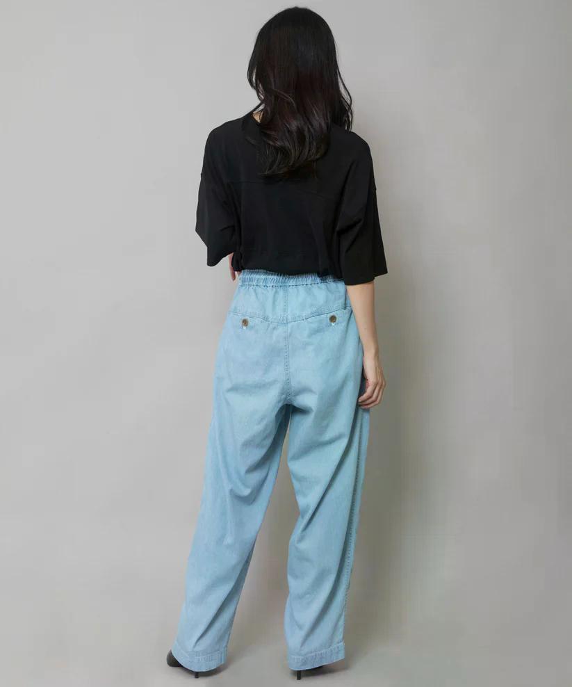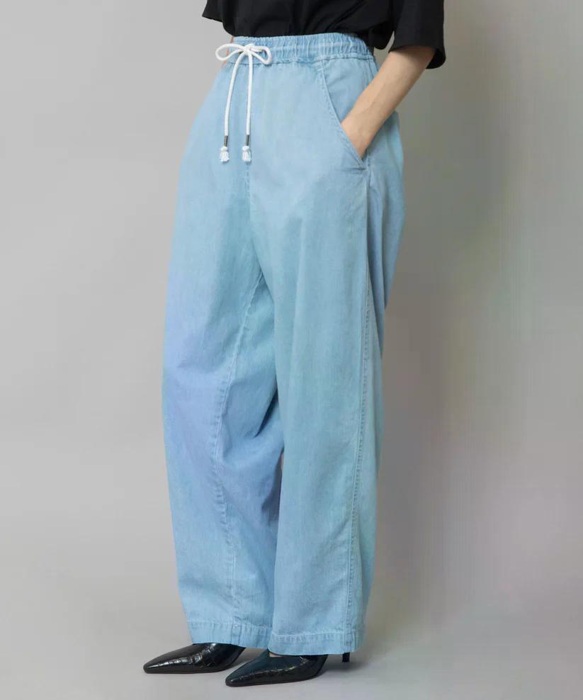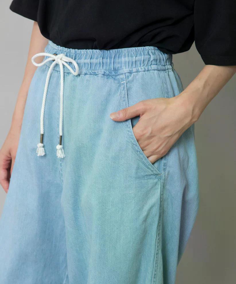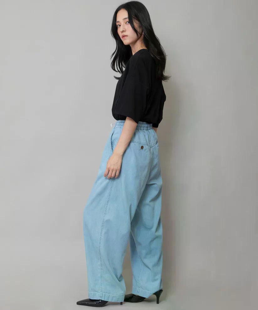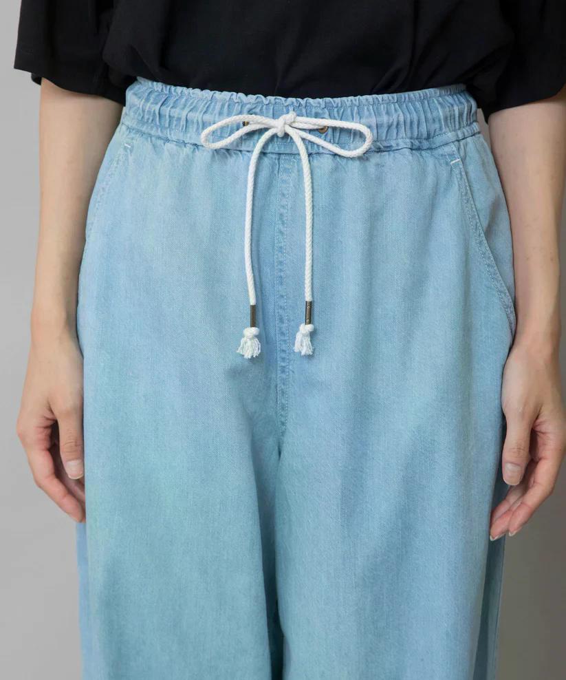 股上深めのゆったりとしたサイジングに、ドロスト仕様のゴムウエストを組み合わせたリラックス感たっぷりのデニムワイドパンツ。