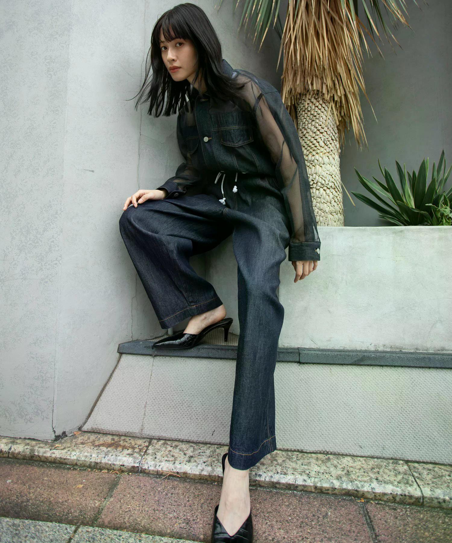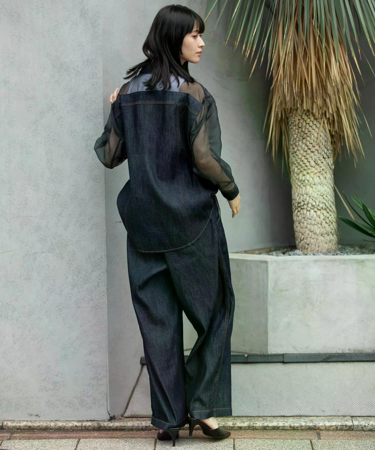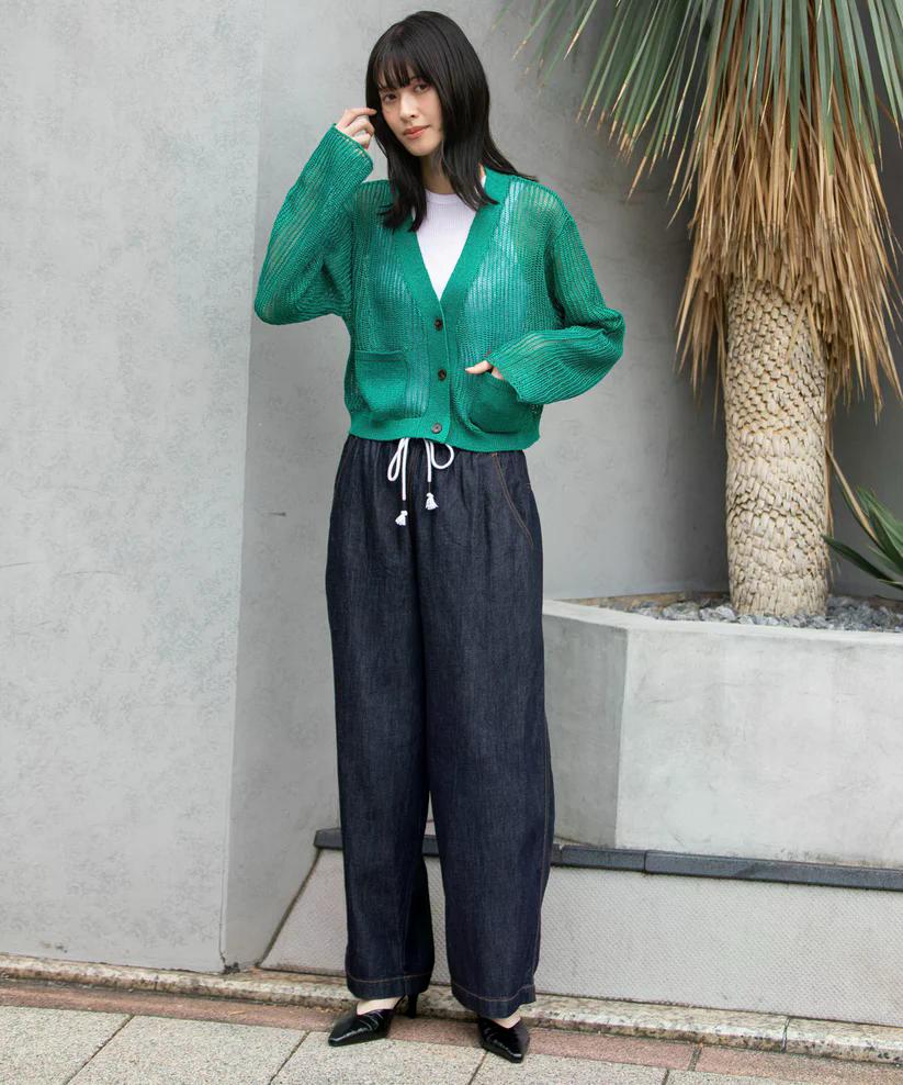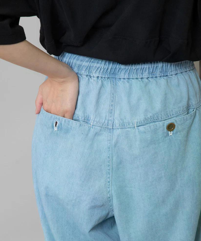 股上深めのゆったりとしたサイジングに、ドロスト仕様のゴムウエストを組み合わせたリラックス感たっぷりのデニムワイドパンツ。