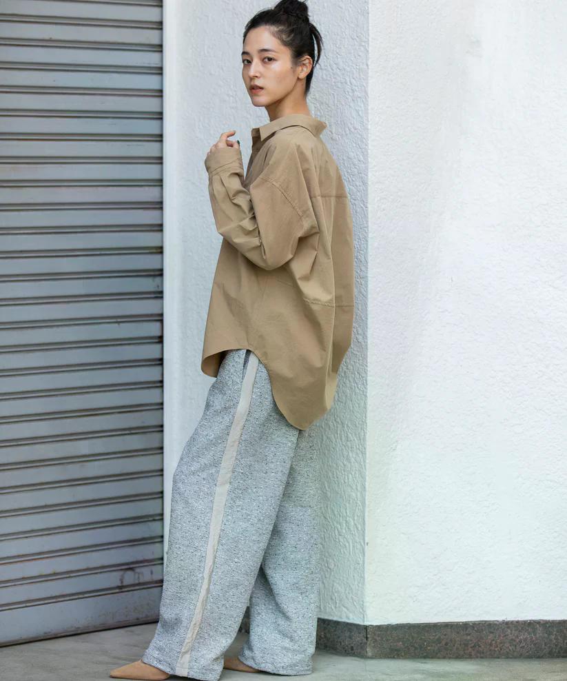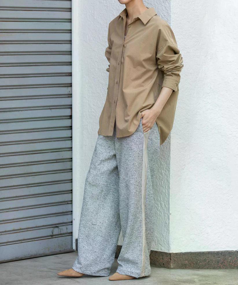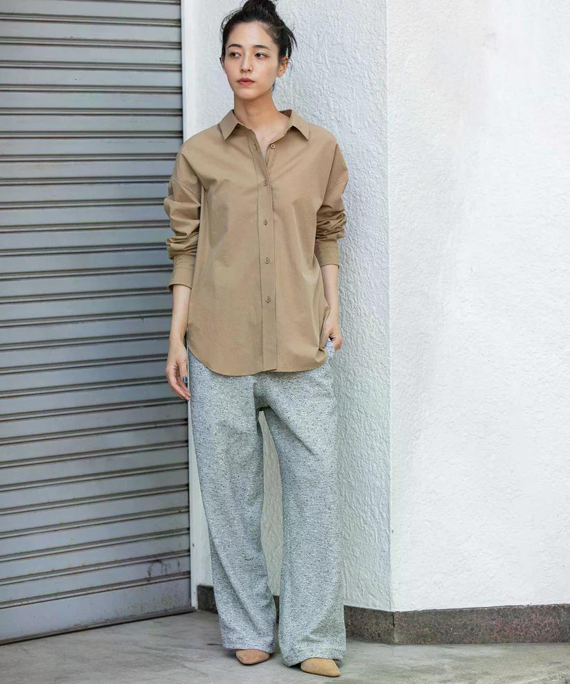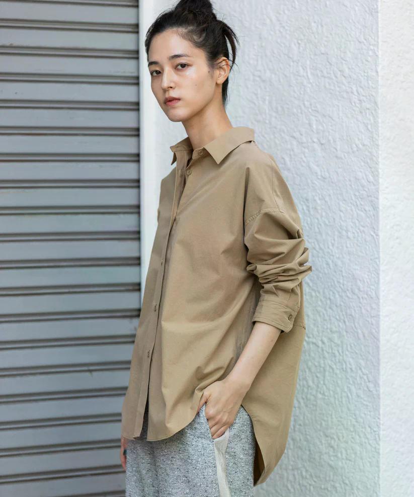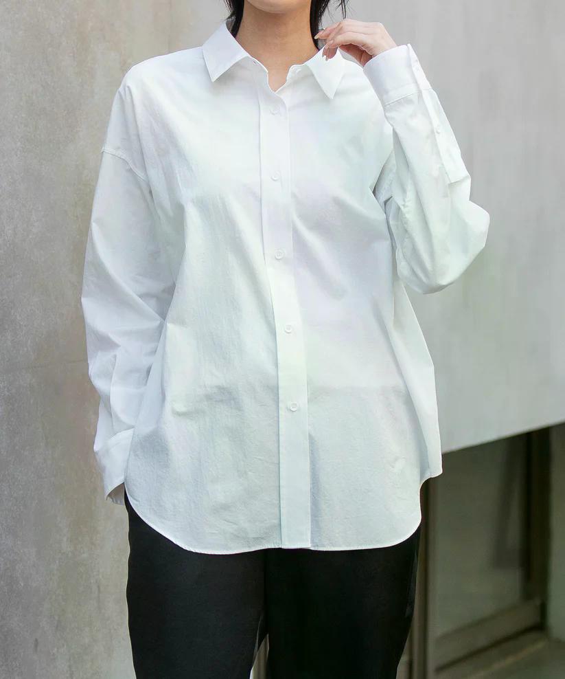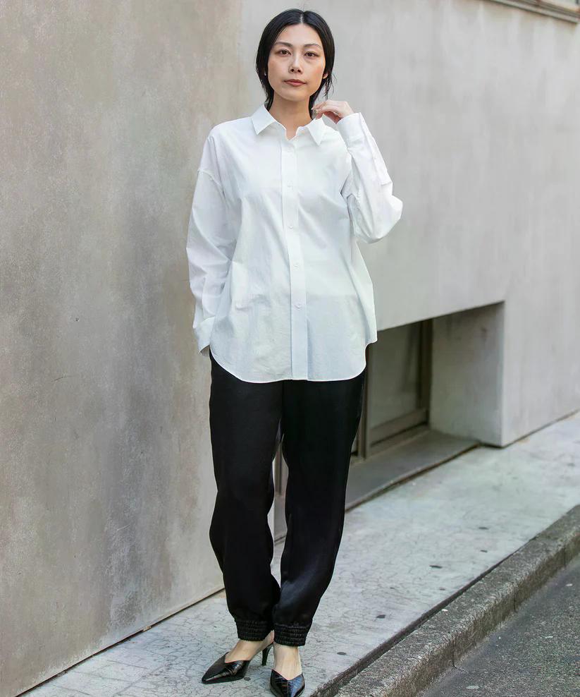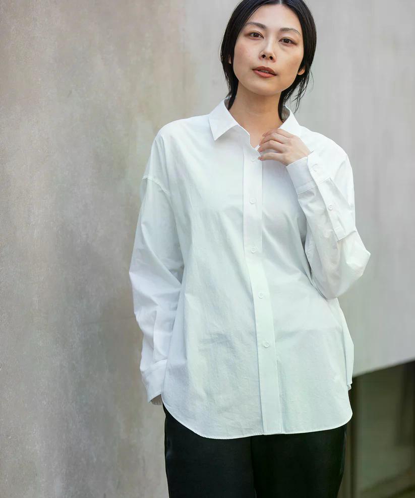 センターバック丈は77cmとやや長めの表記ですが、そのうち約6cmは立体感を出すための展開分量のため、実際の着用感は約71cm。長すぎず、バランスの取りやすいオーソドックスなシャツ丈に仕上がっています。
