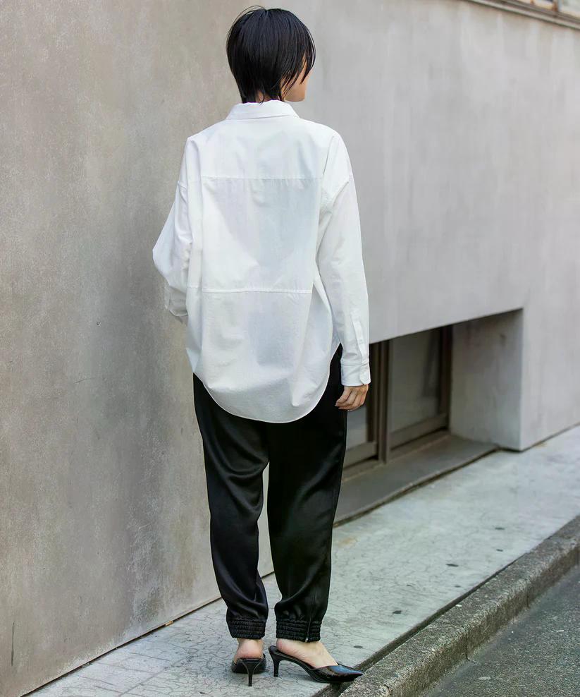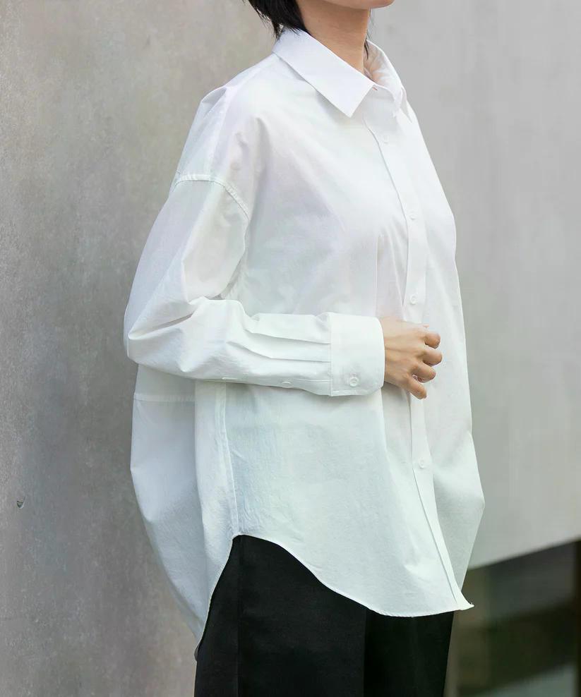 後ろ身頃にたっぷりと分量を取った立体パターンで、丸みのある女性らしいバックスタイルを叶えるレギュラーカラーシャツ。
