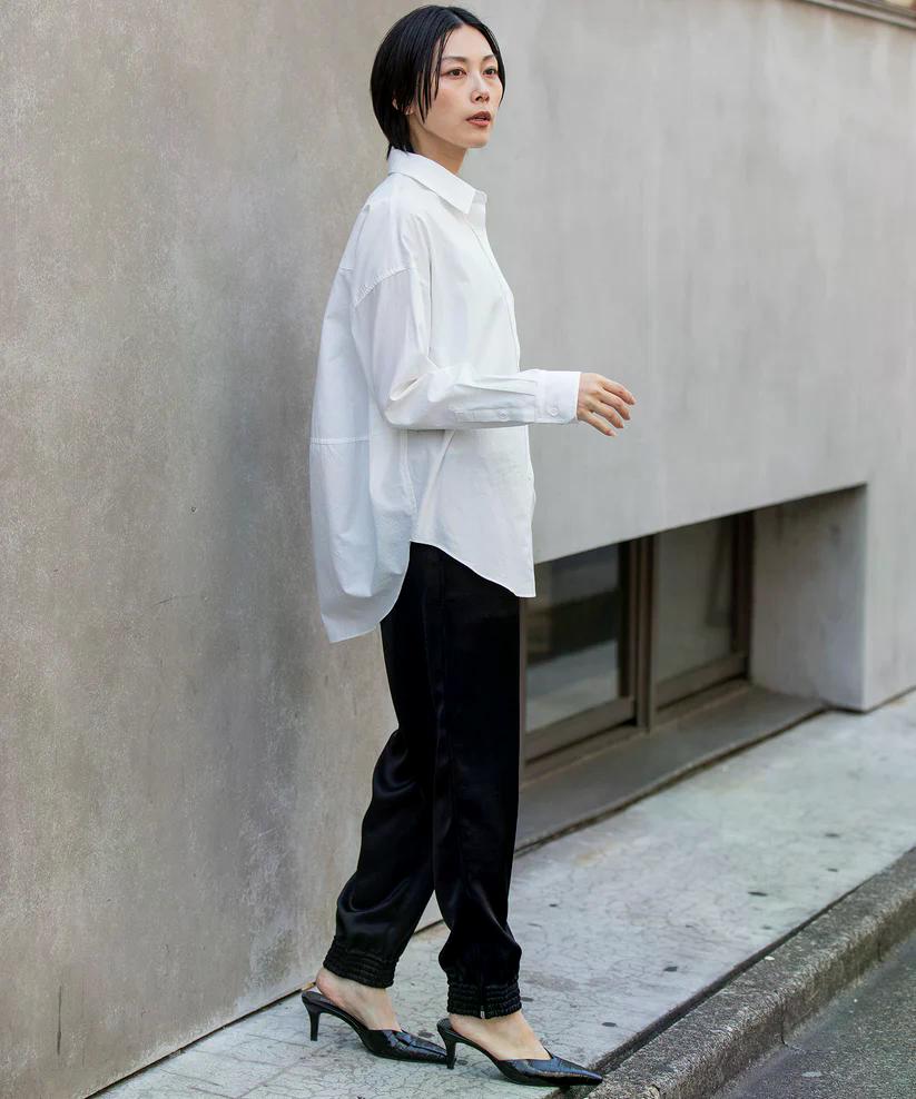 少し襟を抜いて着ると、背中のボリューム感がより際立ち、こなれた印象に。