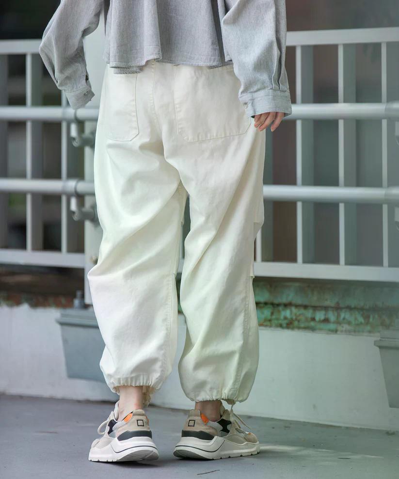 ウエストはゴム+ドロスト仕様で、穿き心地はイージーながらシルエット調整も自在。