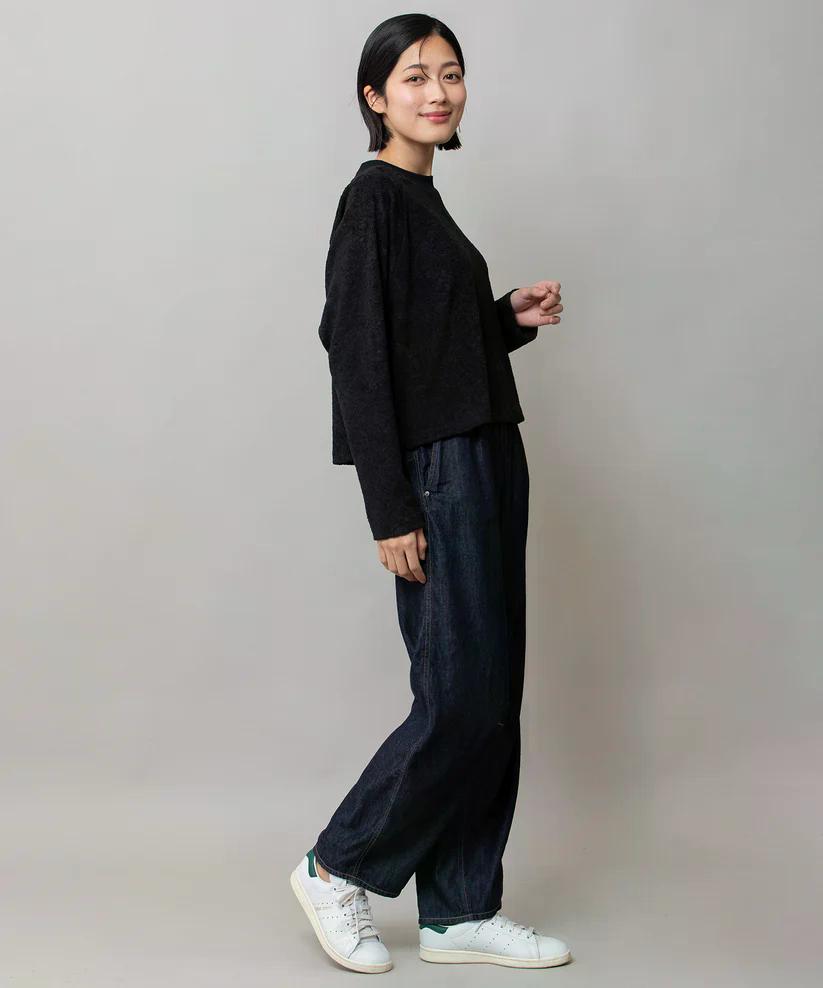 衿ぐりとガゼット部分には伸縮性のあるテレコ素材を使用し、快適な着心地とカジュアルなアクセントをプラス。