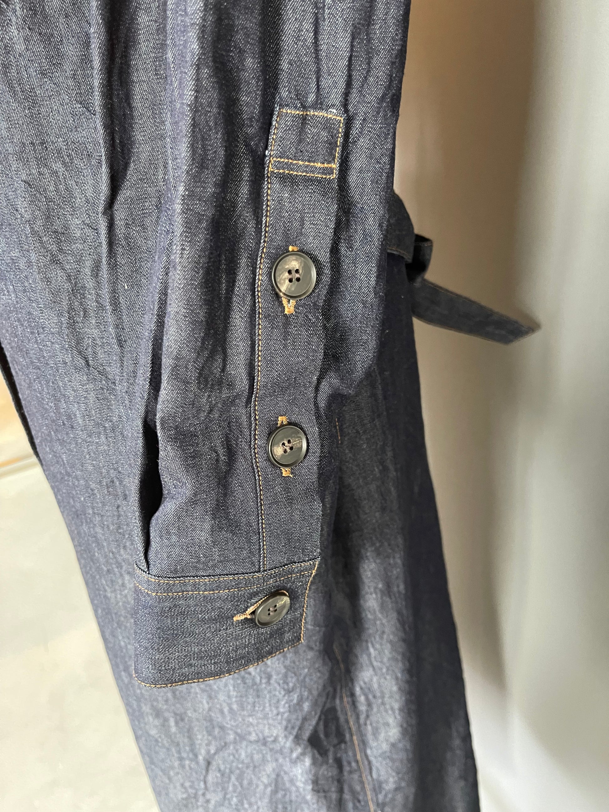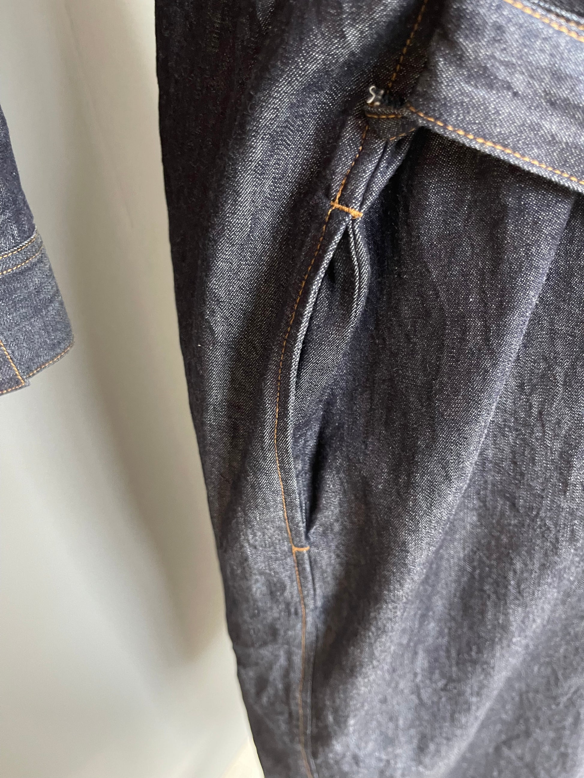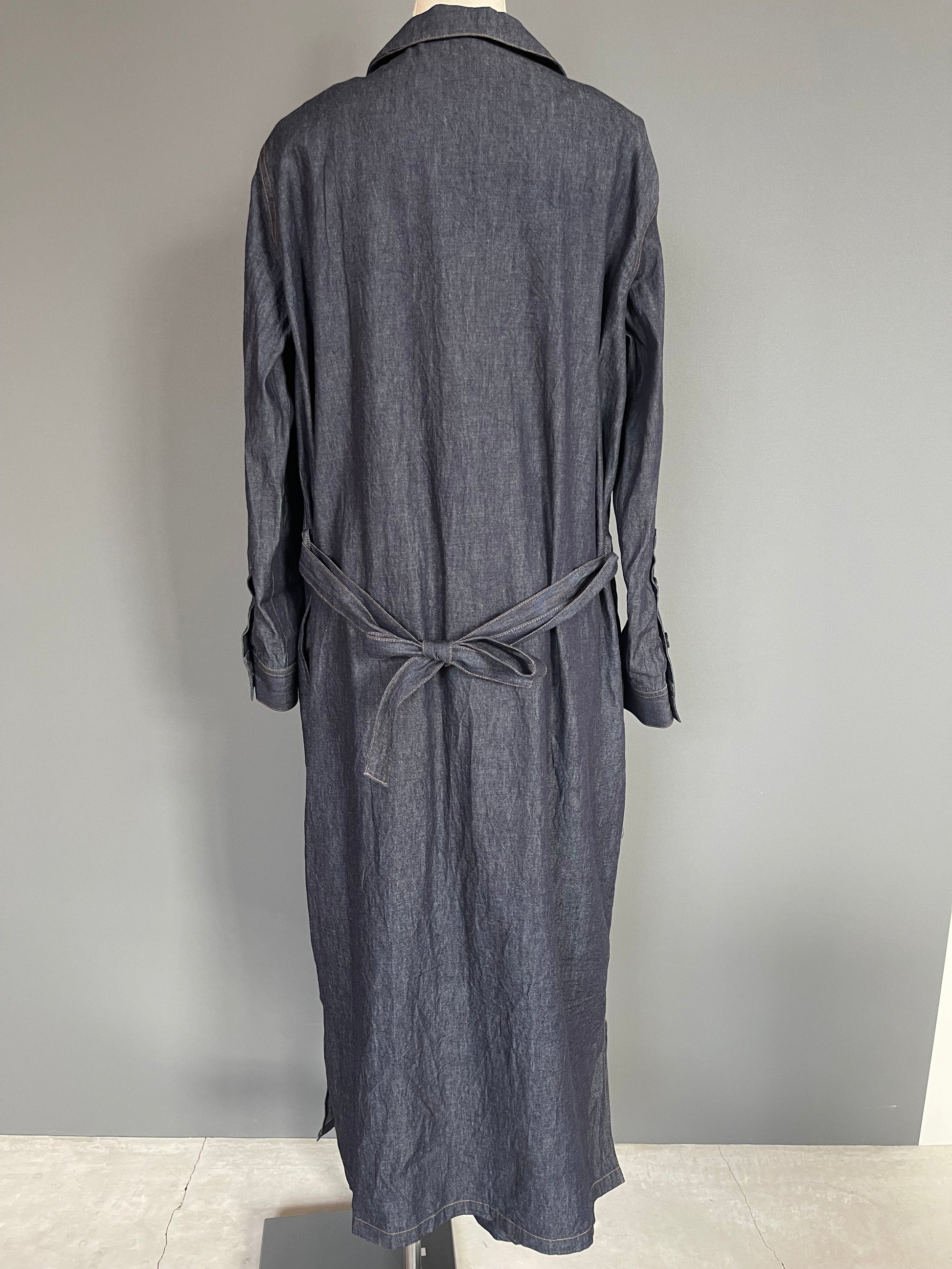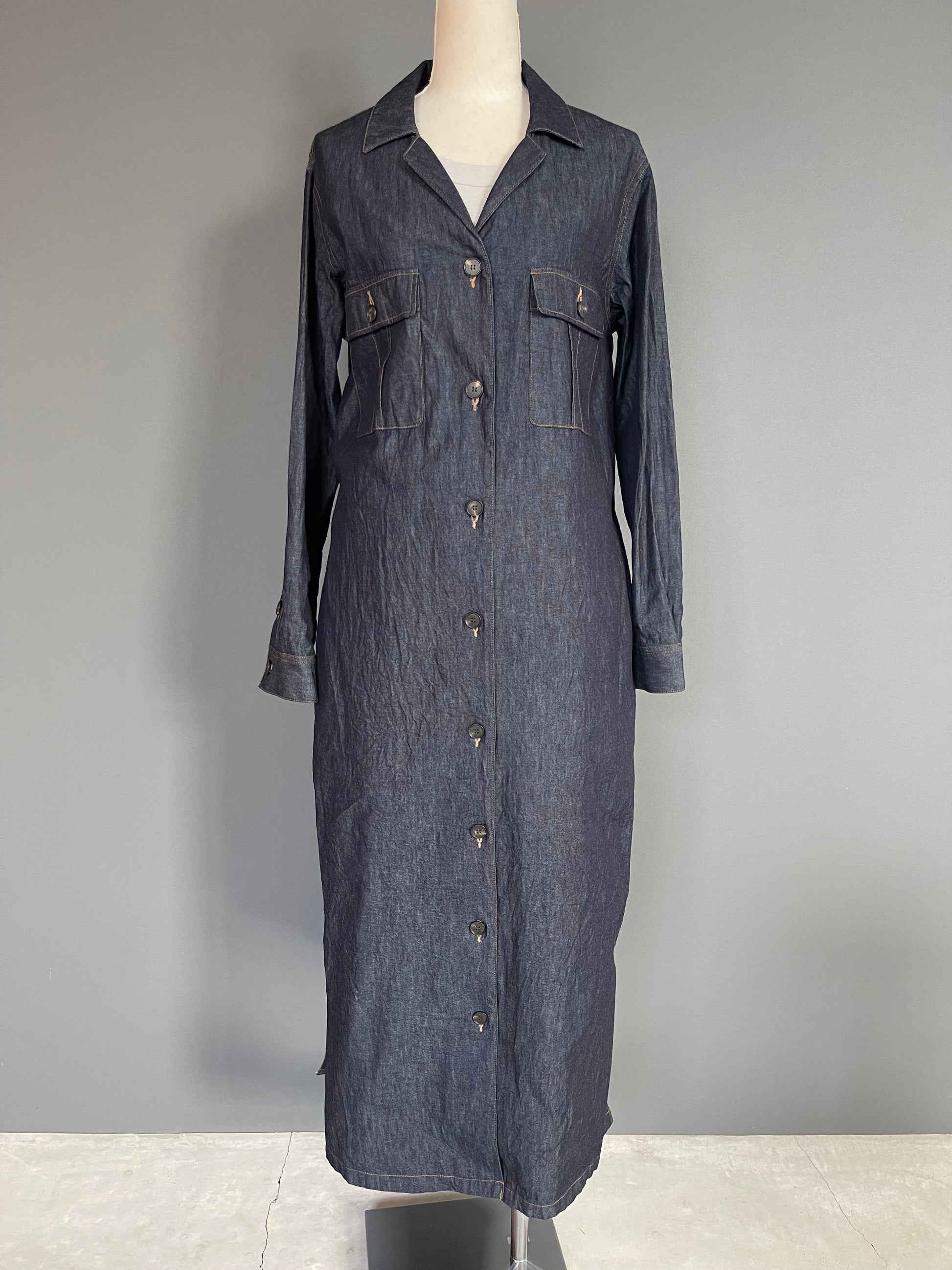 ワークシャツをベースにナローなオープンカラーや大きめのボタン使いでアレンジを加えてレディーな雰囲気なスラブデニムシャツワンピース。