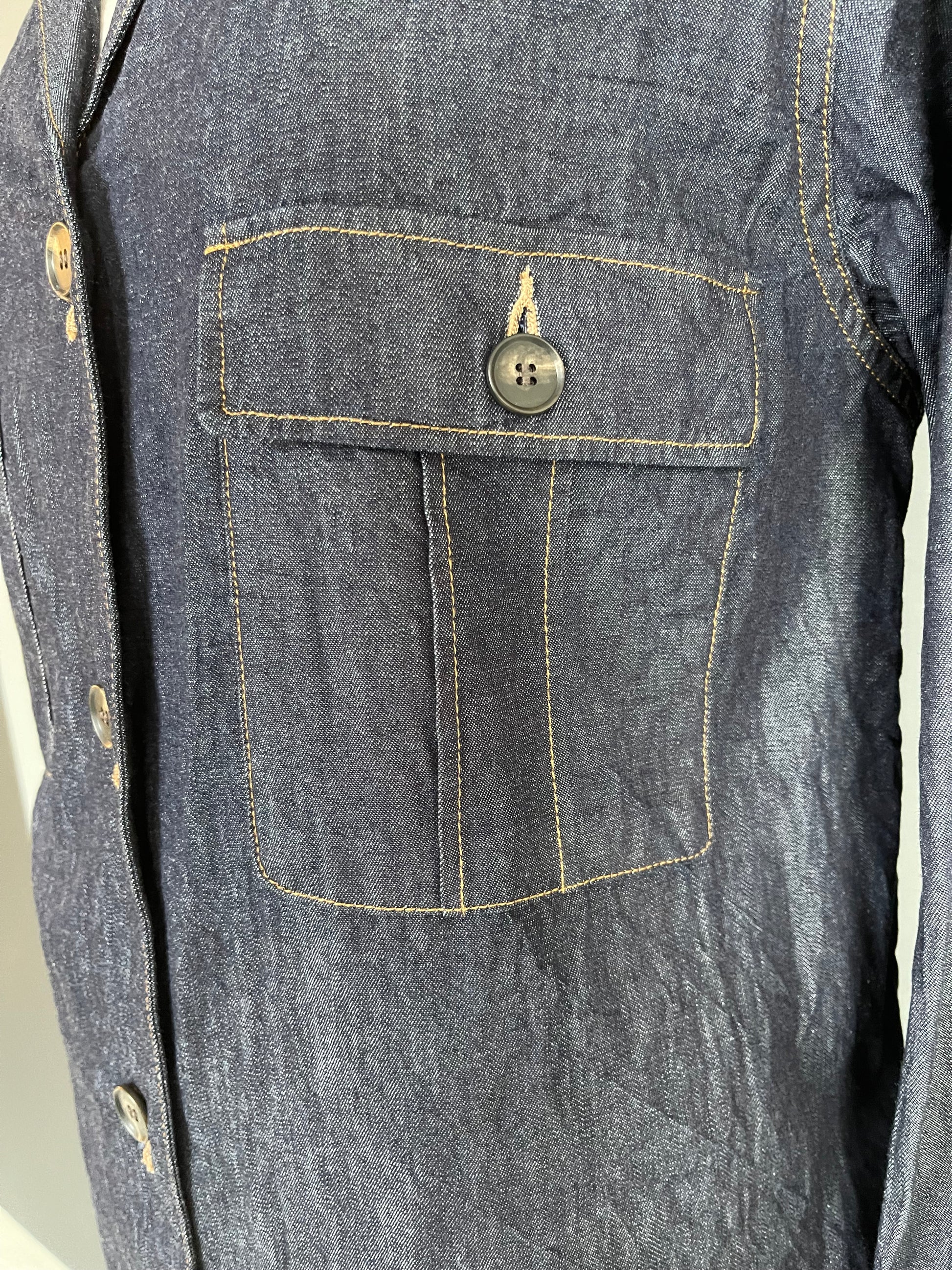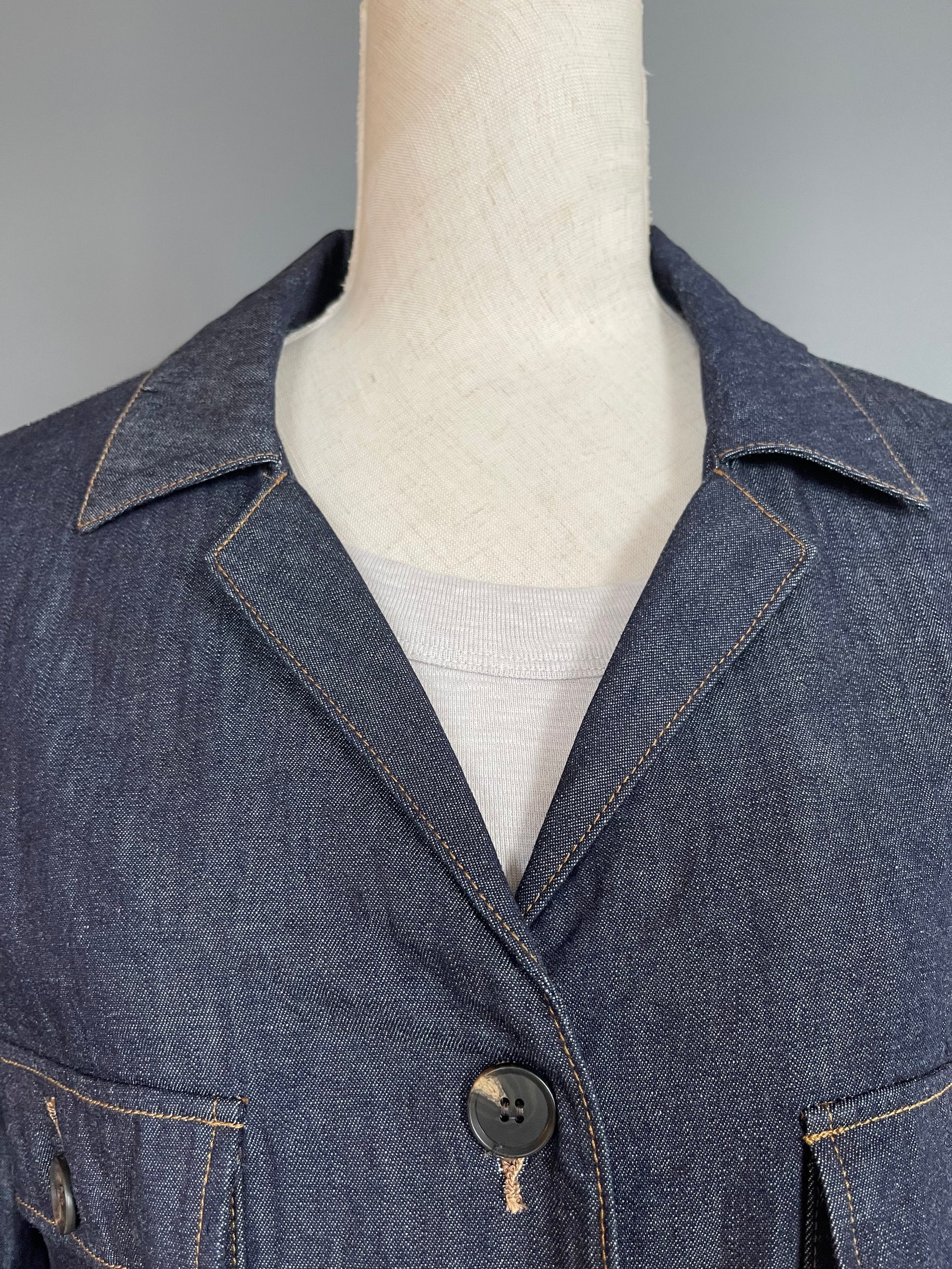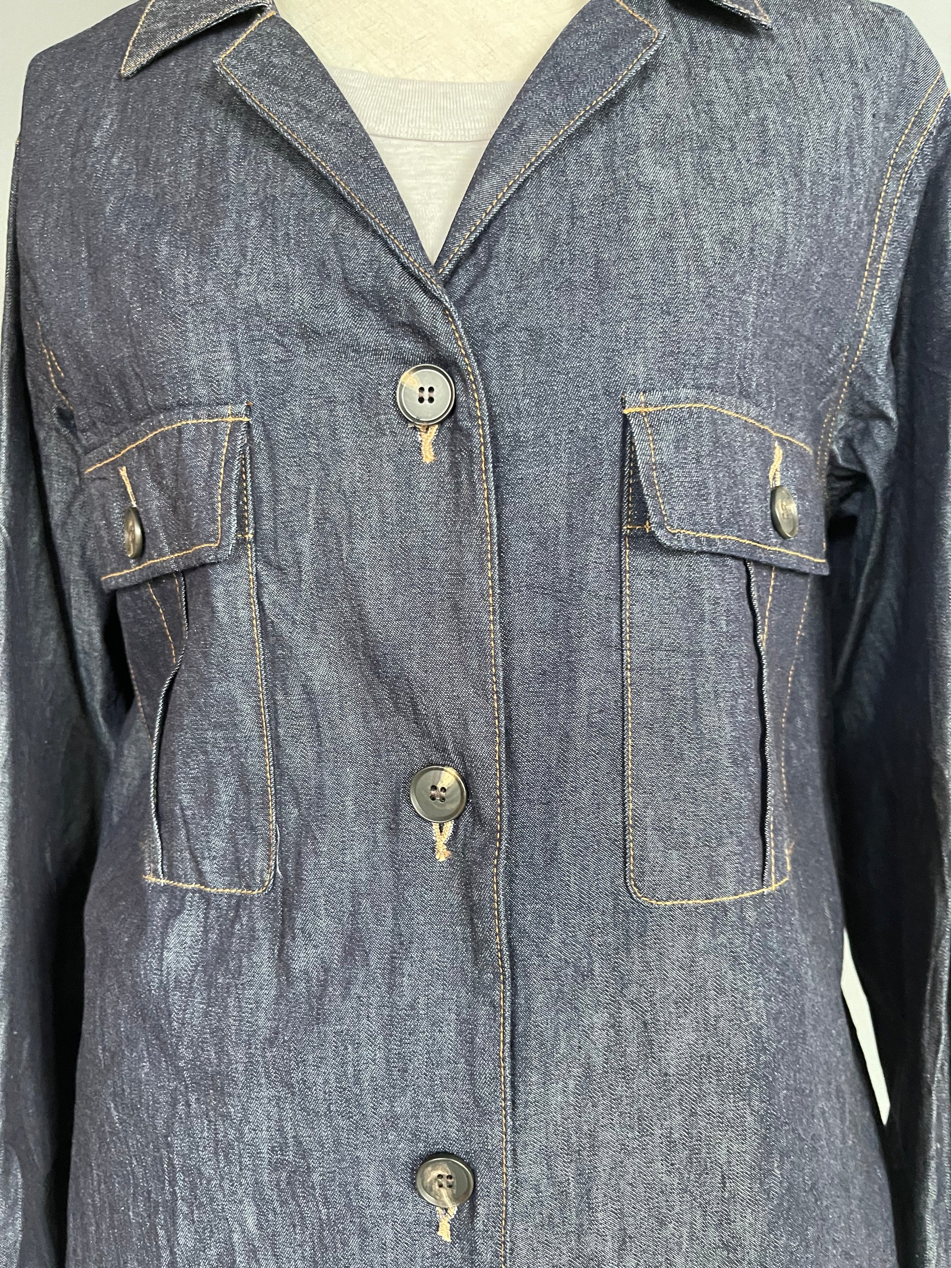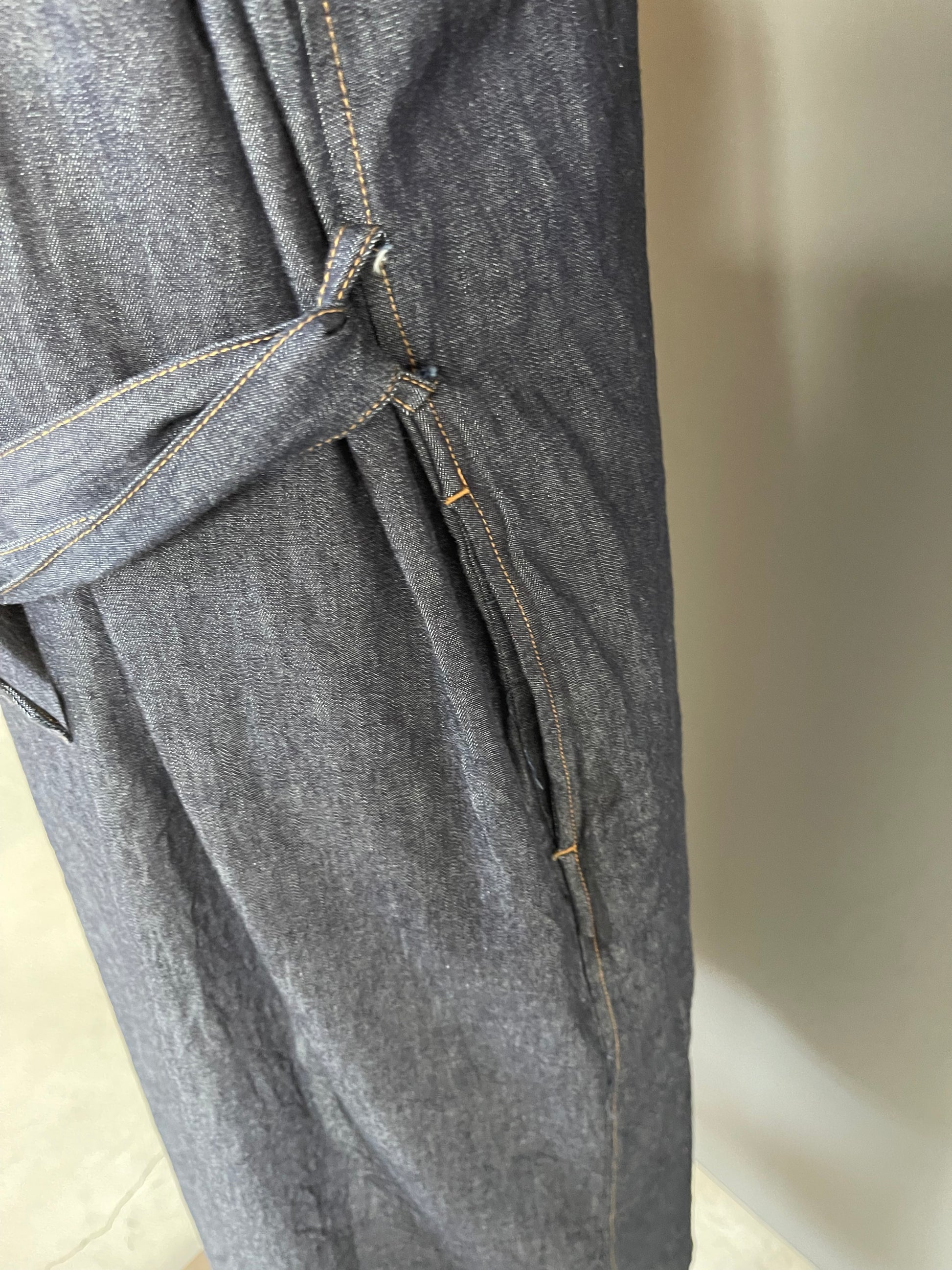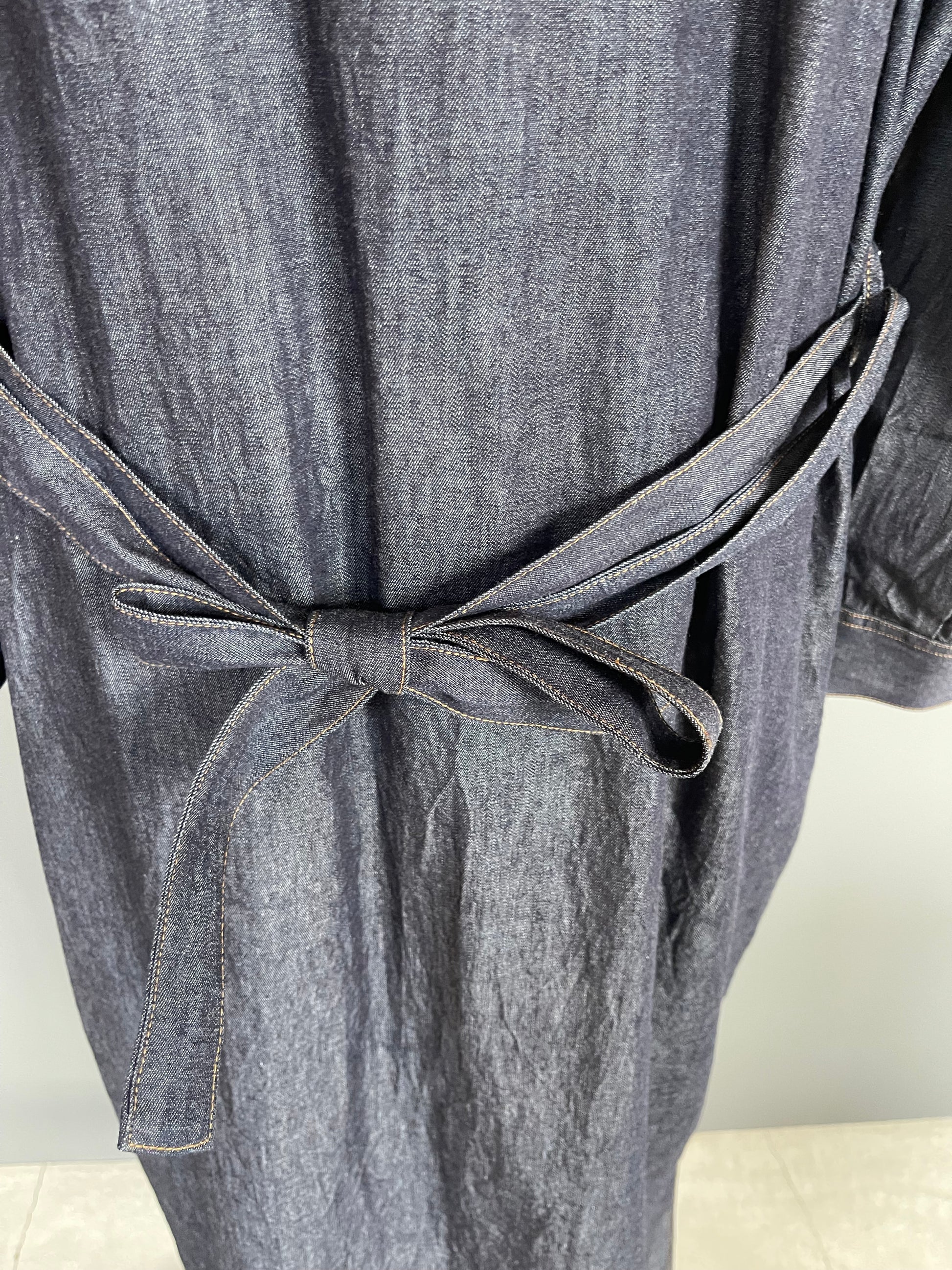 ワークシャツをベースにナローなオープンカラーや大きめのボタン使いでアレンジを加えてレディーな雰囲気なスラブデニムシャツワンピース。