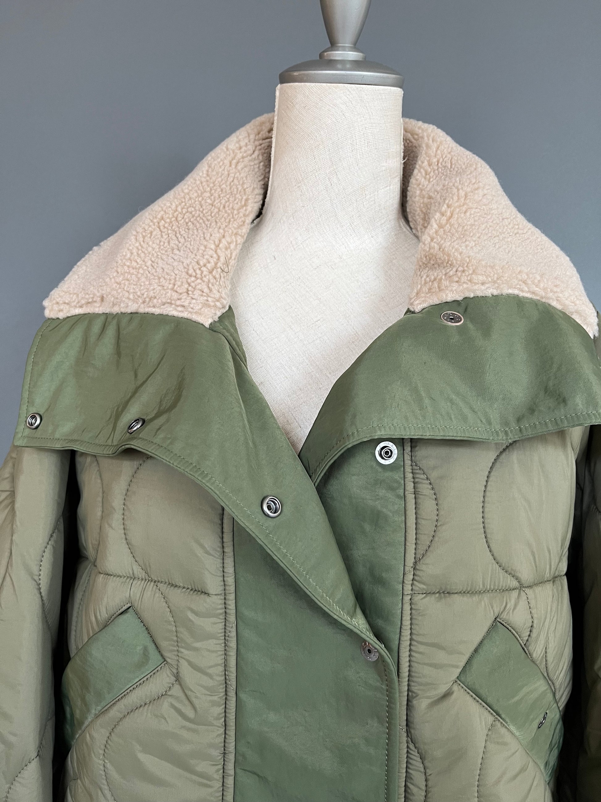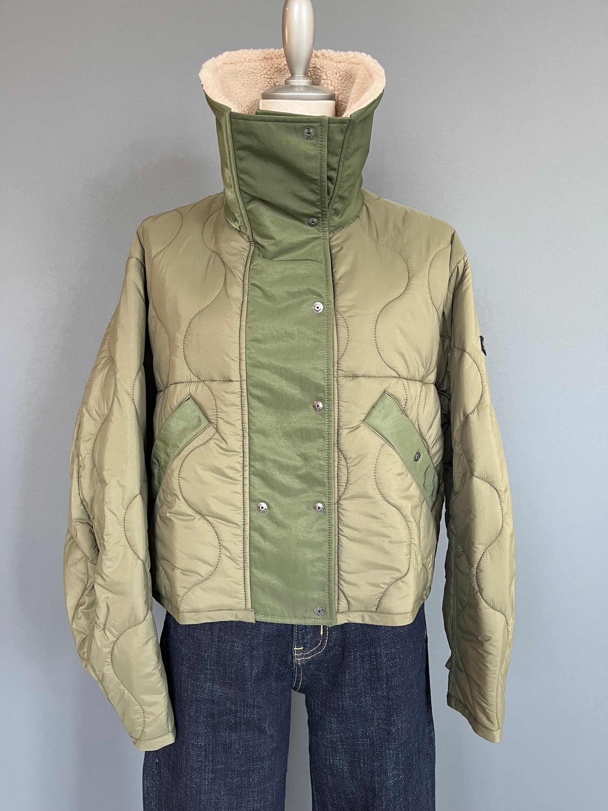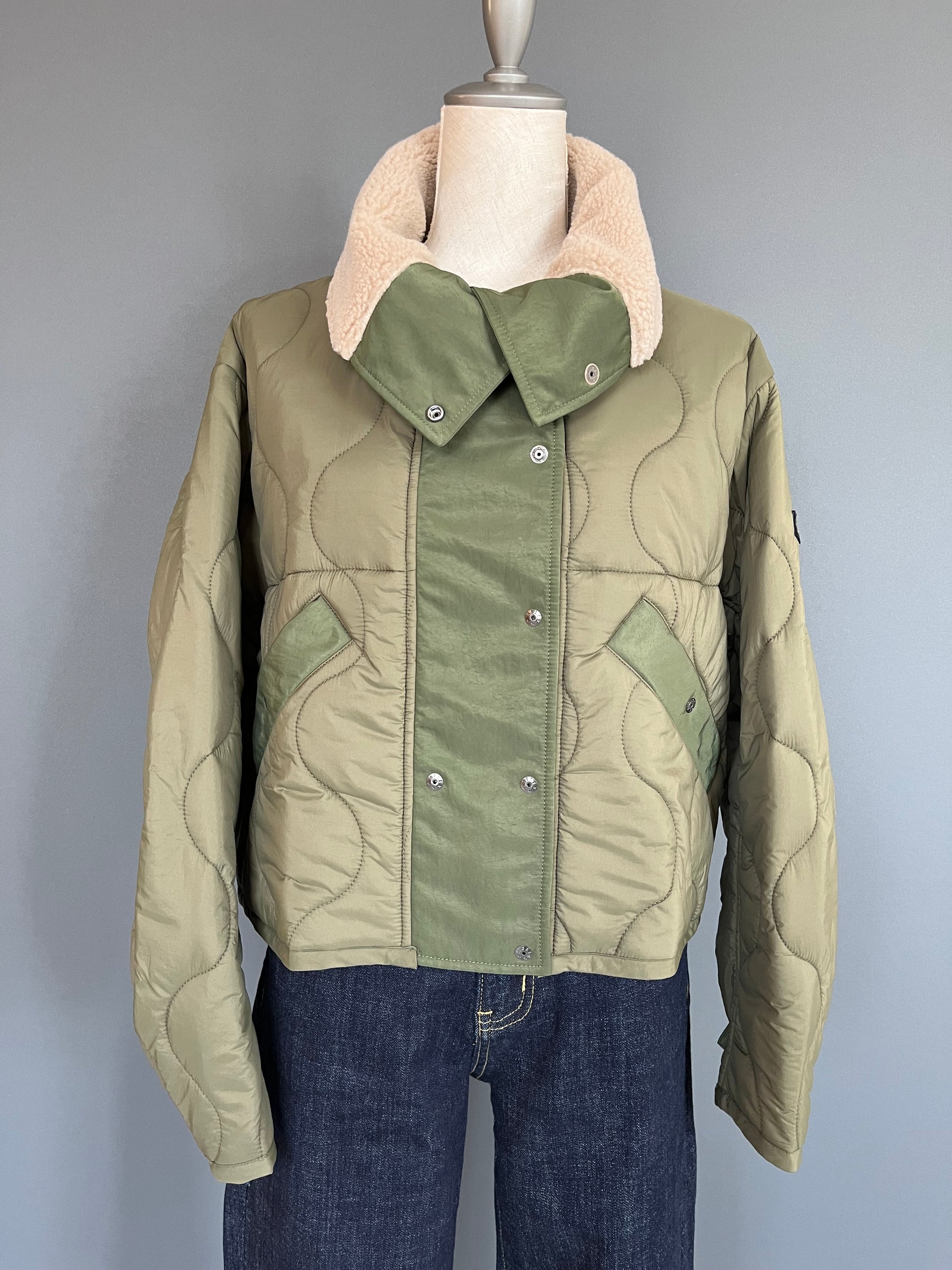 クロップド丈の中綿キルティングショートコート。衿に肌触りのいいボアを使用し、クロップド丈なのでボリューミーなボトムとも好相性なアイテムです。