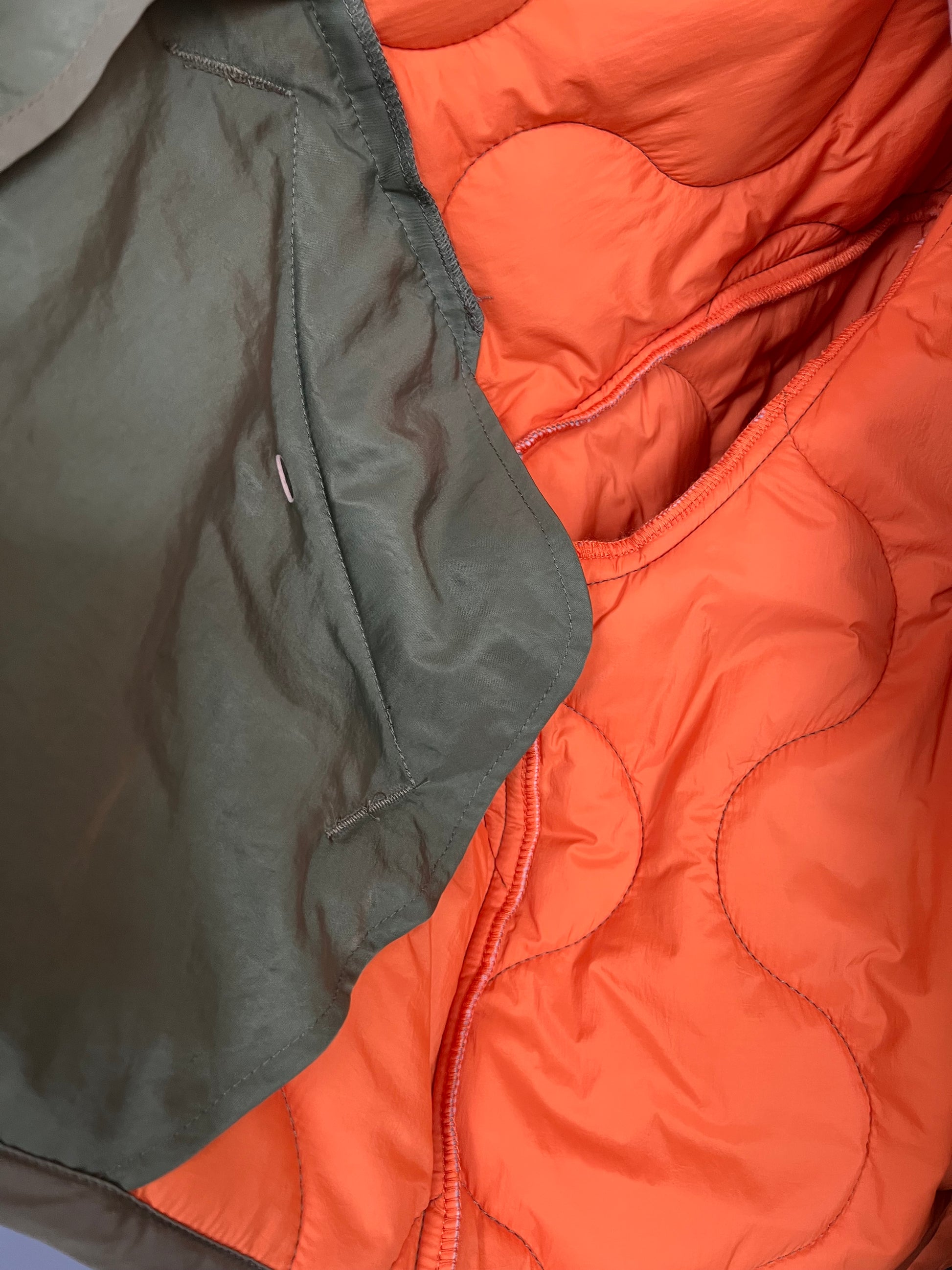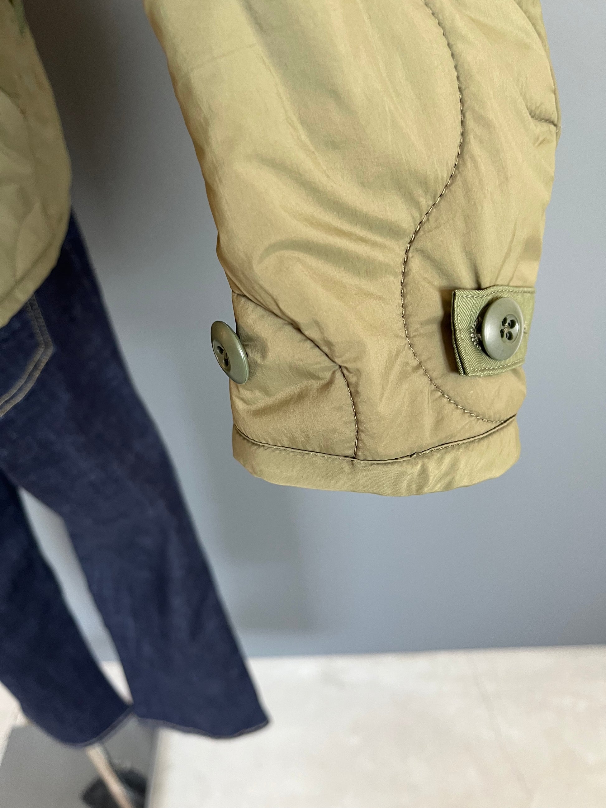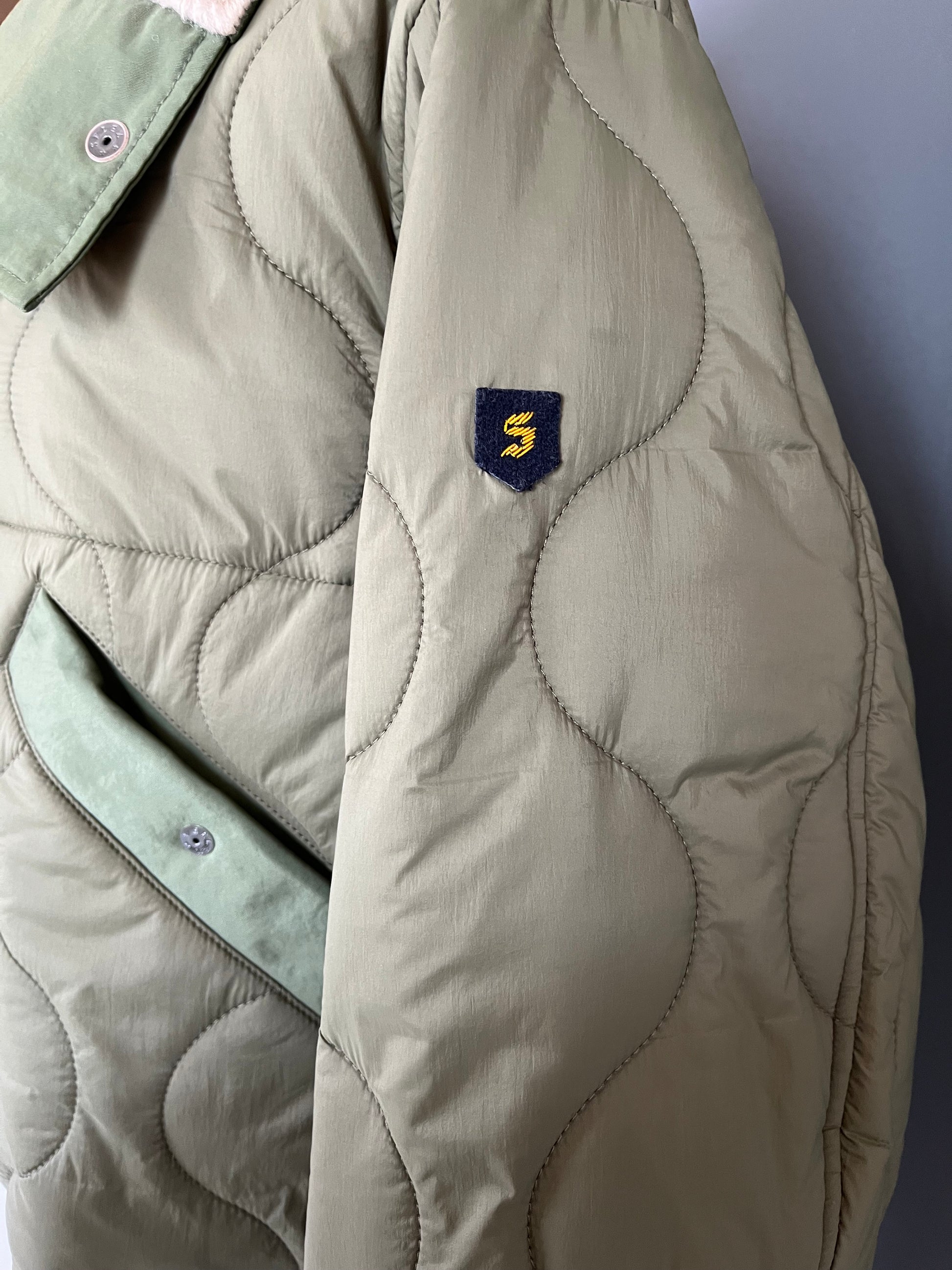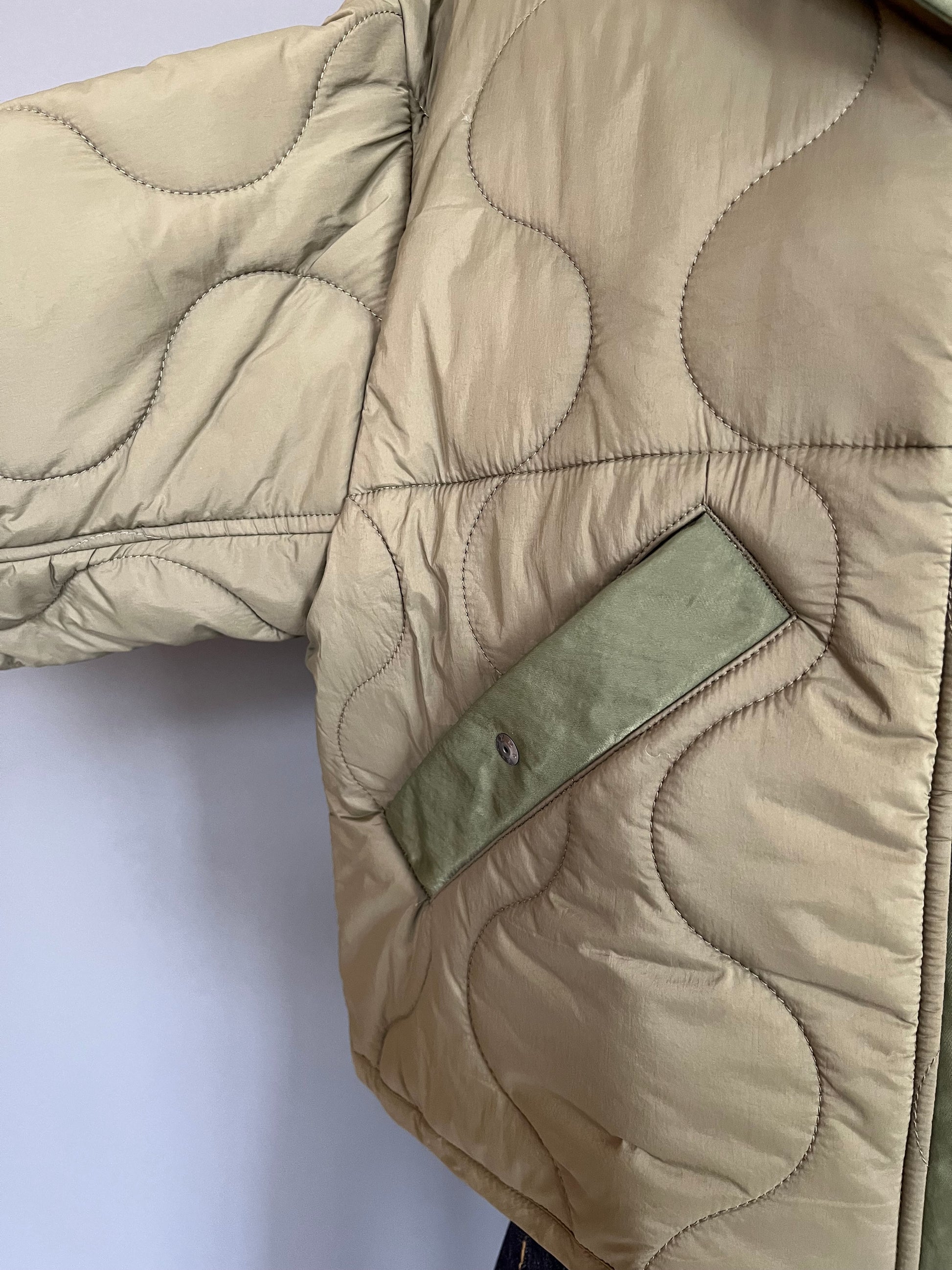 クロップド丈の中綿キルティングショートコート。衿に肌触りのいいボアを使用し、クロップド丈なのでボリューミーなボトムとも好相性なアイテムです。