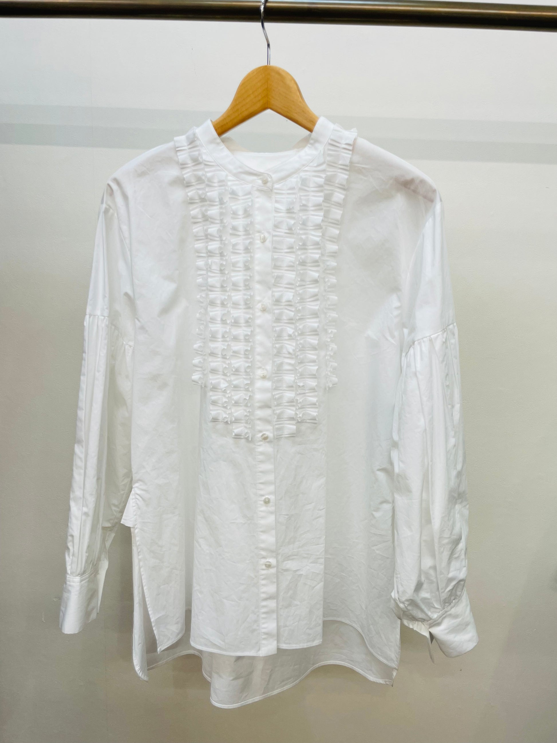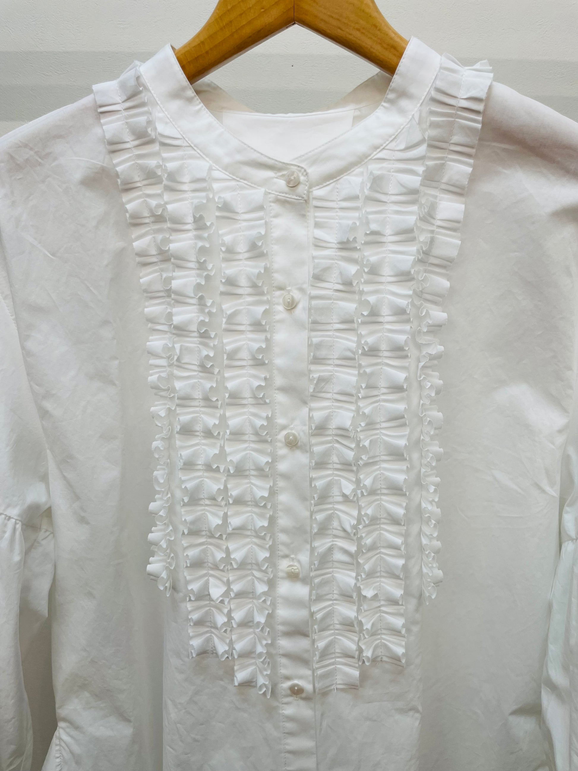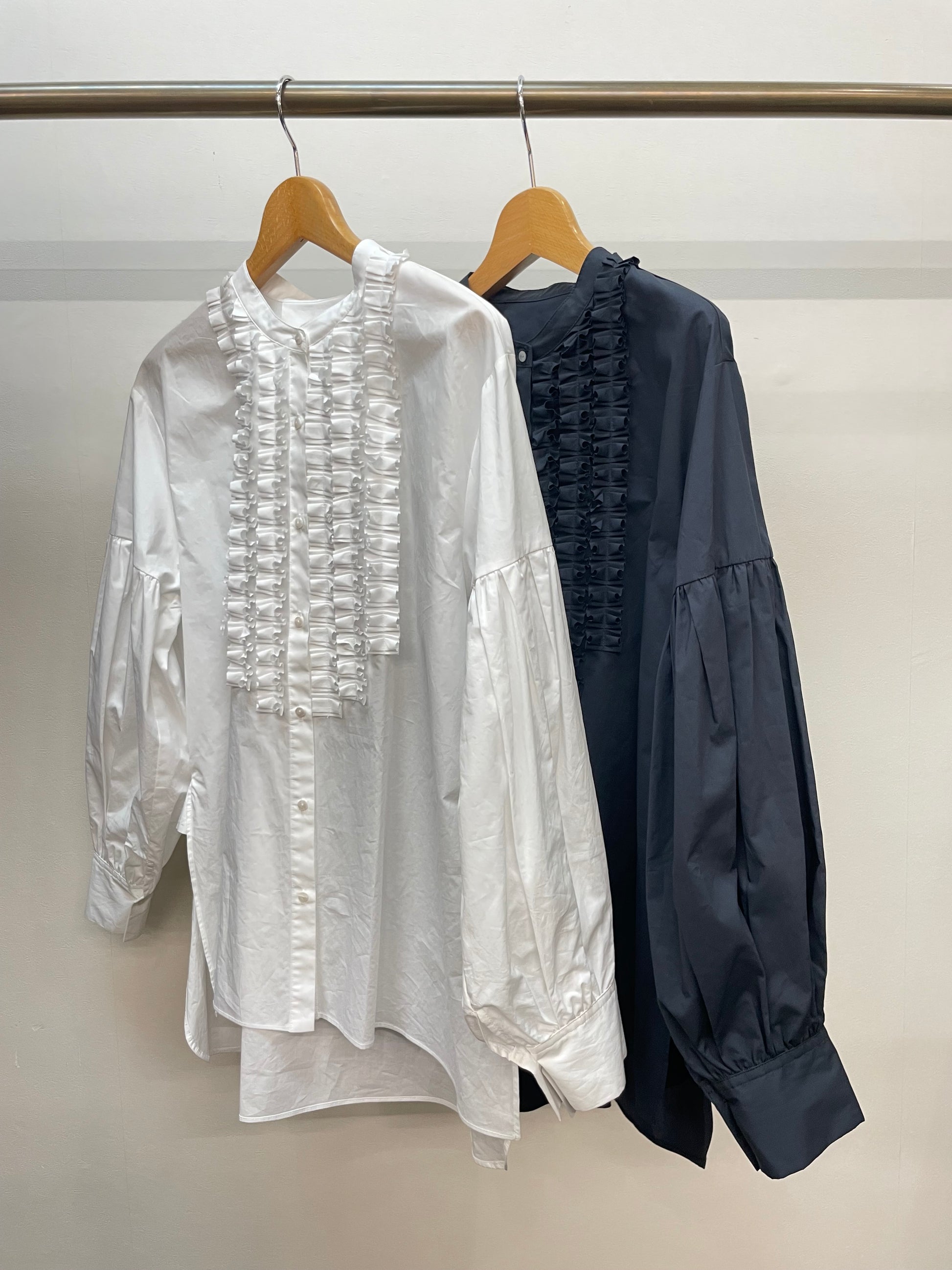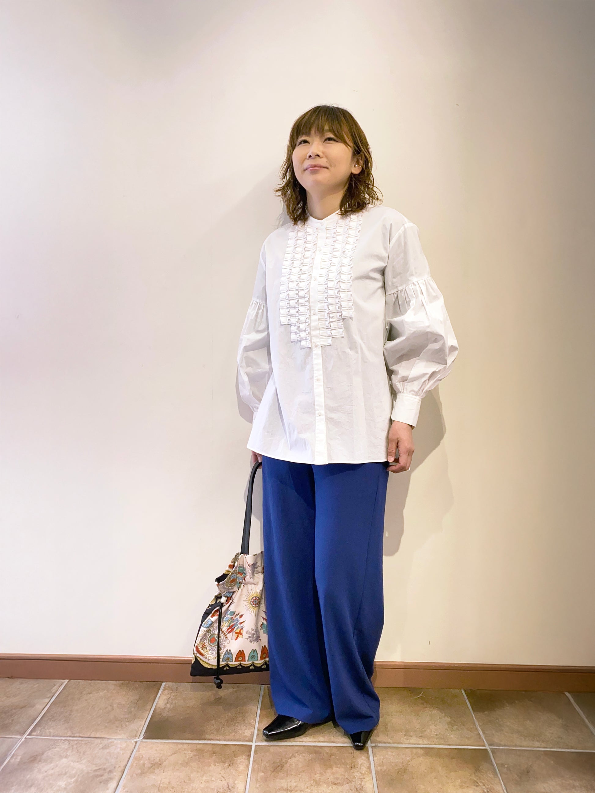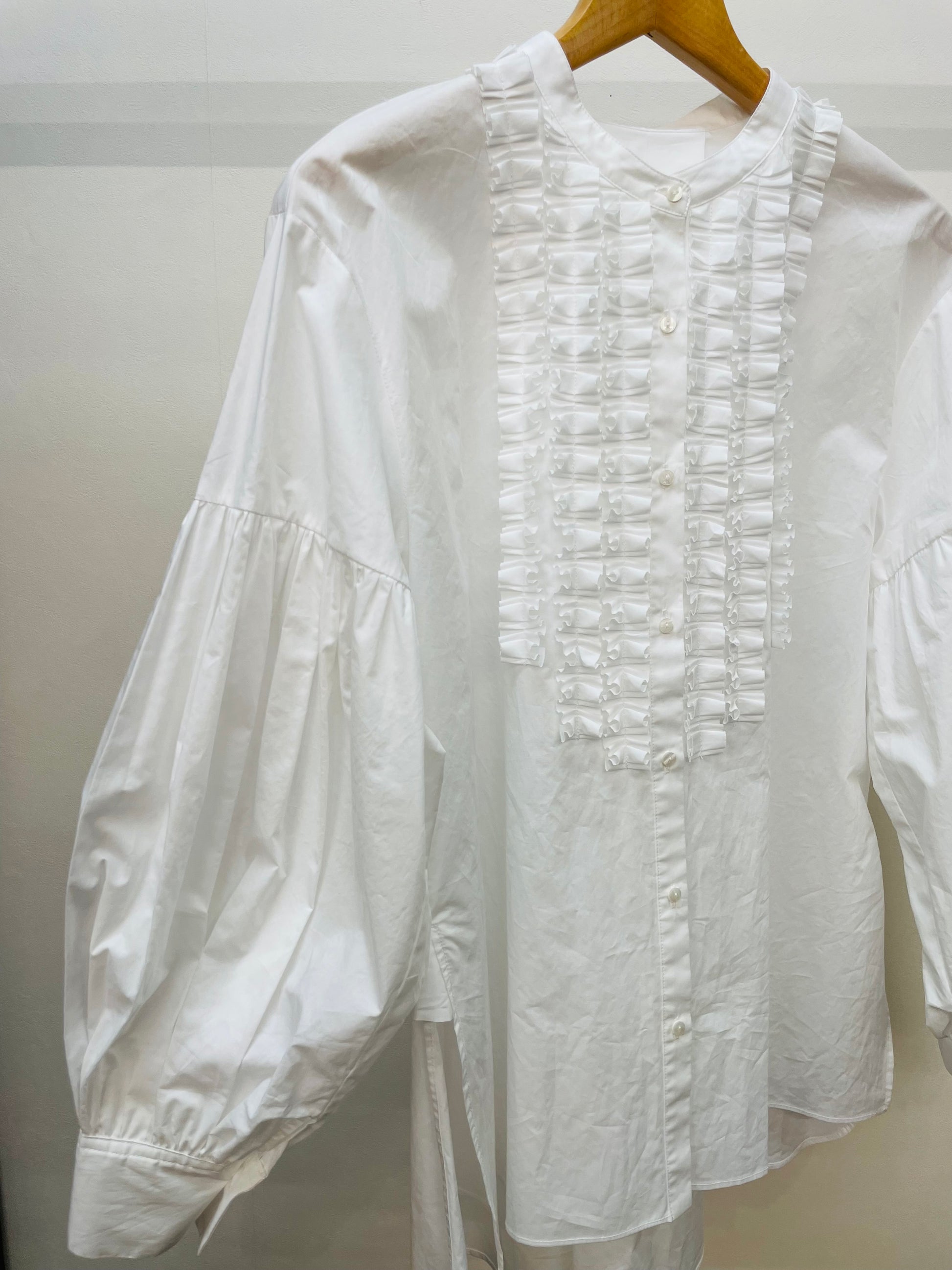 フロントのフリルとボリューム袖が大人可愛いブラウス。