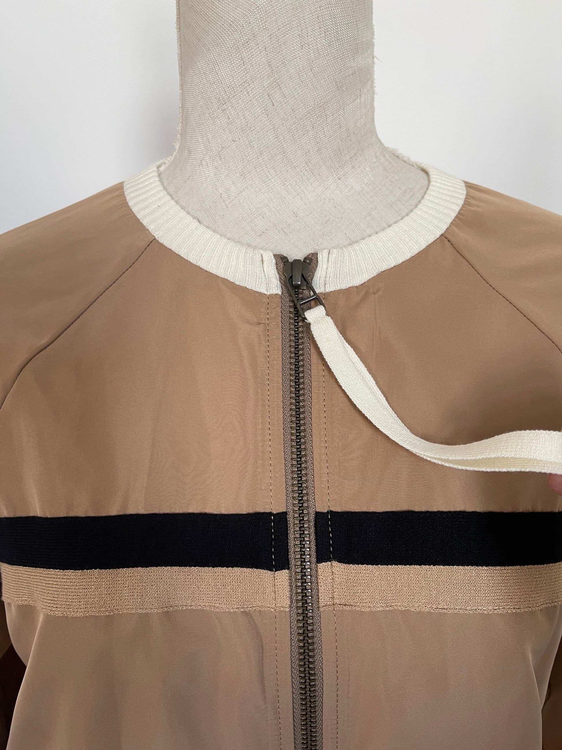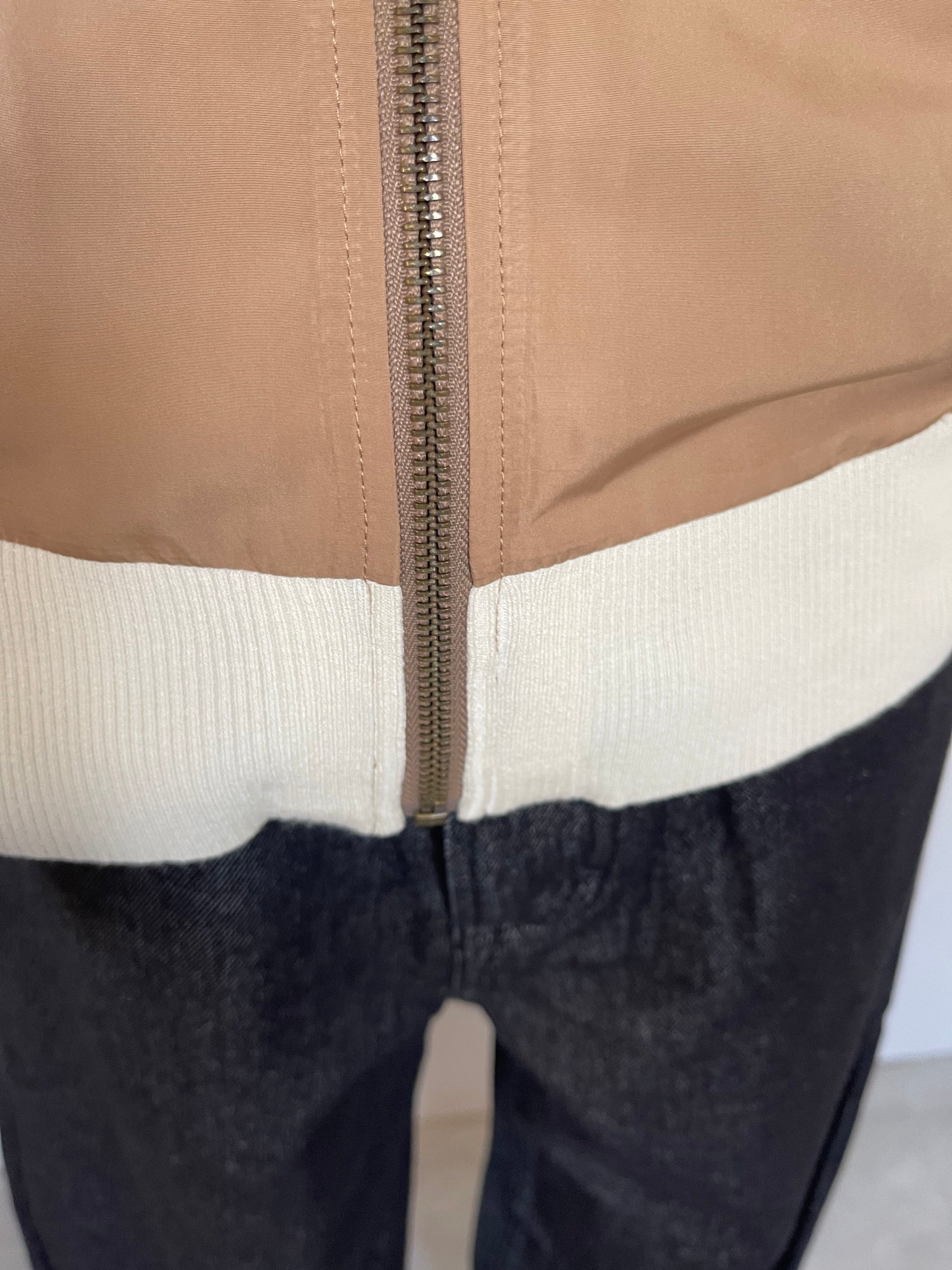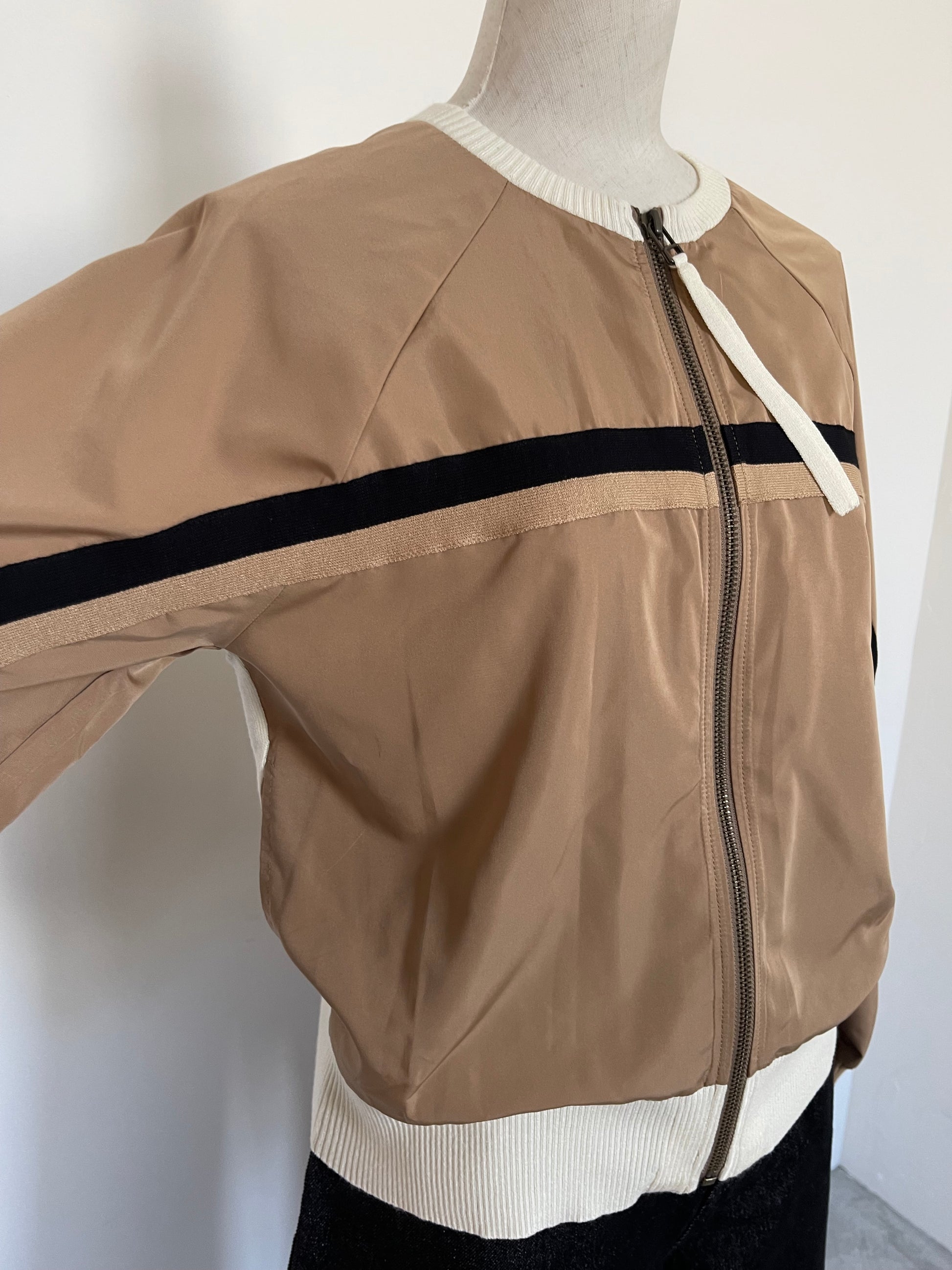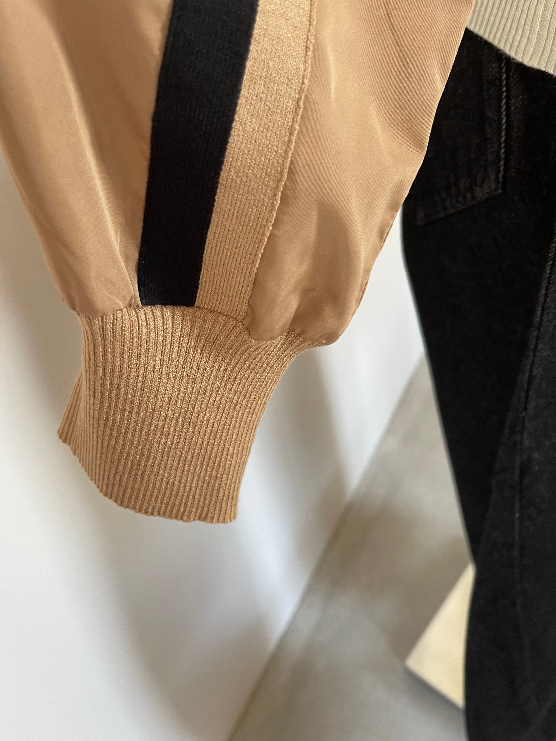 前身頃から袖迄が柔らかいポリエステル、後ろ身頃、衿ぐり、裾、袖口にニットをあしらった軽量ブルゾン。軽さと機能性、デザイン性を兼ね備えたブルゾンは季節の変わり目に特に重宝する一枚です。