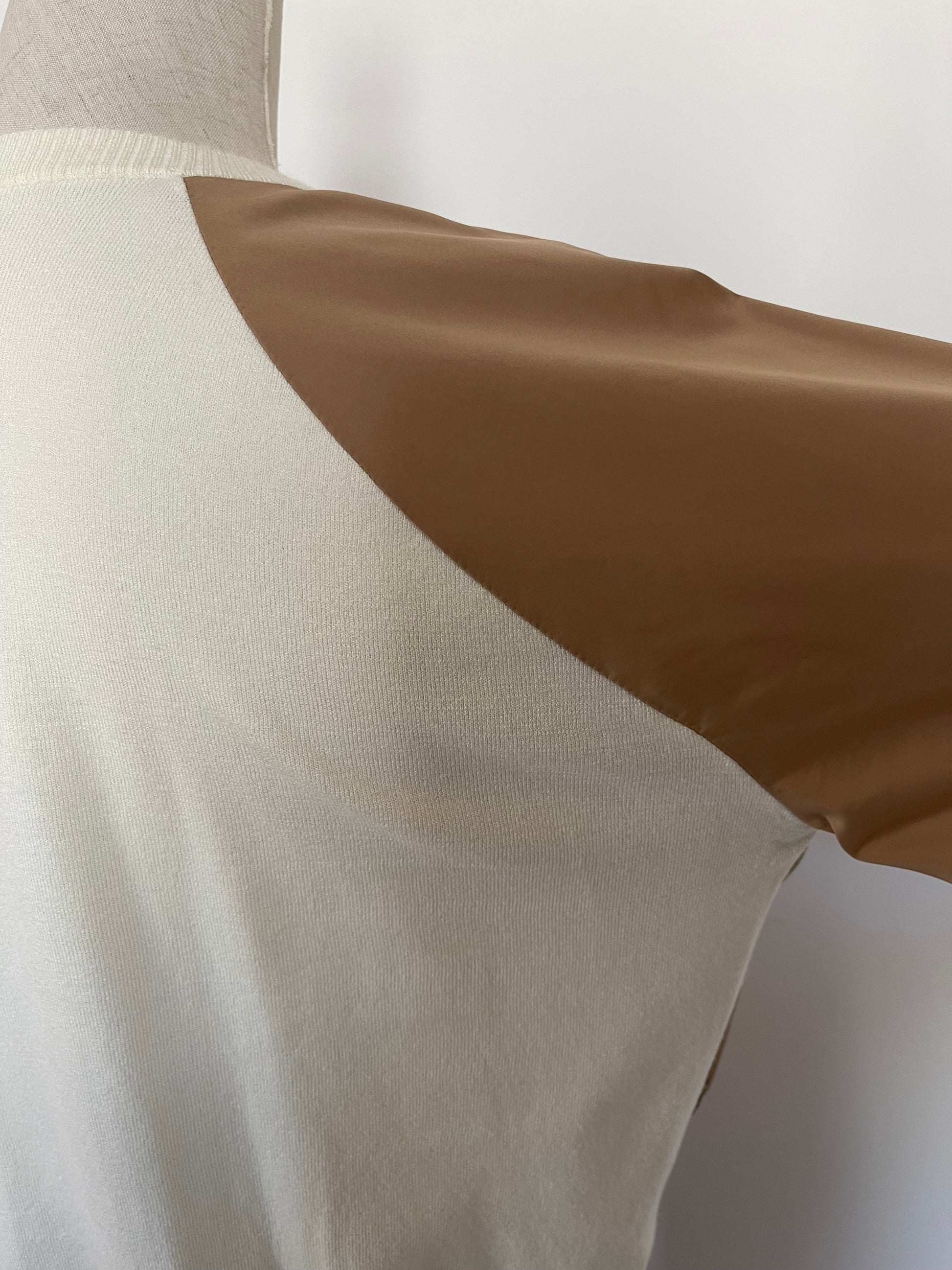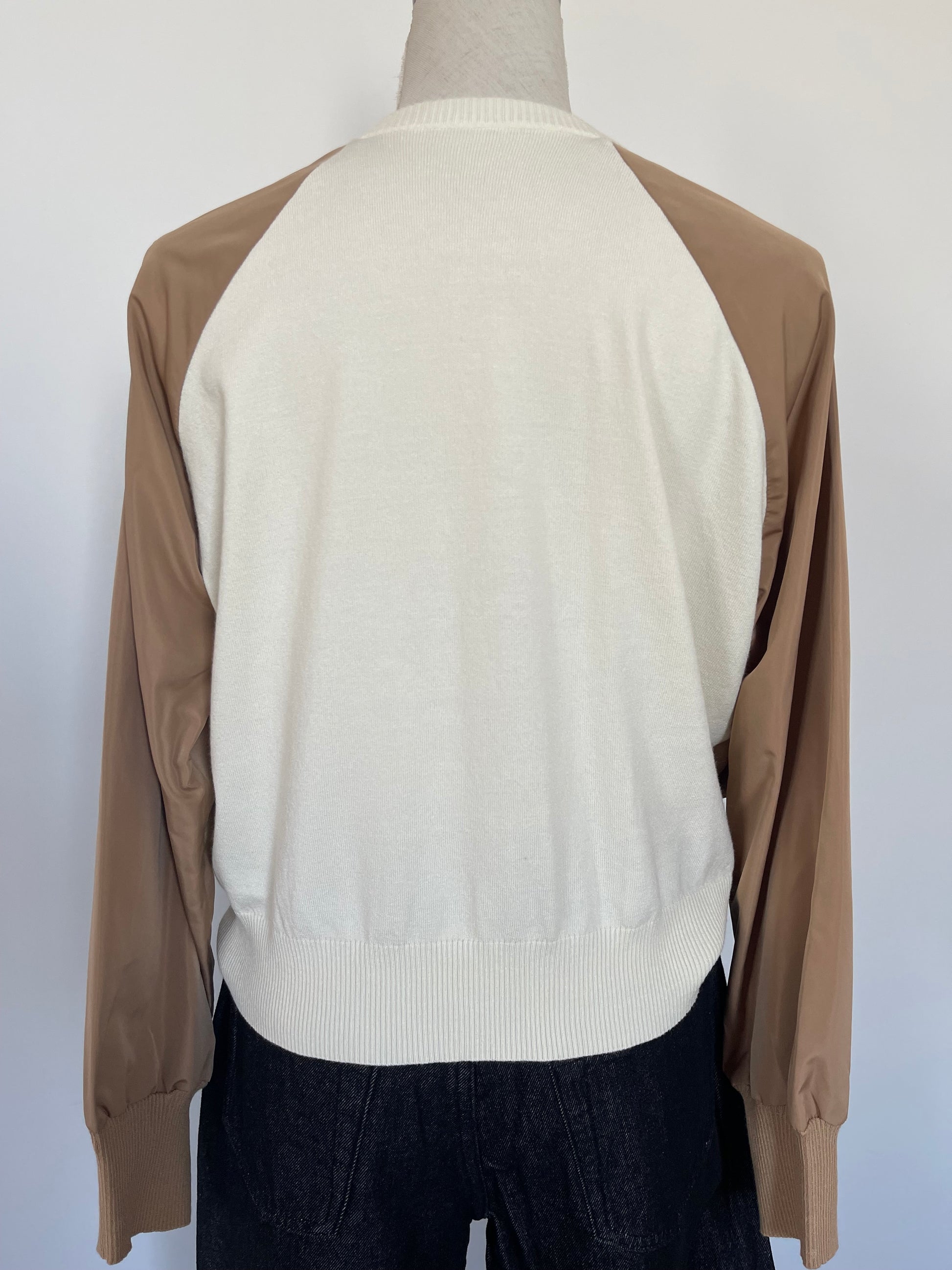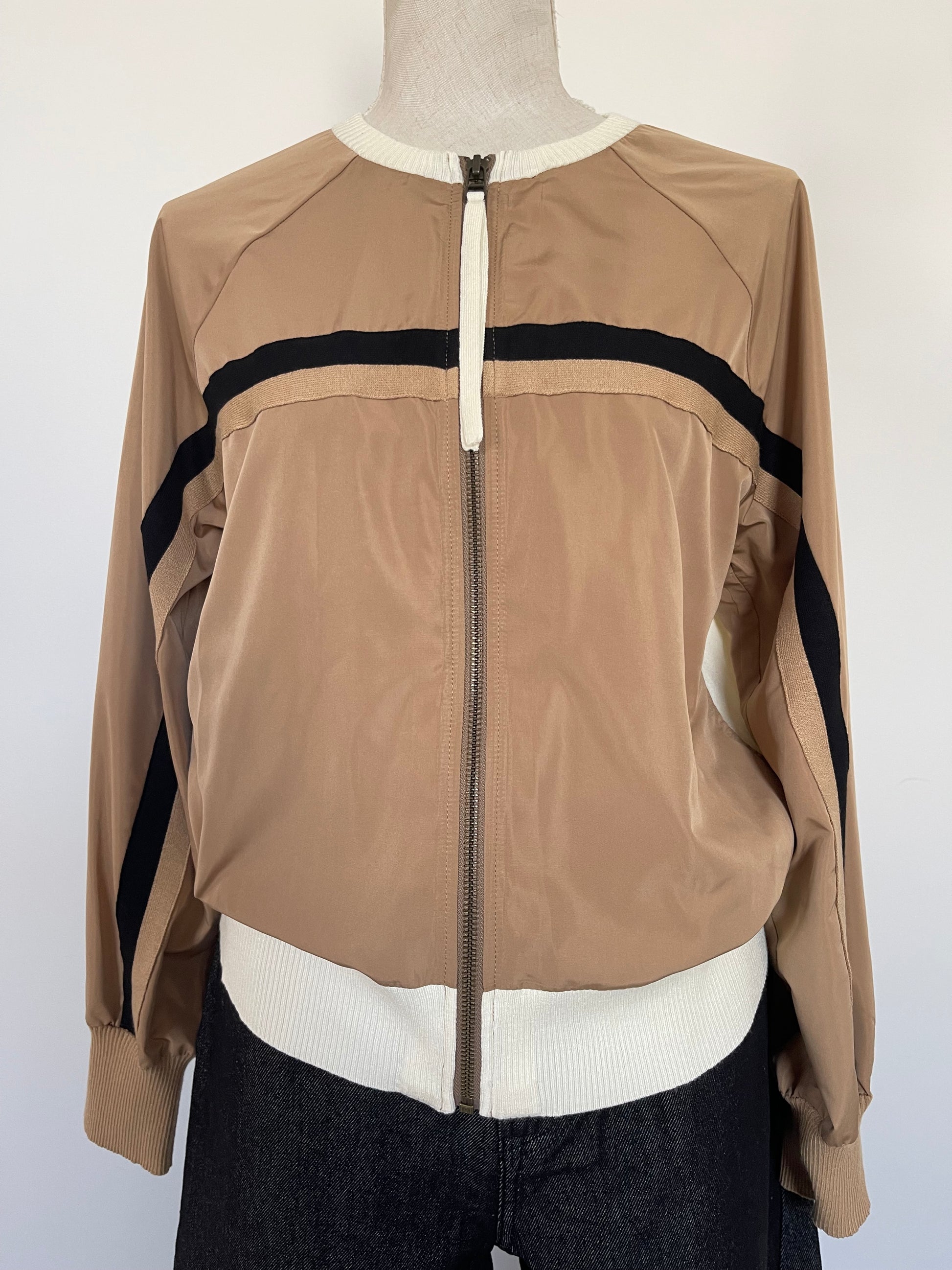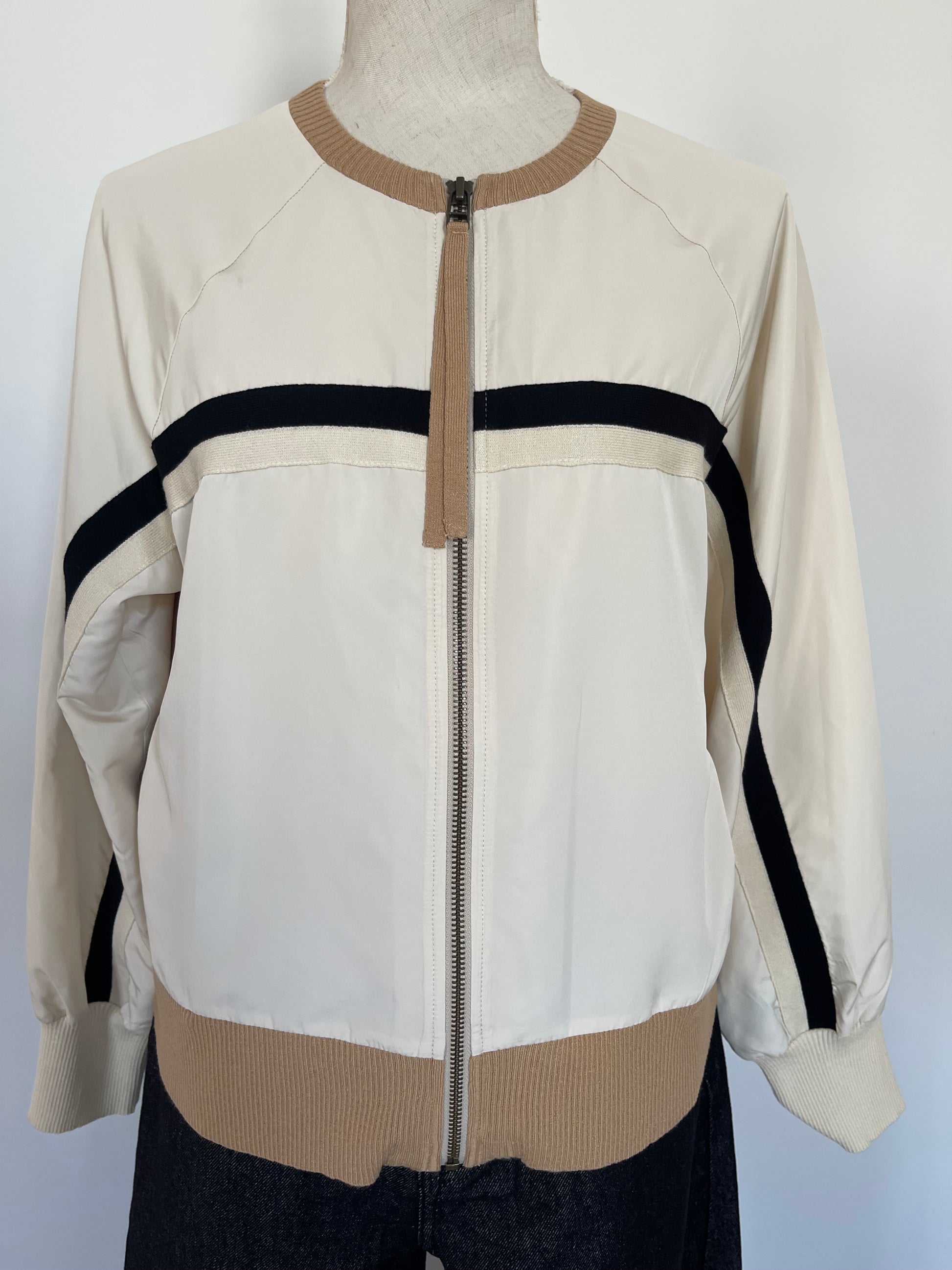 前身頃から袖迄が柔らかいポリエステル、後ろ身頃、衿ぐり、裾、袖口にニットをあしらった軽量ブルゾン。軽さと機能性、デザイン性を兼ね備えたブルゾンは季節の変わり目に特に重宝する一枚です。