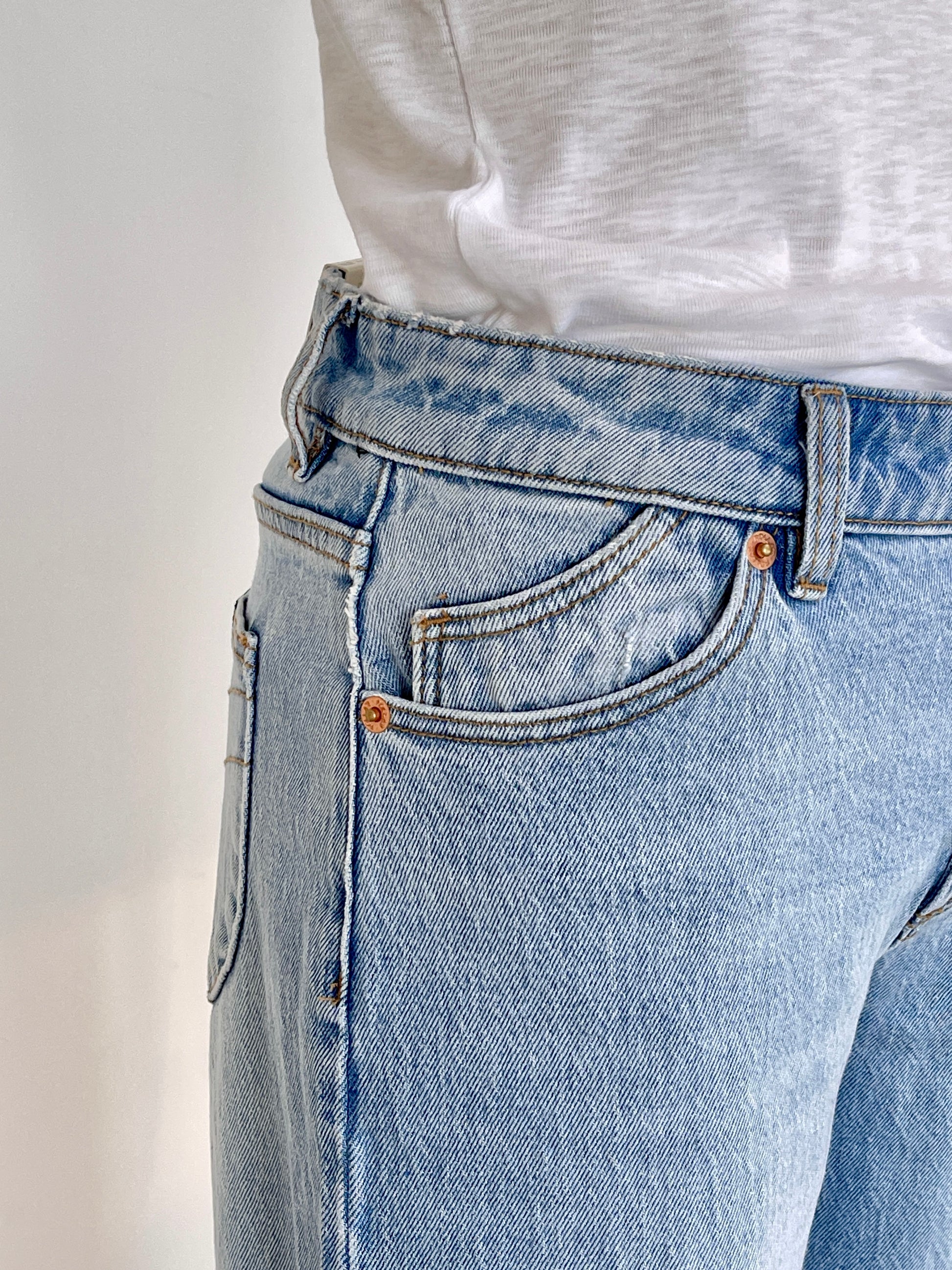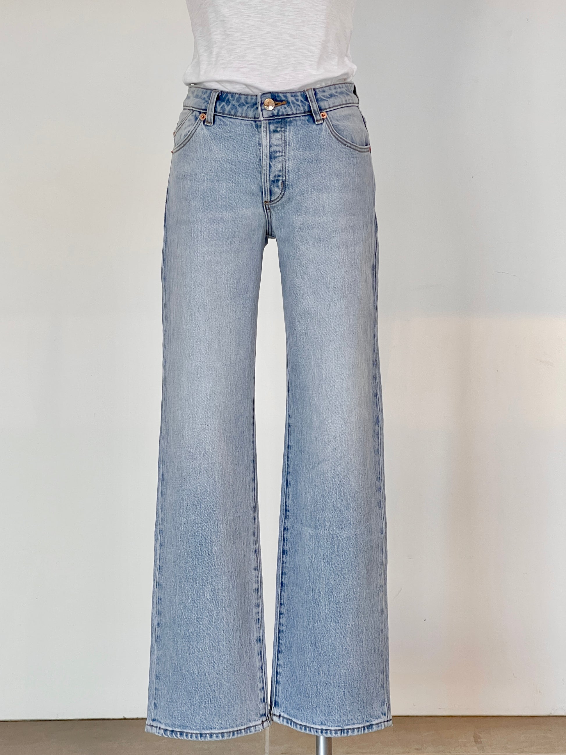 程よいゆとりのあるストレートライン。脚長効果、ウエスト周りをすっきりと見せてくれます。ユーズド感のあるブルーカラーと柔らかさで手放せない一本です。